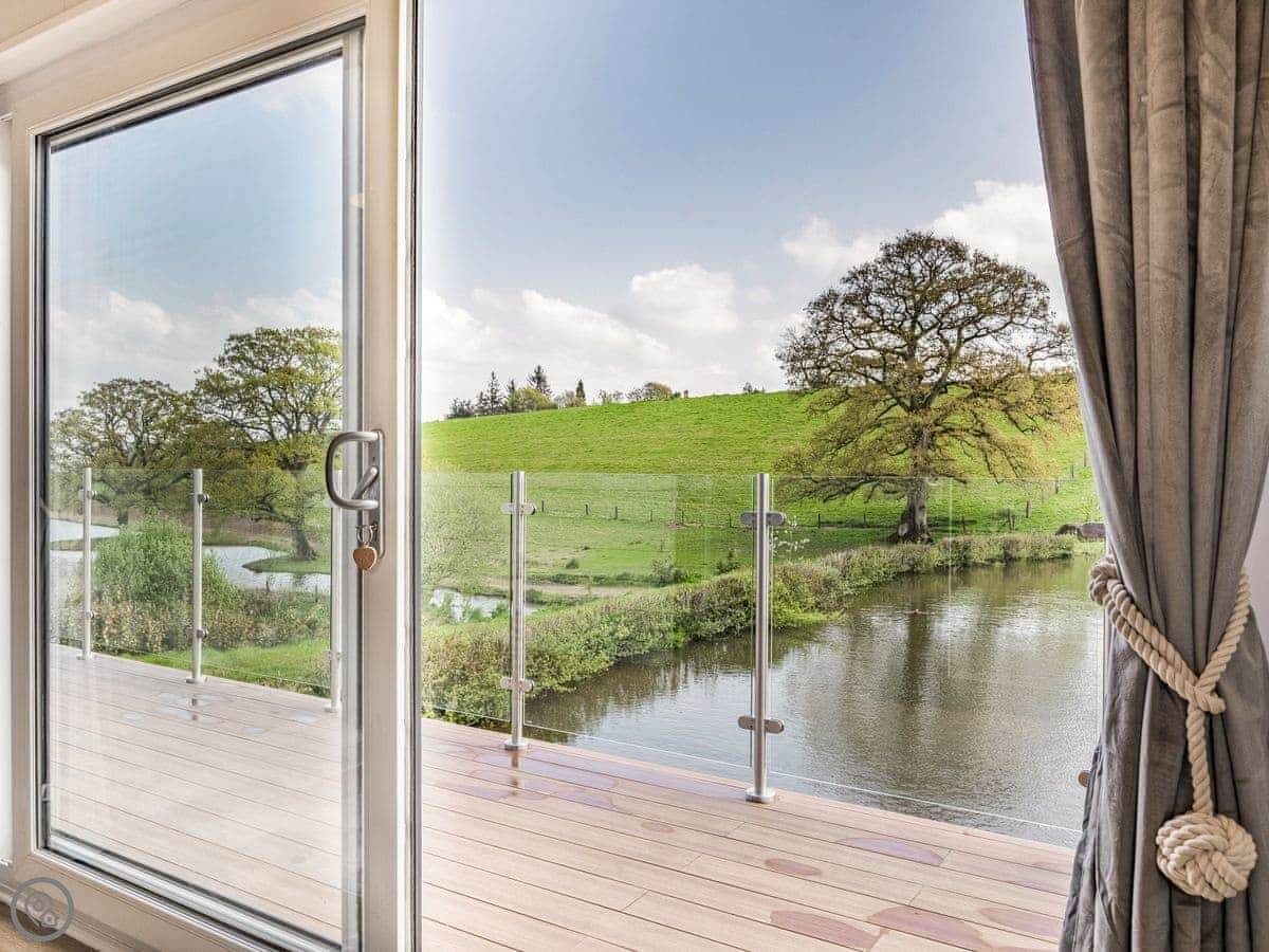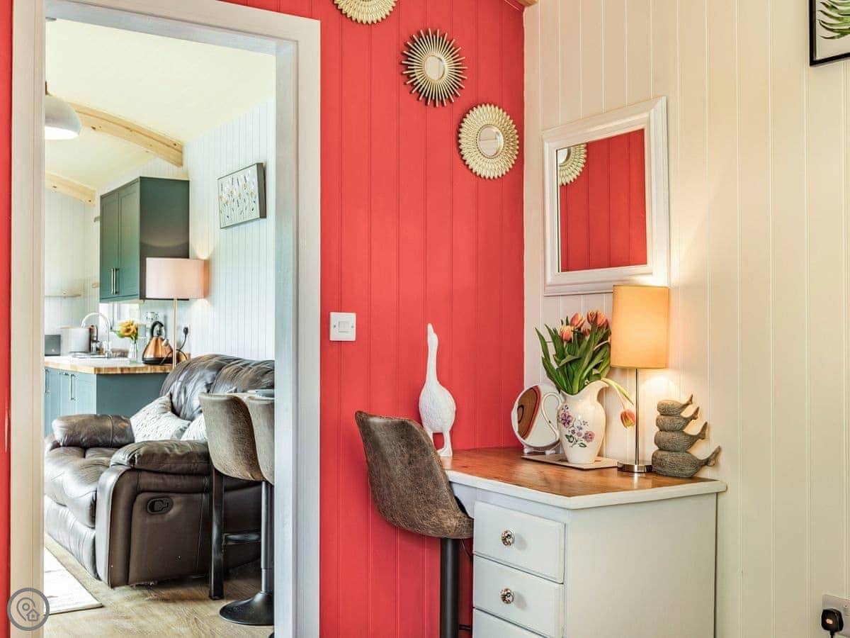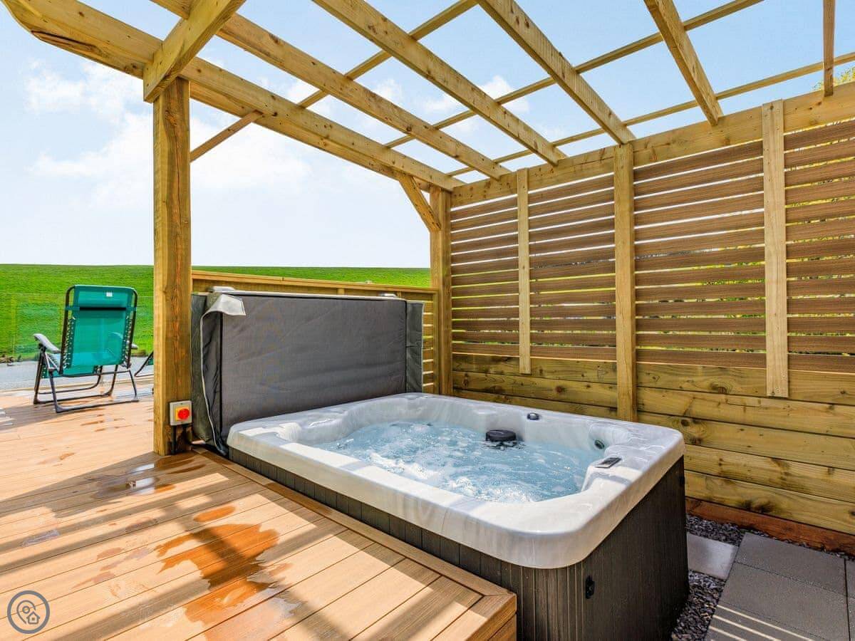 The main room is open plan. There's a kitchen area, a sofa, a wood burner and an electric fire for background heat. Outside, there's your own deck. It looks straight out onto the lake. There's a hot tub on the deck, table and chairs, and a barbecue.