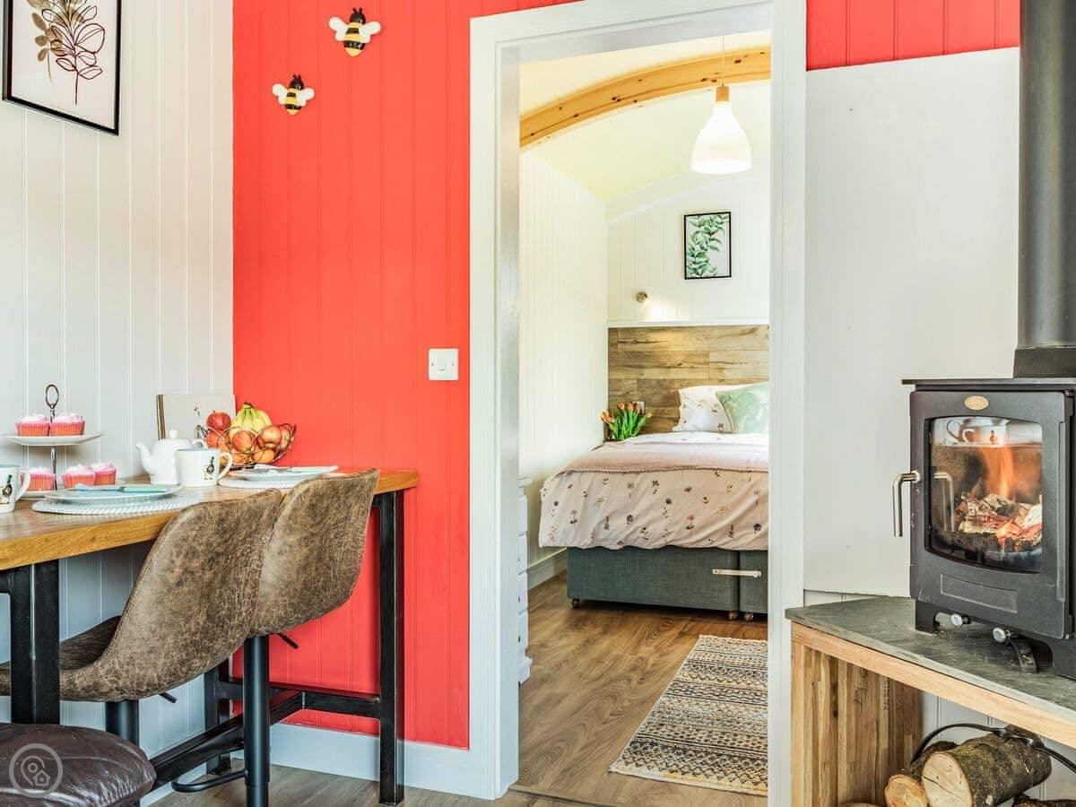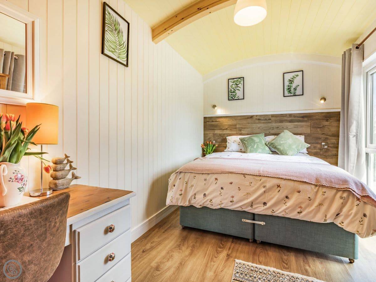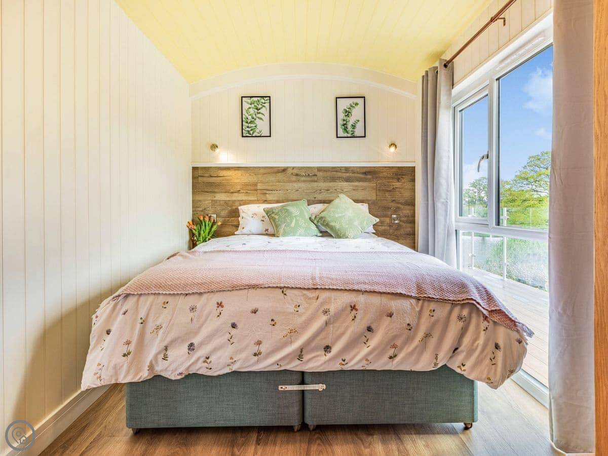 It's a proper glamping lodge, not a tent. It's all wood and glass. There's one bedroom with a super king bed, which we can split into two singles if you ask ahead. One bathroom with a walk-in shower. It's set up for two people.