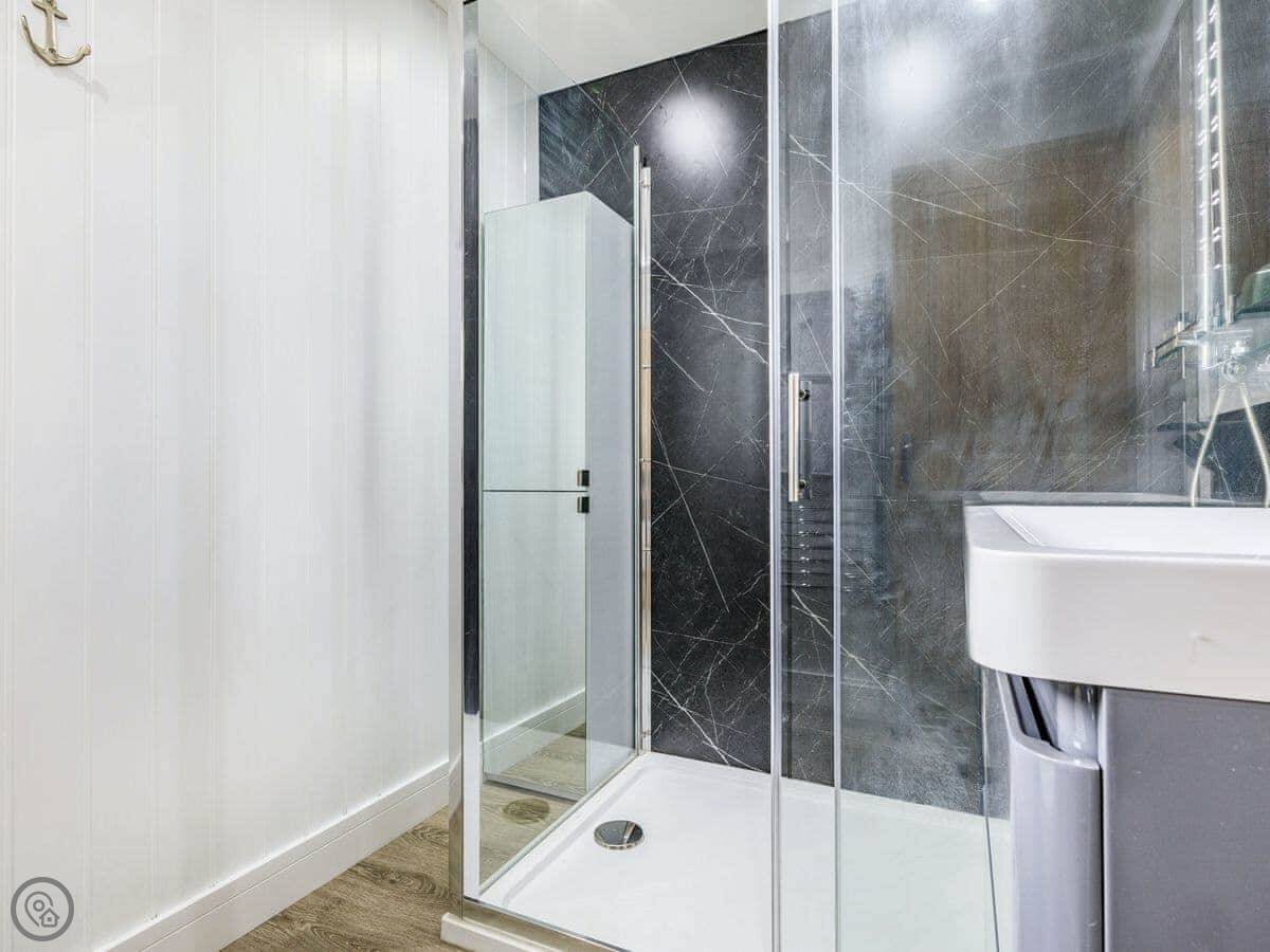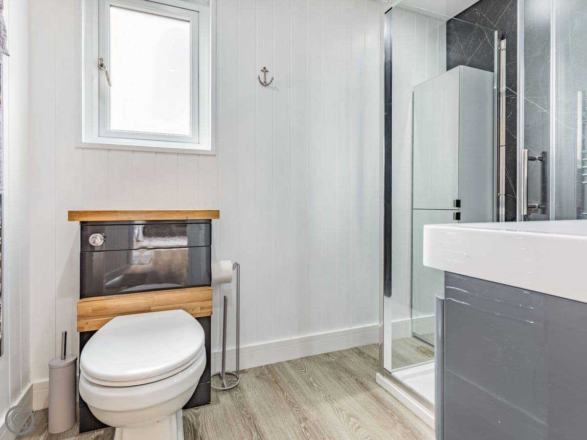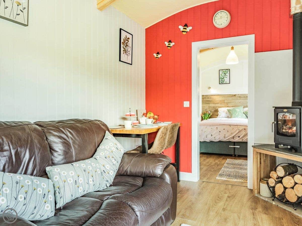 It's a proper glamping lodge, not a tent. It's all wood and glass. There's one bedroom with a super king bed, which we can split into two singles if you ask ahead. One bathroom with a walk-in shower. It's set up for two people.