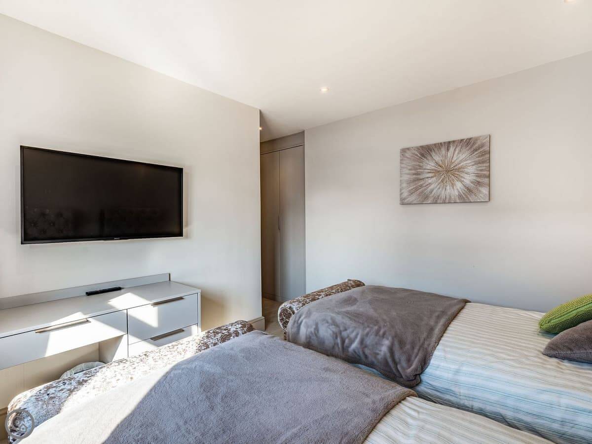 It's a bungalow, so everything's on one level. Good if you don't want stairs. Sleeps four. Two double bedrooms, both with their own bathrooms. It's got a 4 Star rating. It's smart and comfortable. The living area is open plan with a kitchen, dining bit, and sofas. There's a Smart TV and WiFi.