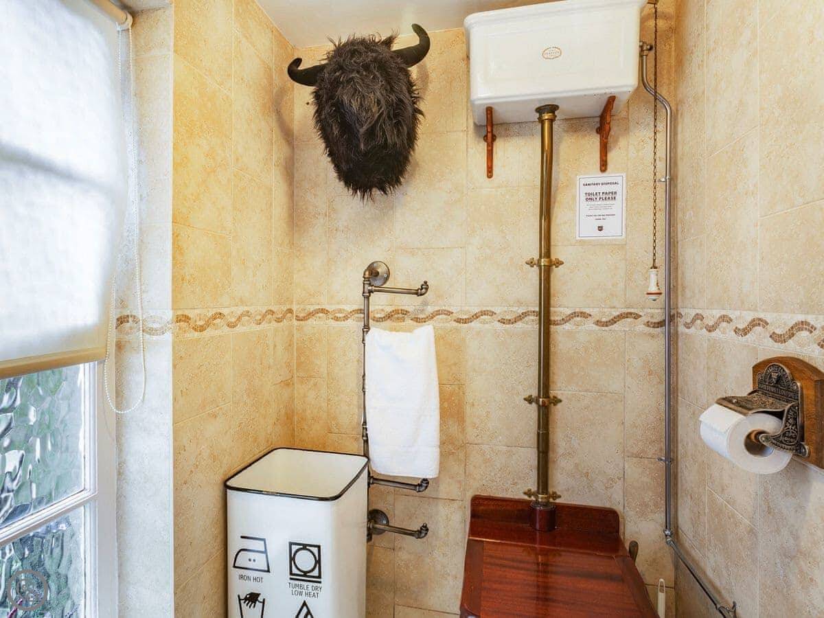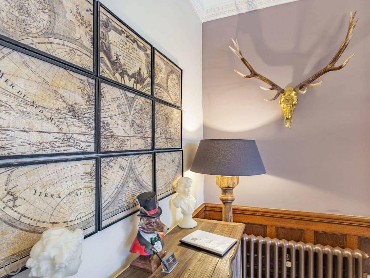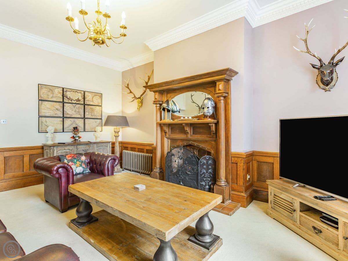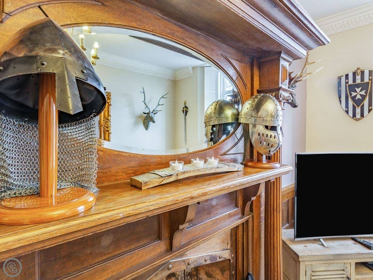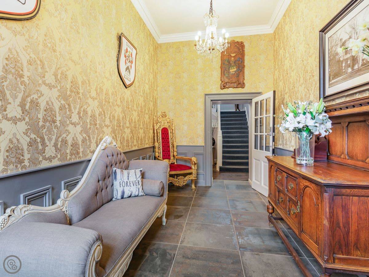 Truly quirky and oozing character and style, this spacious ground floor accommodation is styled with themed rooms to enhance the experience of your castle stay. The opulent entrance hallway has throne-themed chairs and shields hanging from the wall. The spacious living room carries on the medieval theme, has garden views with chesterfield sofas set around a stylish fireplace, and Sky TV for your entertainment.