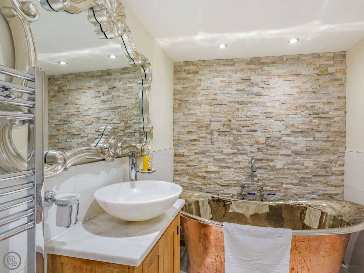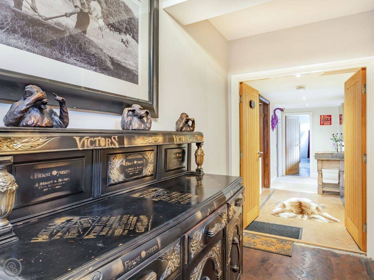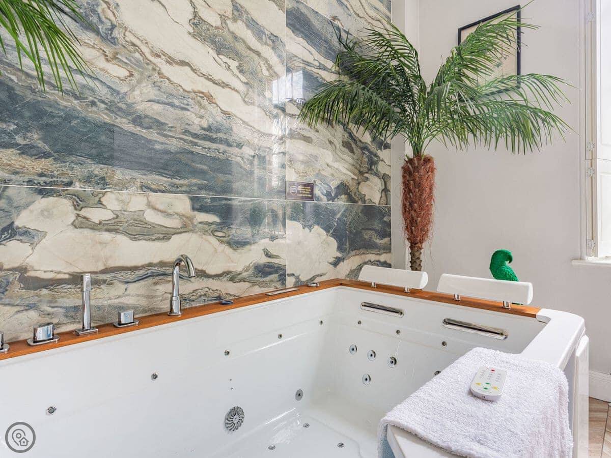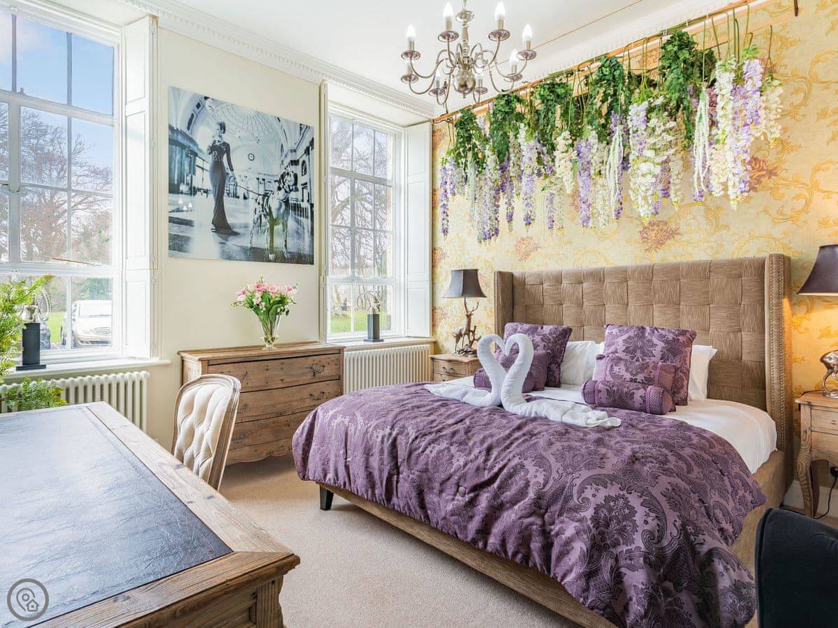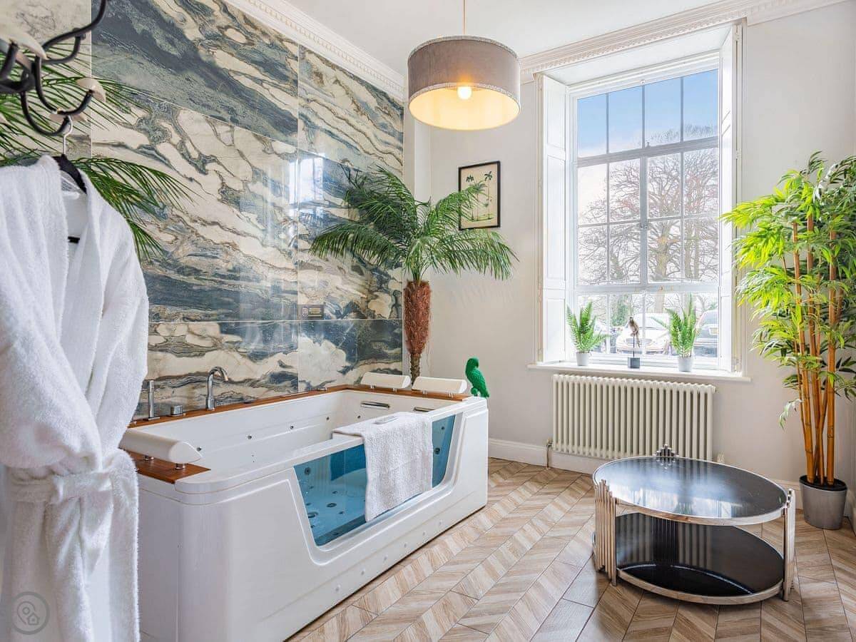The galley kitchen is home to all the contemporary appliances you could need to create a feast fit for royalty to be enjoyed in the dining room within the cosy alcove. The master bedroom is simply stunning, beautifully decorated with a fabulous super kingsize bed, and an ornate desk for use as a dressing table, through to the en-suite bathroom with a decadent copper roll top bath and marble floor. The second en-suite bedroom presents a regal theme with hints of gold running throughout and overlooks the gardens. After a day exploring the beautiful dales, enjoy some relaxation, open the bubbly, slip on the provided robes and head to the spa room to relax in the four-person spa bath, with mood lighting and bluetooth.
