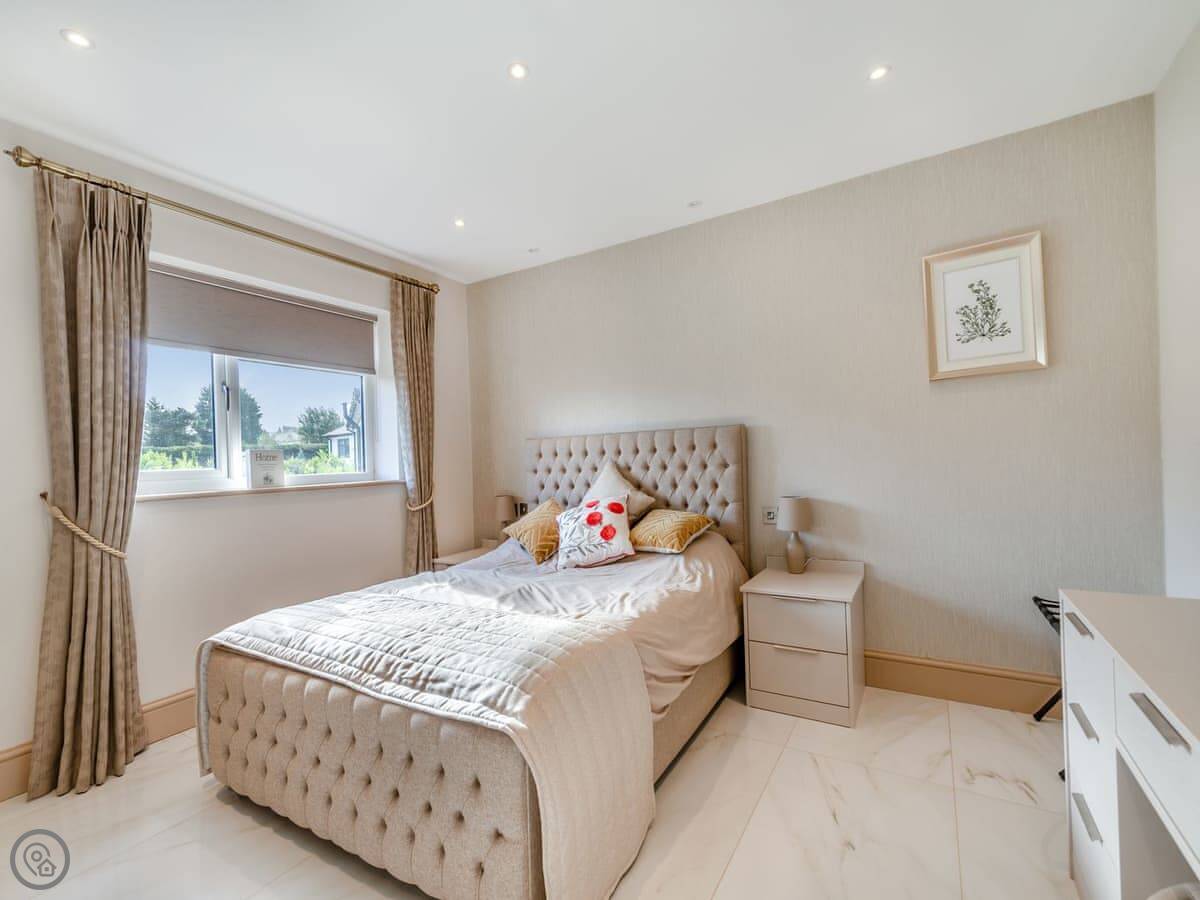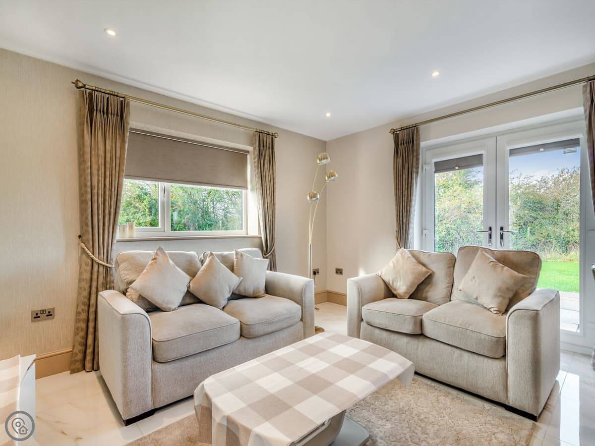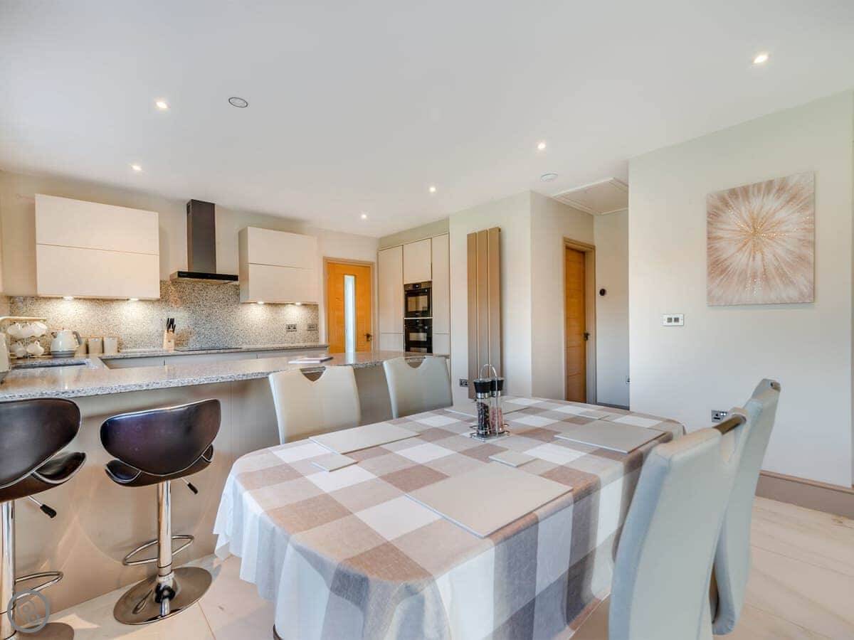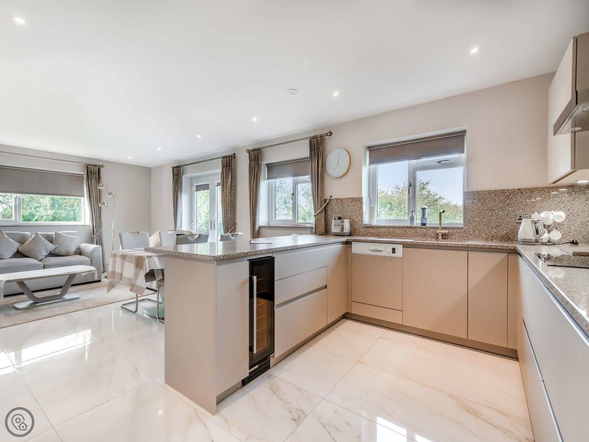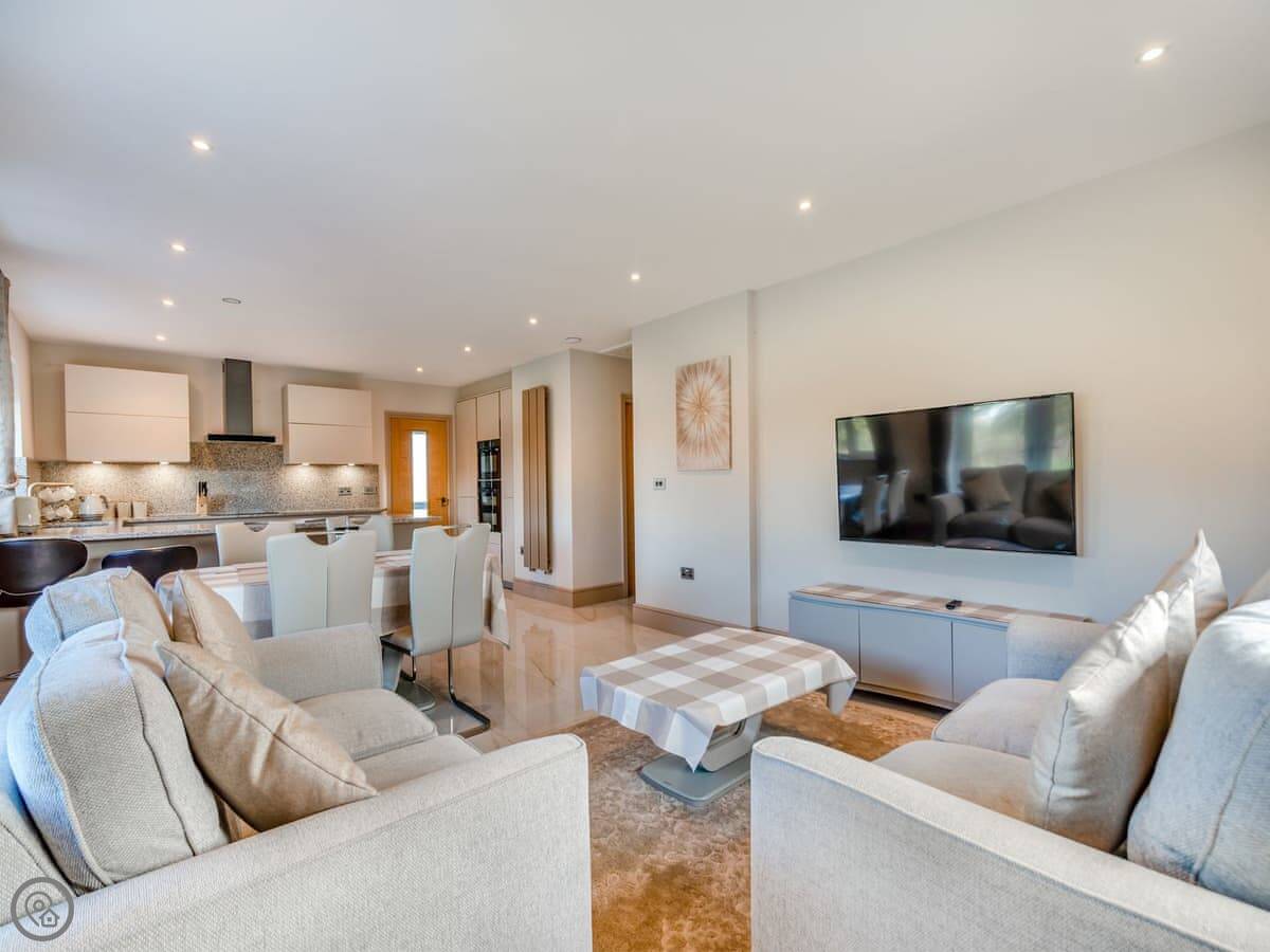 It sleeps four in two bedrooms. Both are doubles and both have their own en-suite bathroom, which is handy. The living area is open plan with a kitchen, dining space, and sitting area. It's got a Smart TV, WiFi, a dishwasher, and washing machine. Bedding and towels are included.