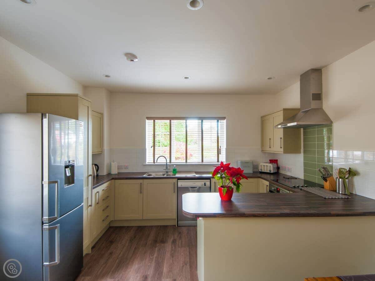 Inside, it's open plan. There's a kitchen with a dishwasher and washing machine, a sitting area with a TV, and WiFi. Bedding and towels are included. We can provide a cot and highchair if you need them. There's parking right outside.