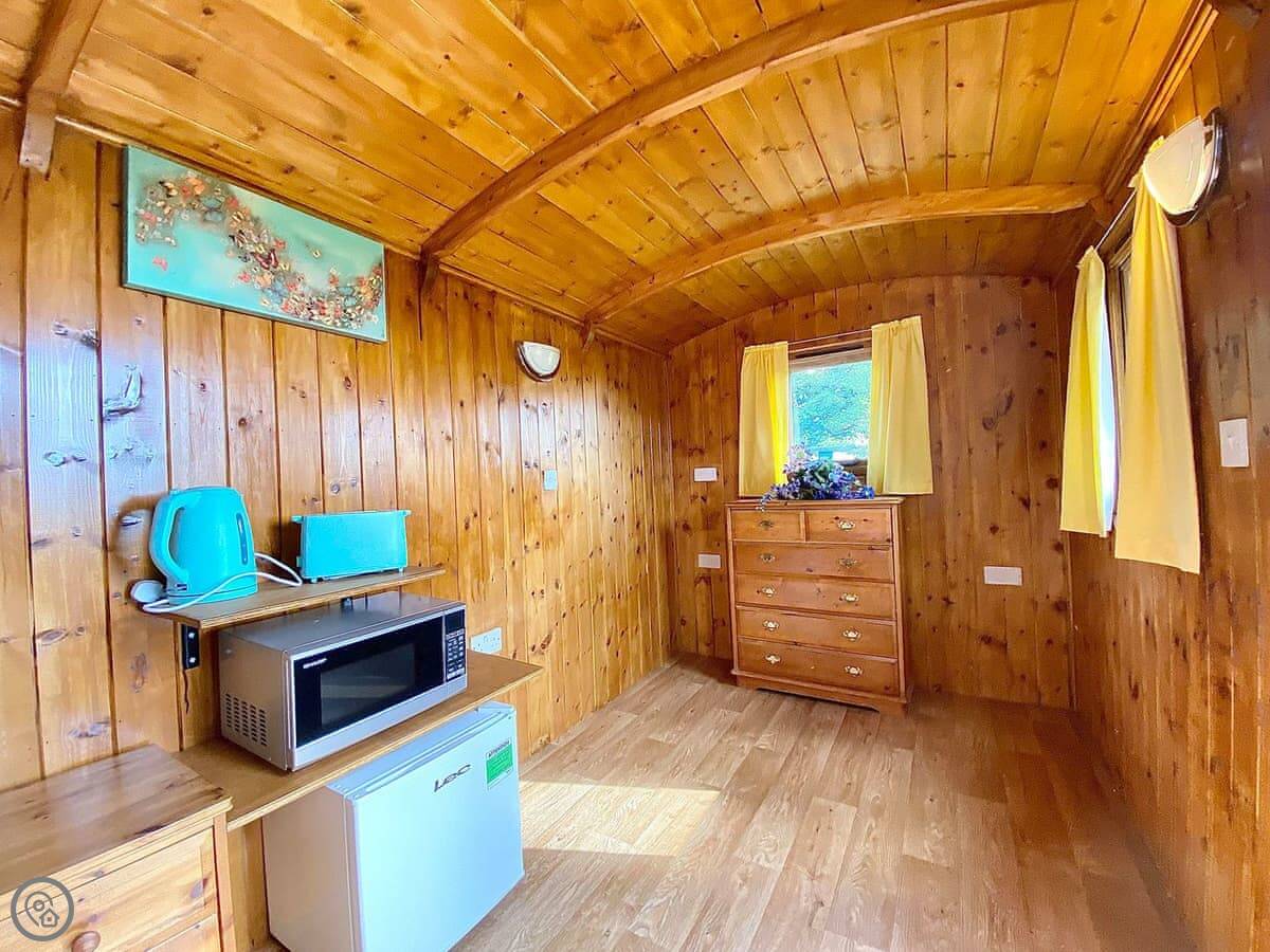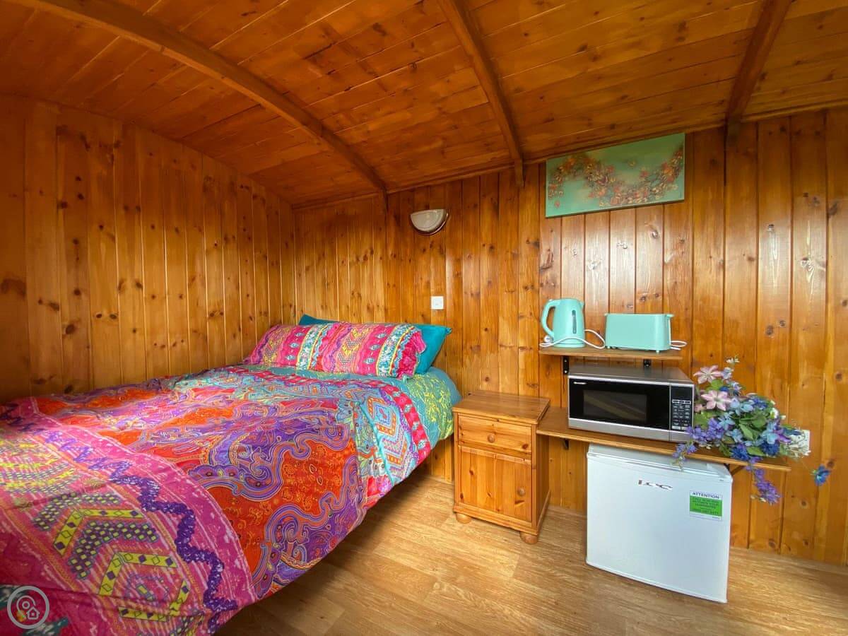 The hut itself has a bed, a little kitchen area with a microwave, kettle, and toaster. There's a BBQ outside your door. You get bedding and towels included.