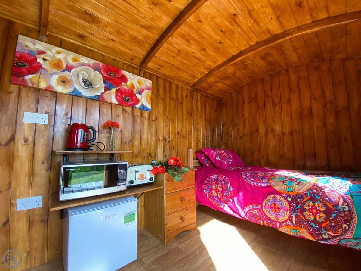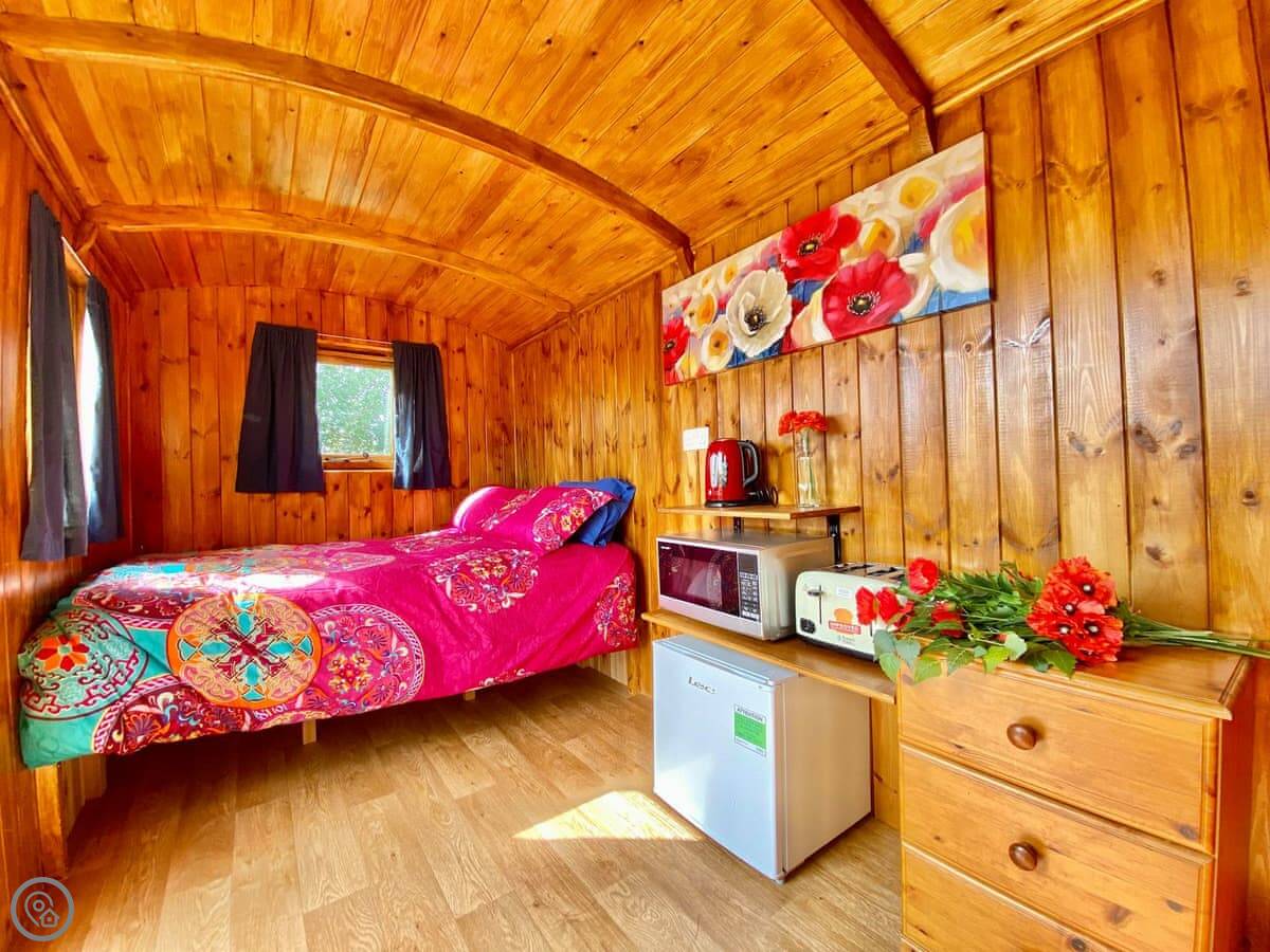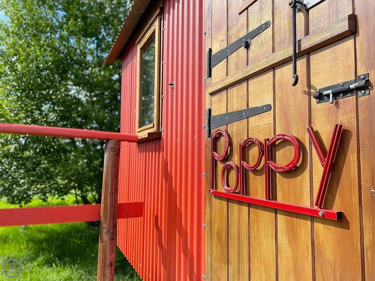 Poppy is a shepherds hut, one of four on our farm. It's on Chelworth Upper Green, Wiltshire. It’s a working farm, so you’ll see horses about. You’ve got 63 acres to wander around.