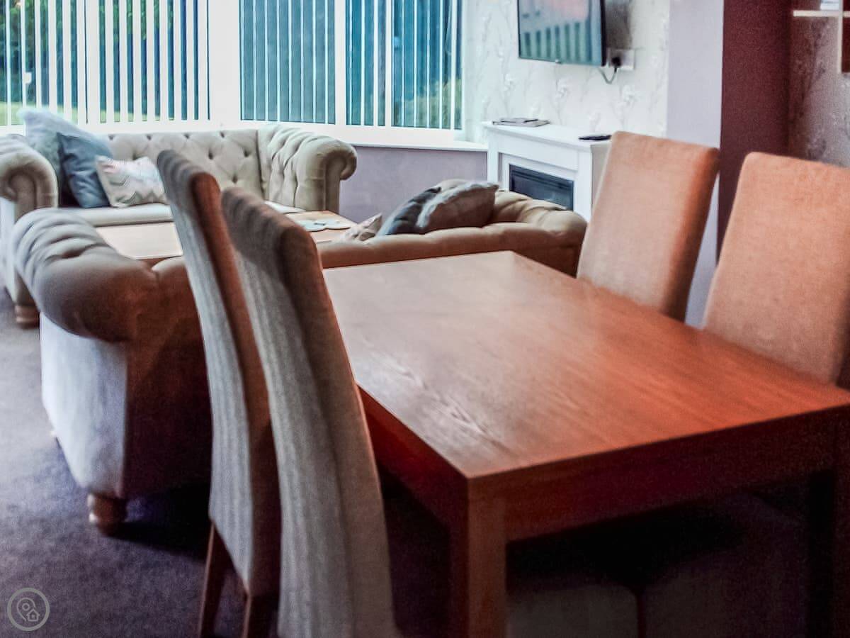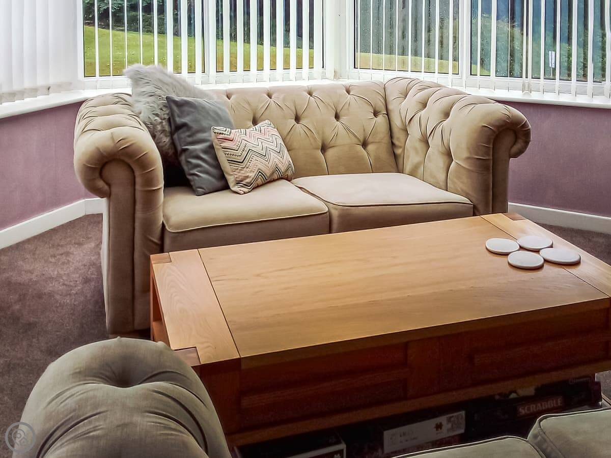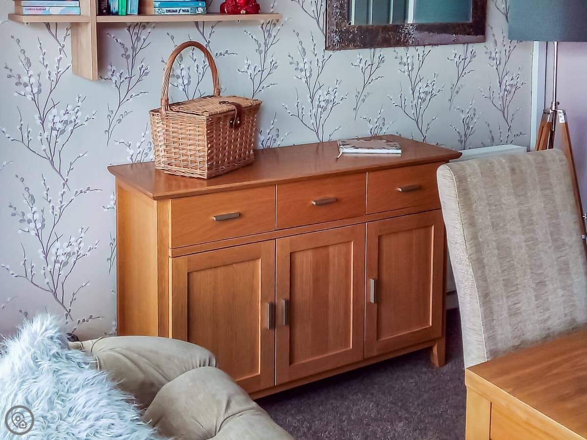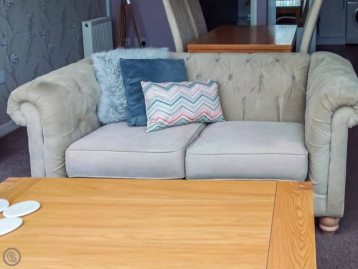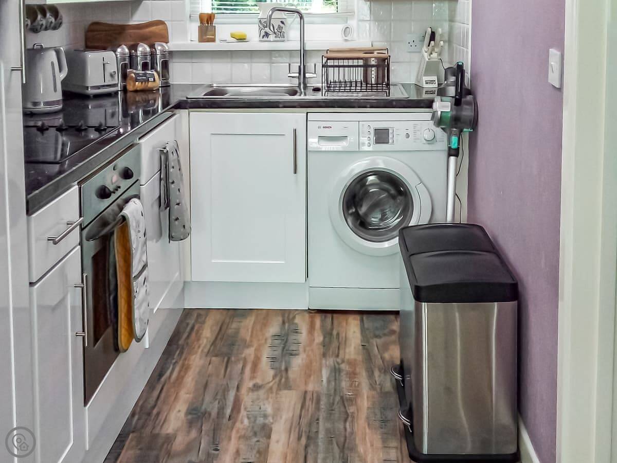 Inside it's all open plan with the living area, kitchen and dining bit together. It's got a Smart TV, WiFi, a washing machine, and the usual kitchen things. Bedding and towels are included.