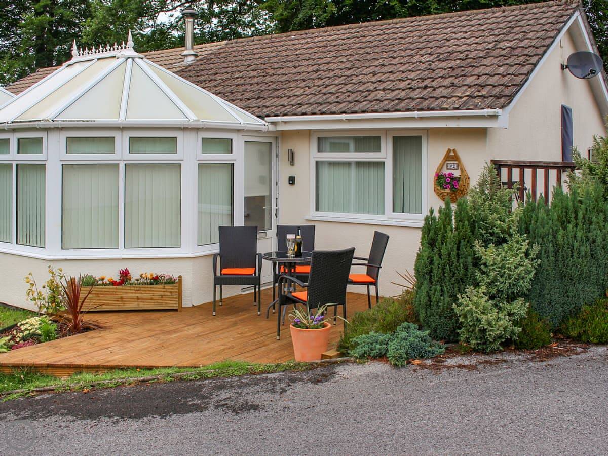 There are a few steps up to the front door. Outside the front there's a decked area with a table and chairs. It gets the evening sun. The road is right there, just so you know.