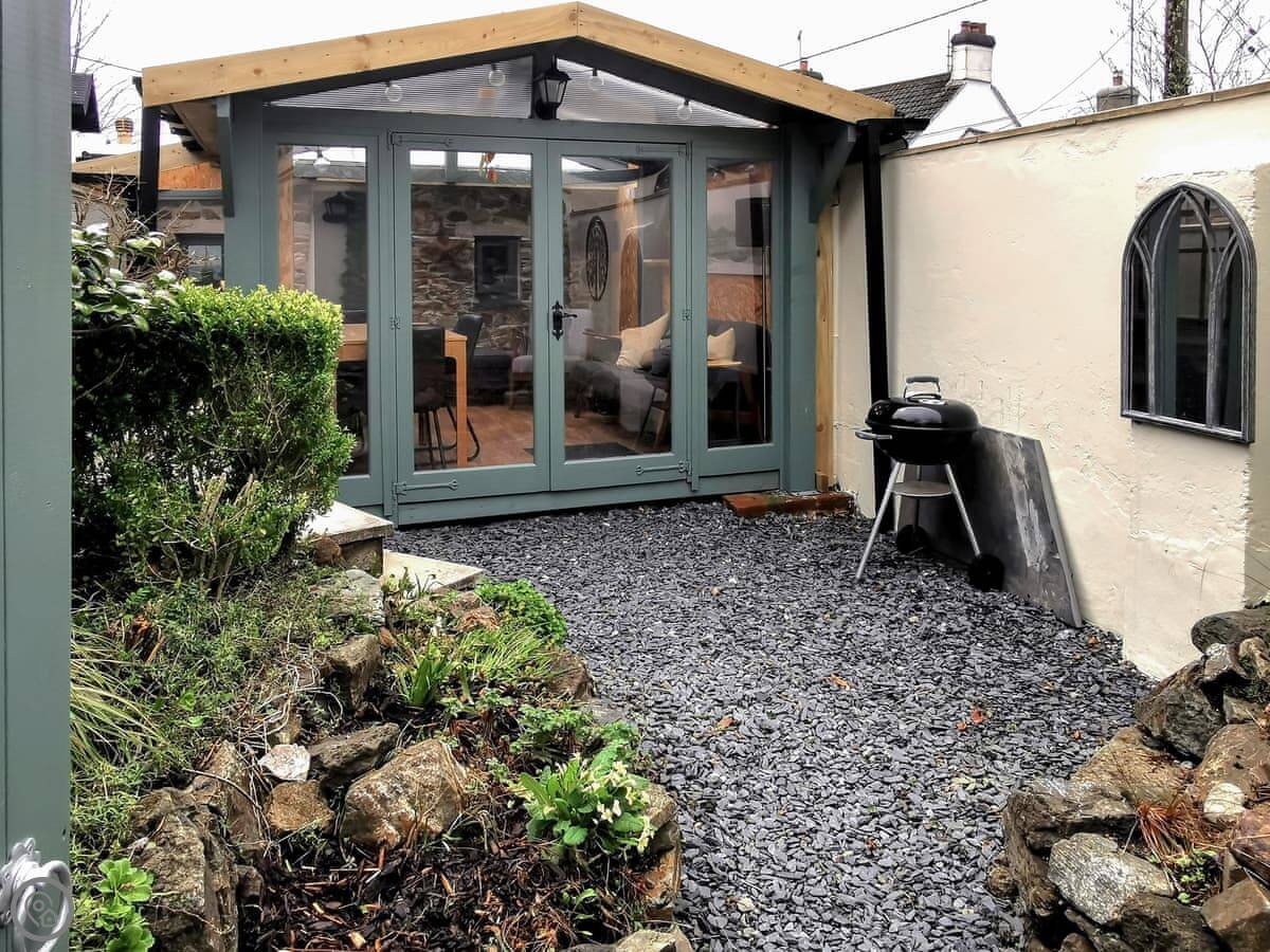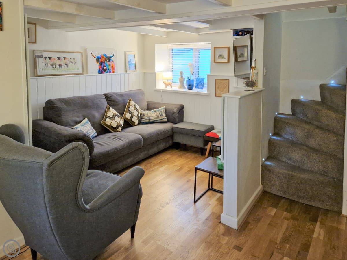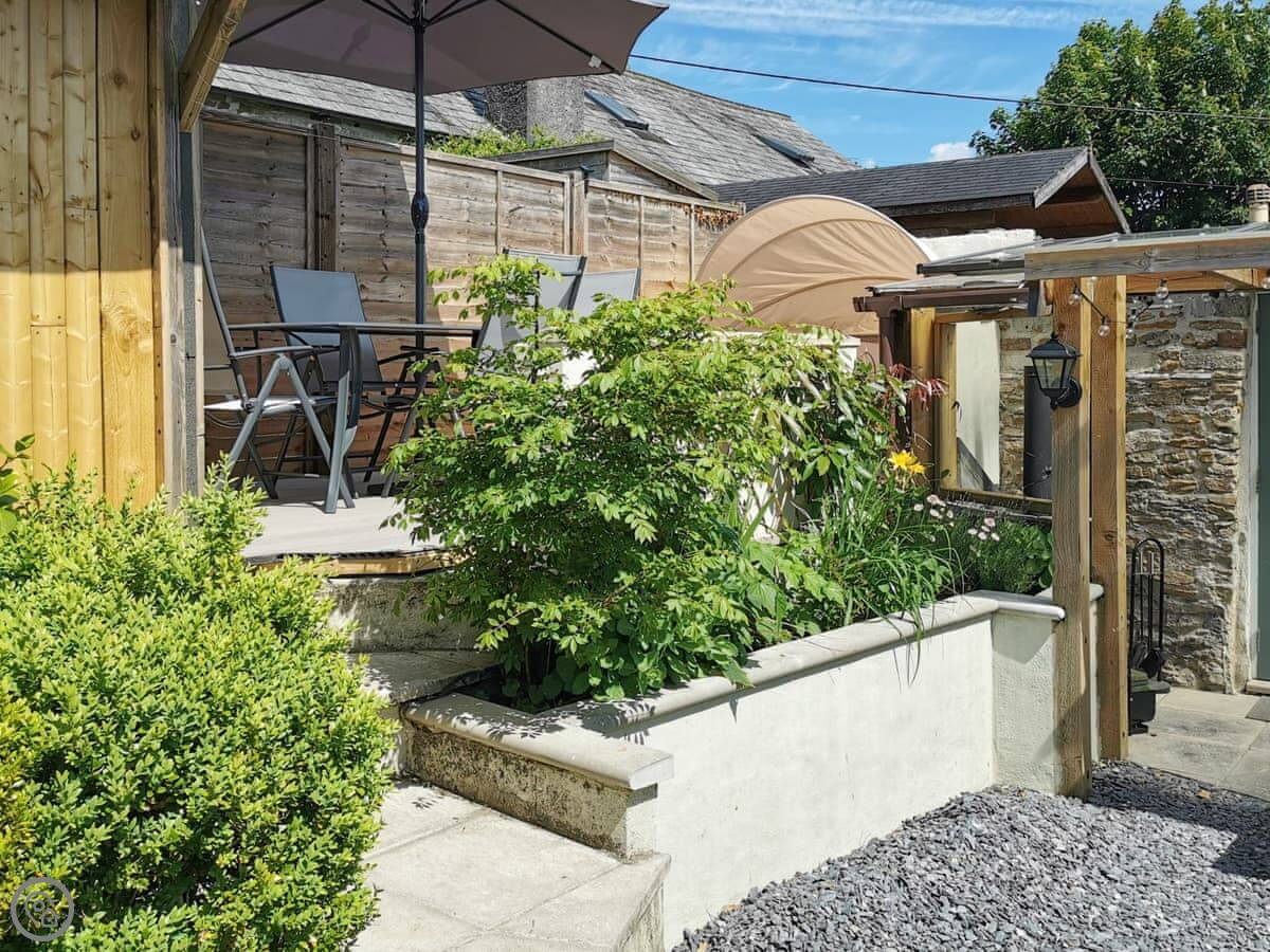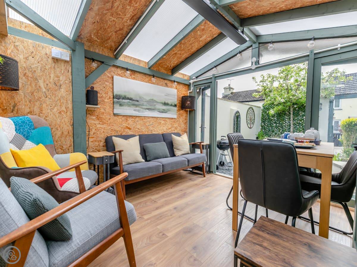 Guests can enjoy private use of the enclosed garden which is opposite the cottage behind the parking area. It’s a unique space set-up with an outdoor table and chairs for alfresco dining, a circular daybed on the raised decked area . On the level part of the garden there is a garden room with dining area and sofa and chair, bar/kitchen area and infra-red heater. Outside is a charcoal barbecue.