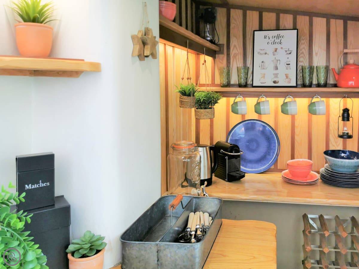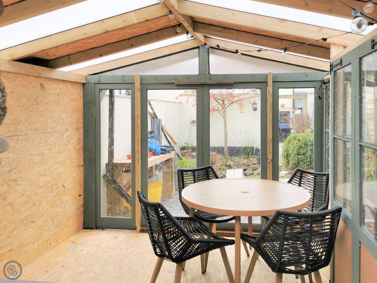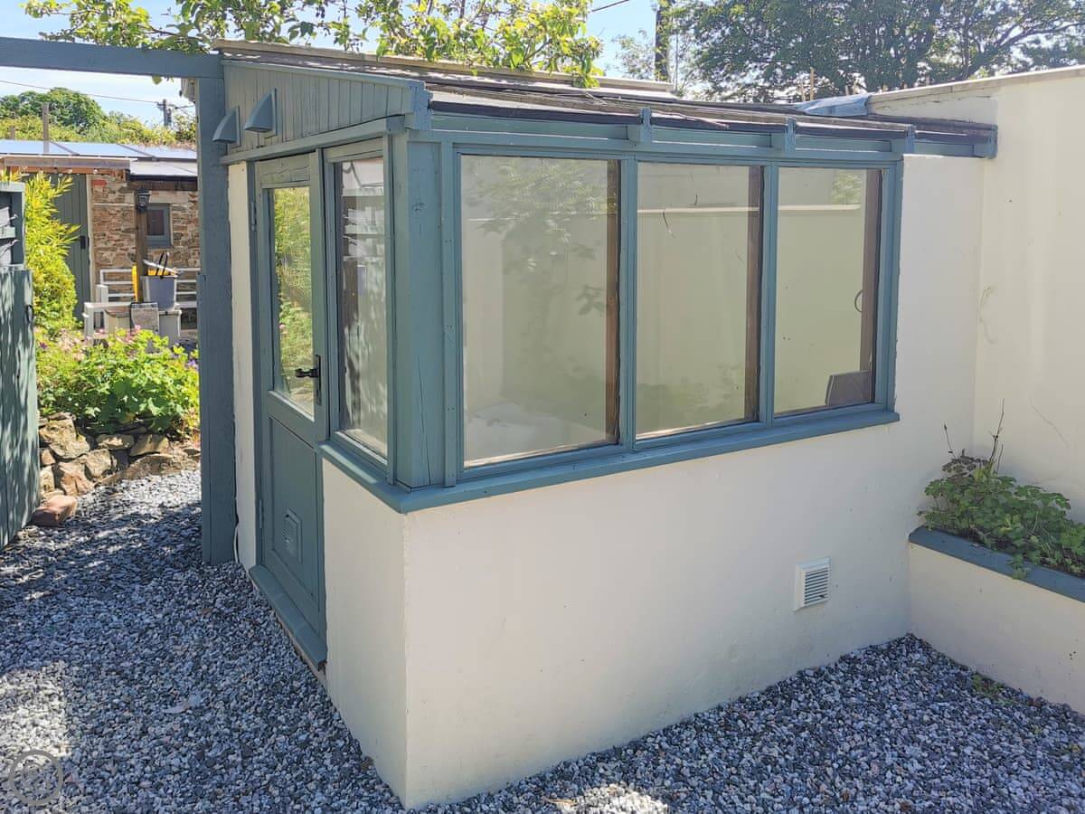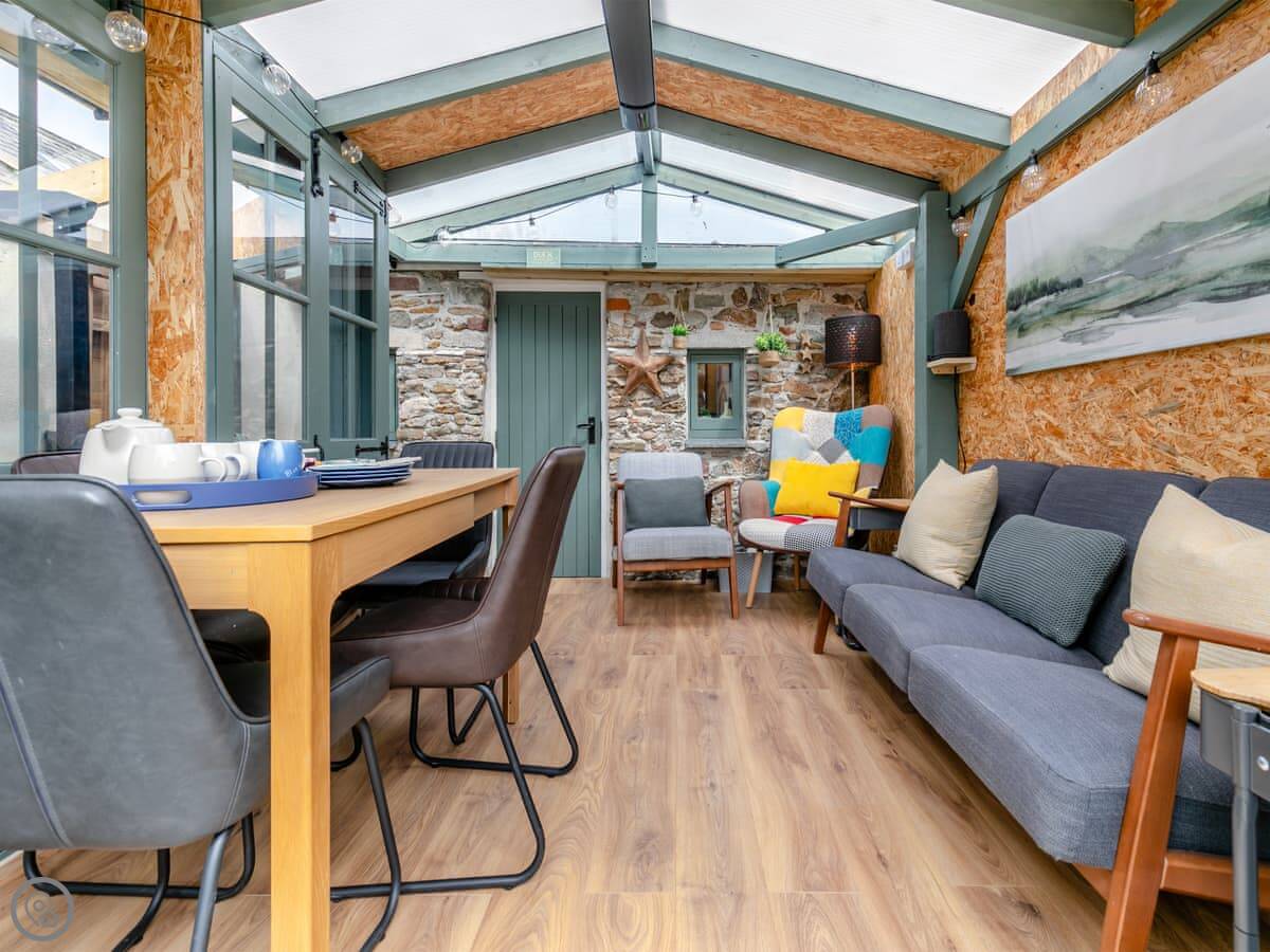 Guests can enjoy private use of the enclosed garden which is opposite the cottage behind the parking area. It’s a unique space set-up with an outdoor table and chairs for alfresco dining, a circular daybed on the raised decked area . On the level part of the garden there is a garden room with dining area and sofa and chair, bar/kitchen area and infra-red heater. Outside is a charcoal barbecue.