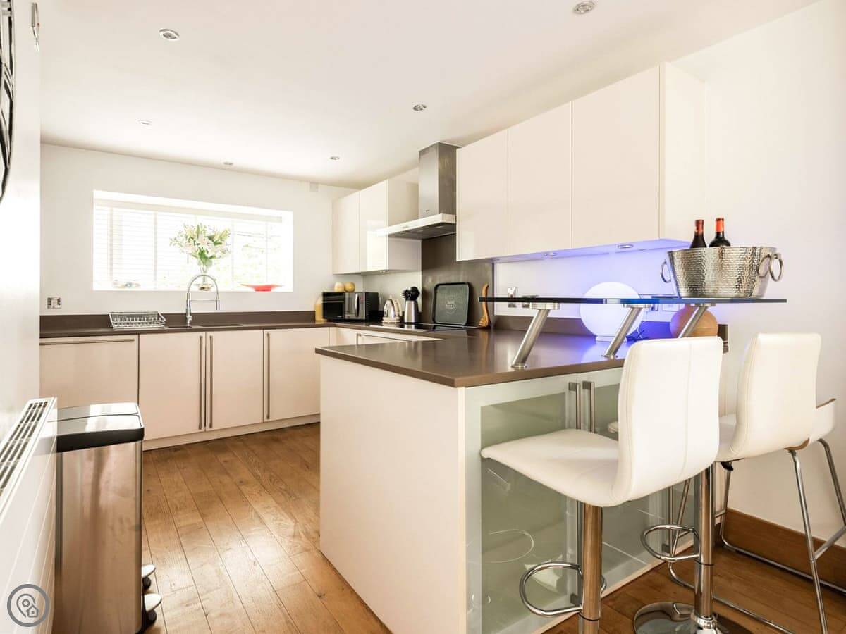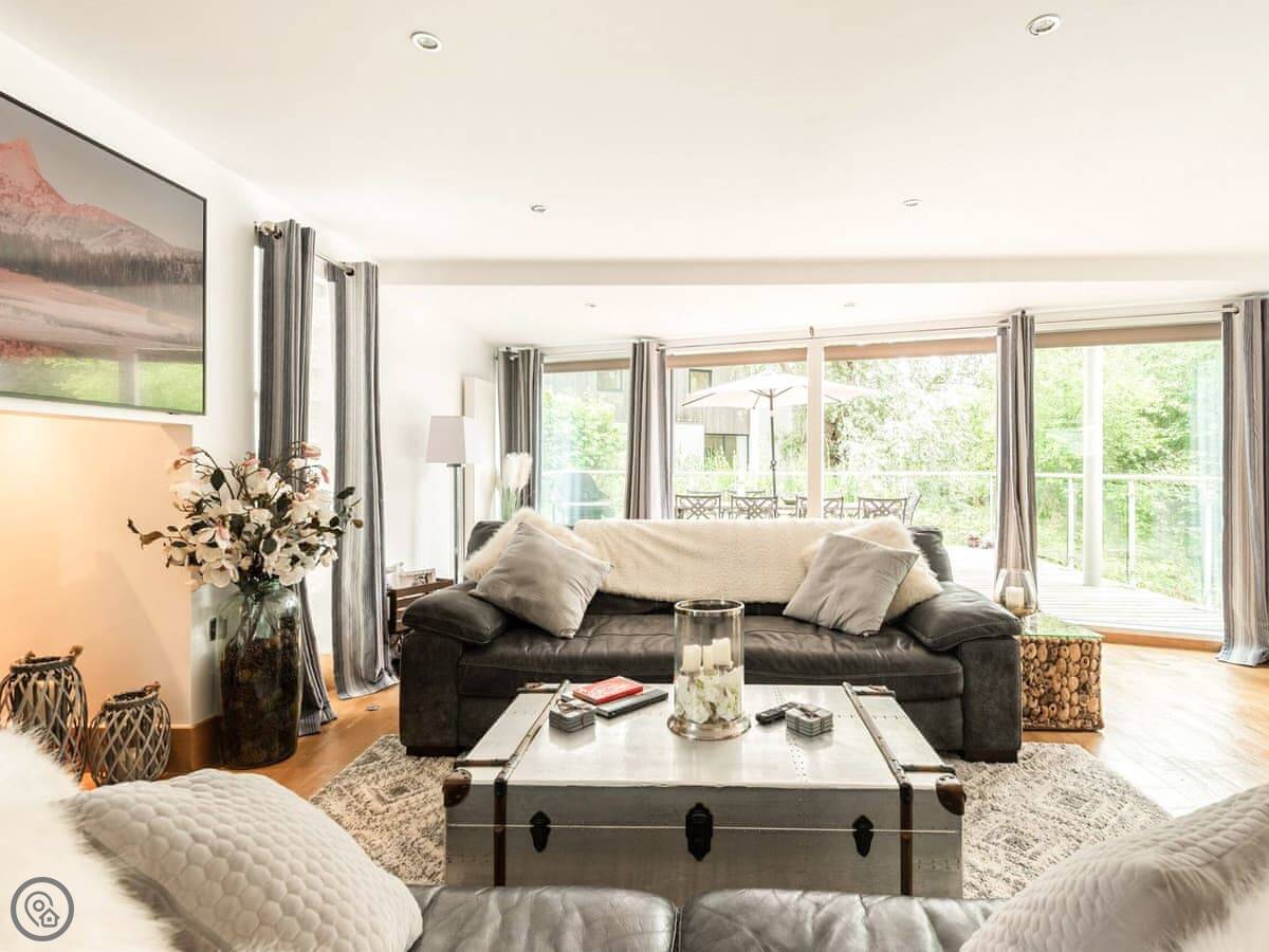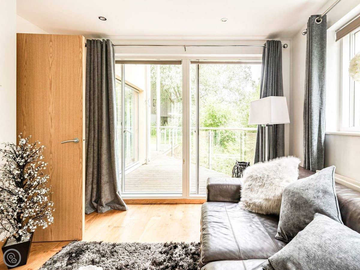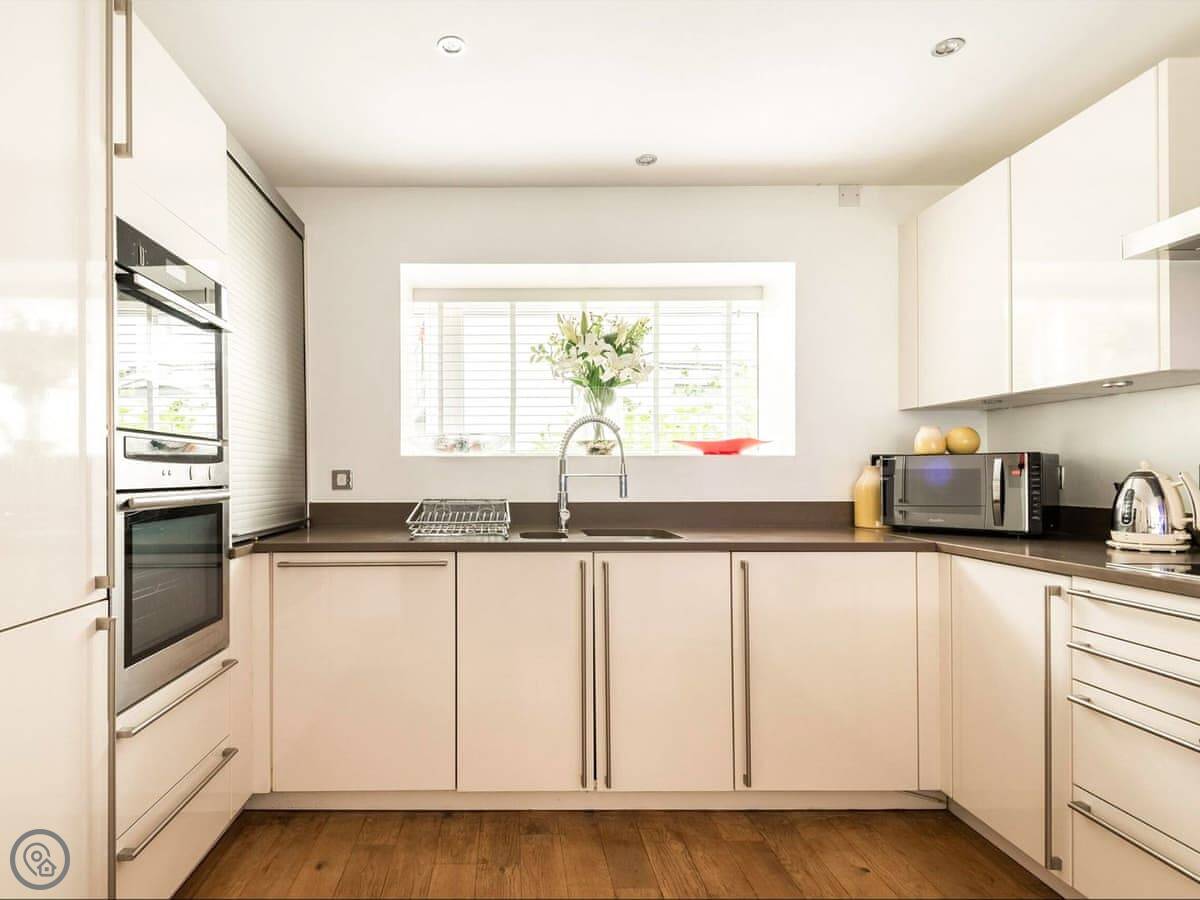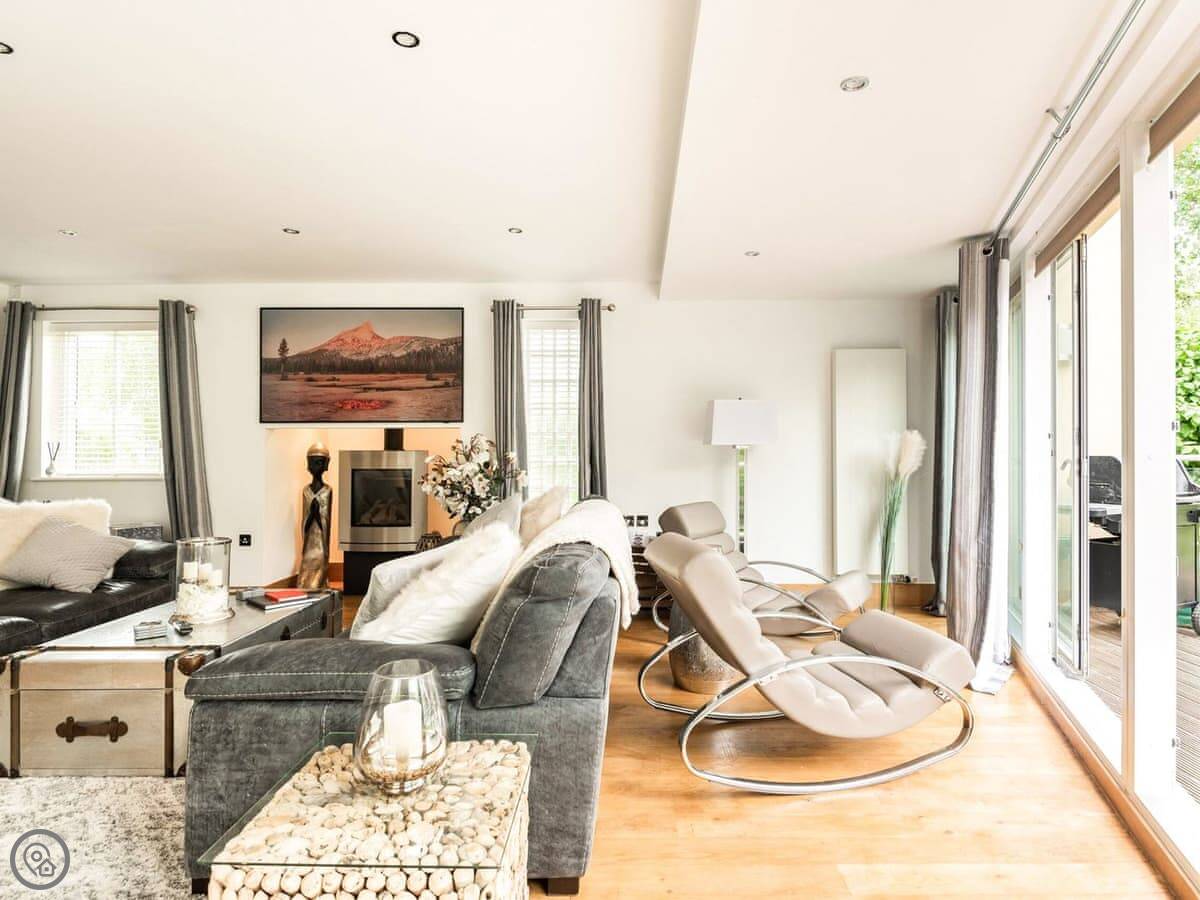 The house provides a comfortable relaxing setting for families of up to nine people including children. The 2, 000 square feet of accommodation is spread over three floors and comprises a large master bedroom with a super kingsize bed and en-suite bathroom with a shower, two twin bedrooms sharing a bathroom with shower and bath, situated on the 2nd floor. On the 3rd floor there is one further large bedroom with a super kingsize bed and a third bathroom en-suite with a bath/shower. There are two balconies on the 2nd floor with views over the stream. All of the bedrooms and bathrooms are fitted with wooden blinds or blackout curtains to enable a good night’s sleep. The main living space is on the ground floor and consists of an open plan living room and kitchen, including a contemporary extending glass dining table that sits up to 8 people. This open plan area also comprises an inset gas fireplace with 65” picture frame HDTV above the fire, along with two large sofas and two rocking chairs. In addition there is a second room with a further sofa and tv, great as a nook for kids or as a quiet space for adults. The property has a number of balconies throughout, two on the first floor which you can access through the master bedroom/ hall. A full balcony at the rear of the detached property looking over the Water Garden and Mill house stream which feeds the River Thames.