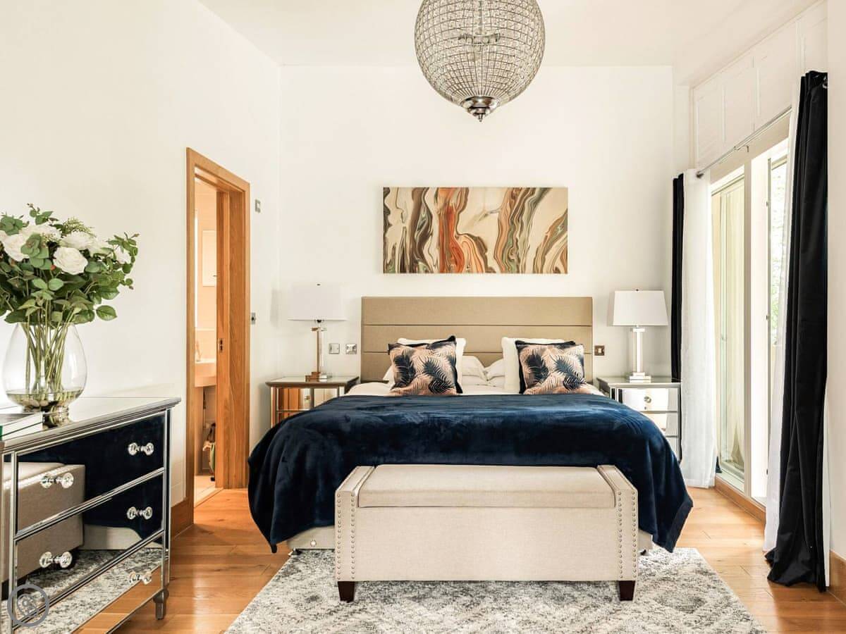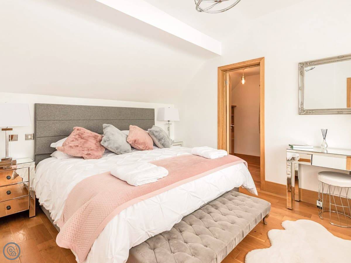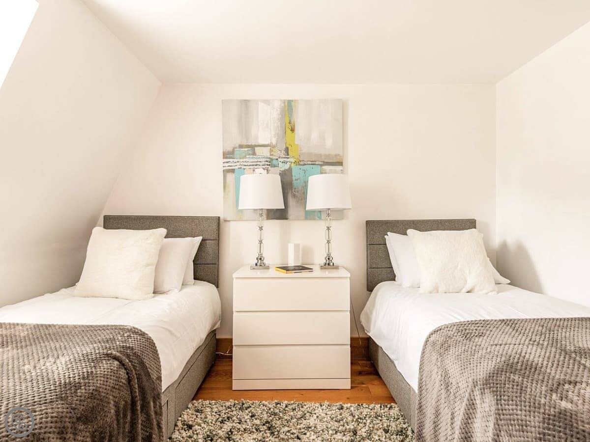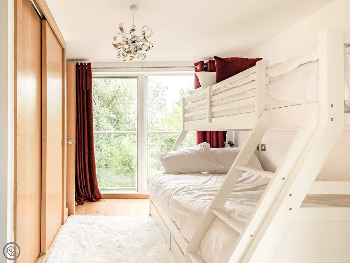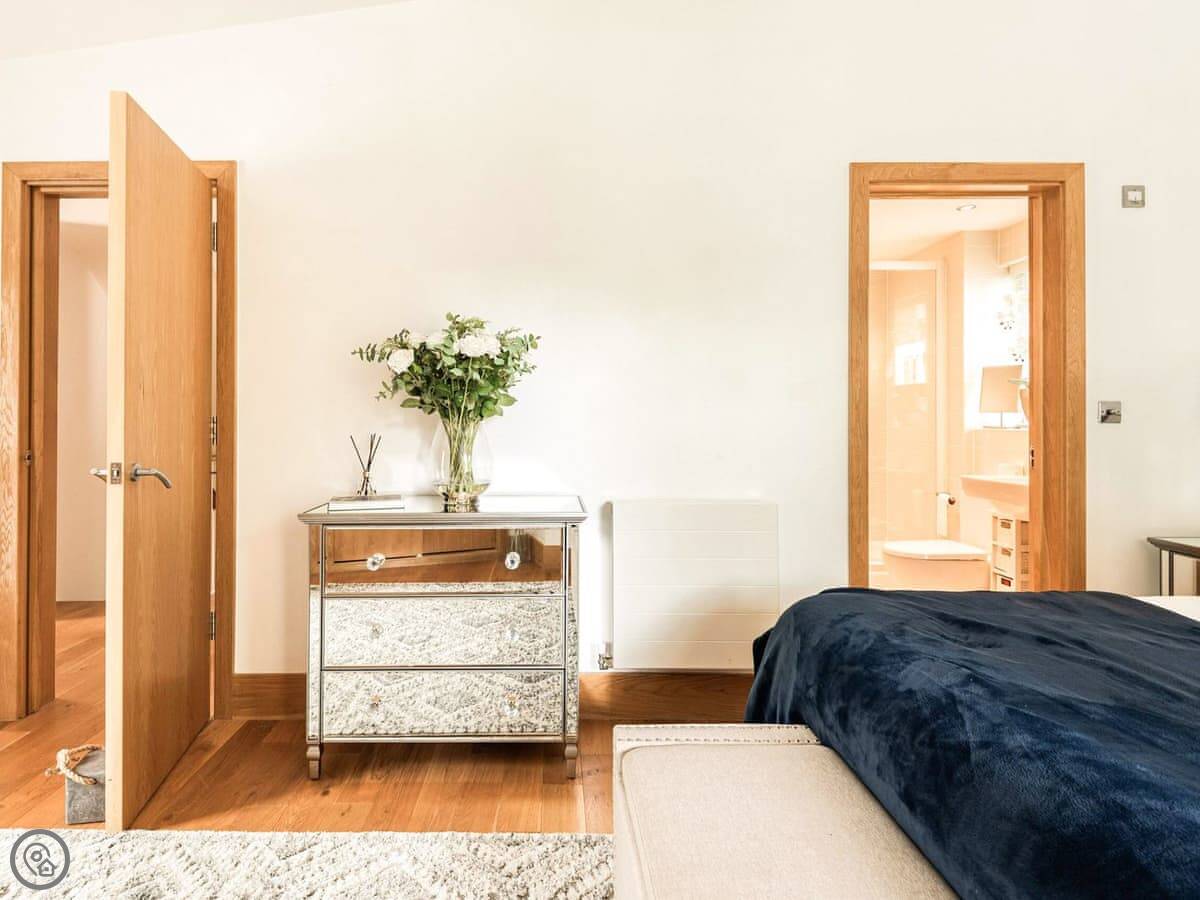 The house provides a comfortable relaxing setting for families of up to nine people including children. The 2, 000 square feet of accommodation is spread over three floors and comprises a large master bedroom with a super kingsize bed and en-suite bathroom with a shower, two twin bedrooms sharing a bathroom with shower and bath, situated on the 2nd floor. On the 3rd floor there is one further large bedroom with a super kingsize bed and a third bathroom en-suite with a bath/shower. There are two balconies on the 2nd floor with views over the stream. All of the bedrooms and bathrooms are fitted with wooden blinds or blackout curtains to enable a good night’s sleep. The main living space is on the ground floor and consists of an open plan living room and kitchen, including a contemporary extending glass dining table that sits up to 8 people. This open plan area also comprises an inset gas fireplace with 65” picture frame HDTV above the fire, along with two large sofas and two rocking chairs. In addition there is a second room with a further sofa and tv, great as a nook for kids or as a quiet space for adults. The property has a number of balconies throughout, two on the first floor which you can access through the master bedroom/ hall. A full balcony at the rear of the detached property looking over the Water Garden and Mill house stream which feeds the River Thames.