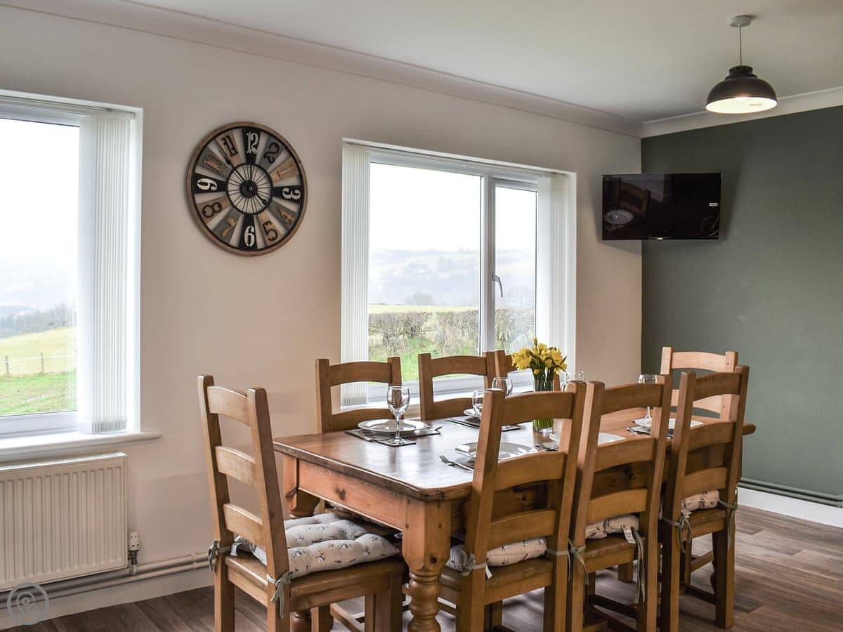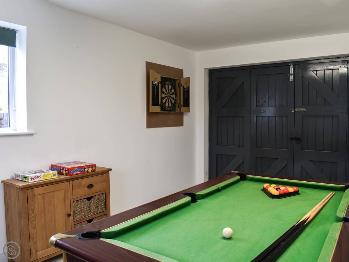 The open living style kitchen/diner is well equipped for those looking to cook up a family meal, there is plenty of space around the table for all. The utility room provides everything you need to clean up after days out in the countryside offering sink, boot room and washing machine for your convenience. There is also a shower room with toilet. For the small and big kids, you will find the games room with dart board, pool table and a selection of board games for evening entertainment.