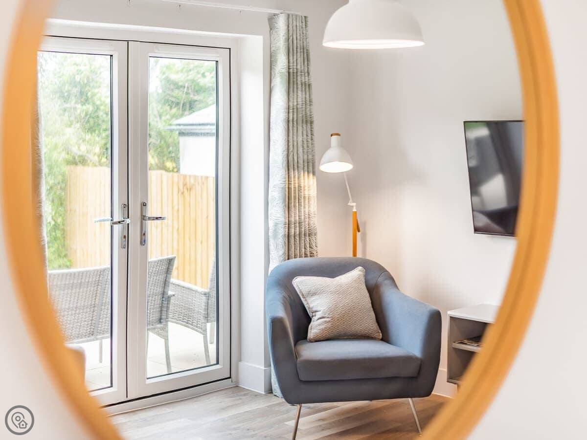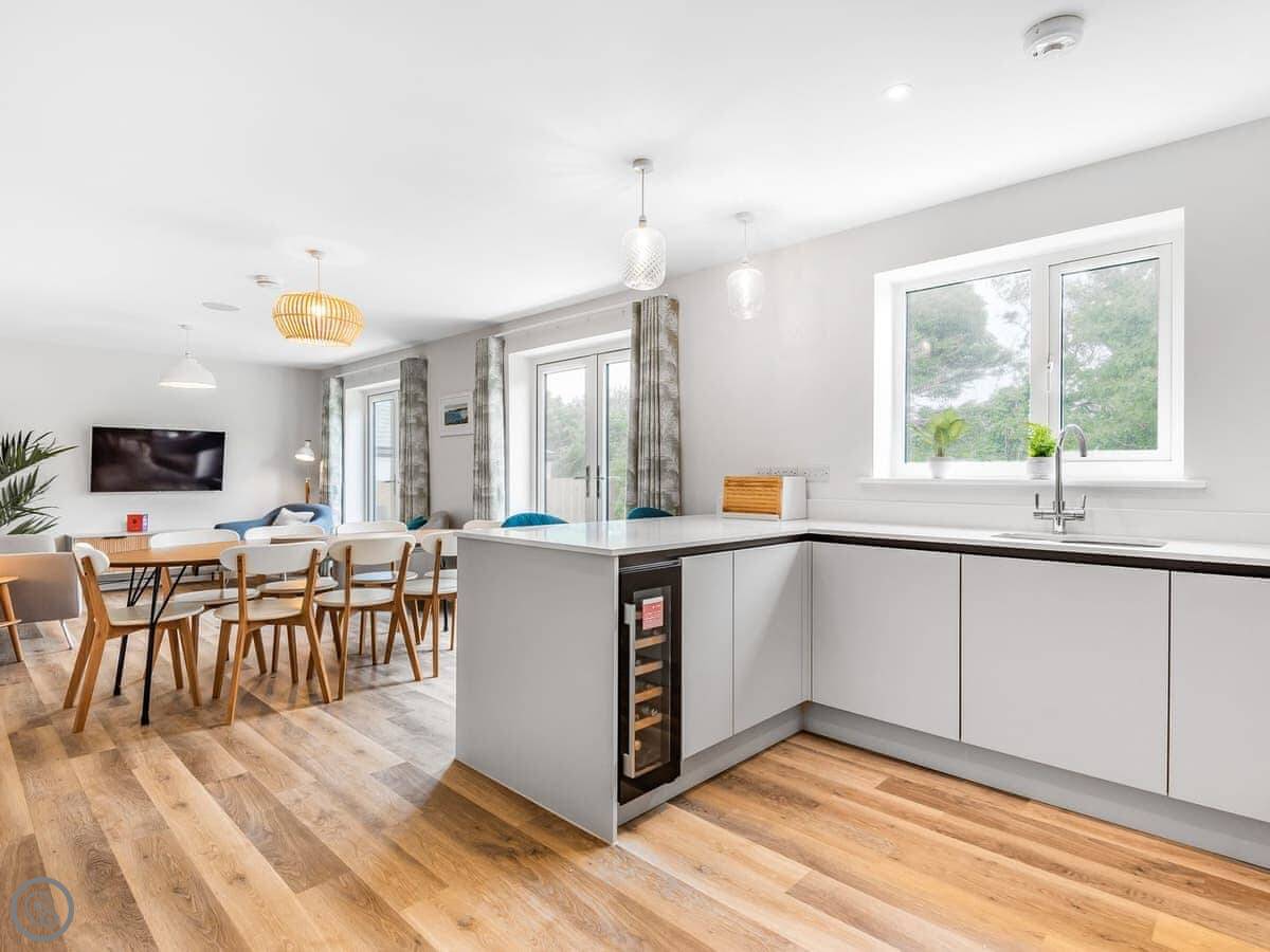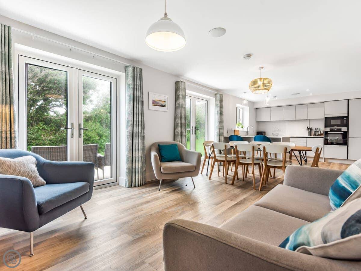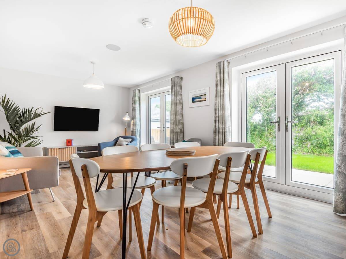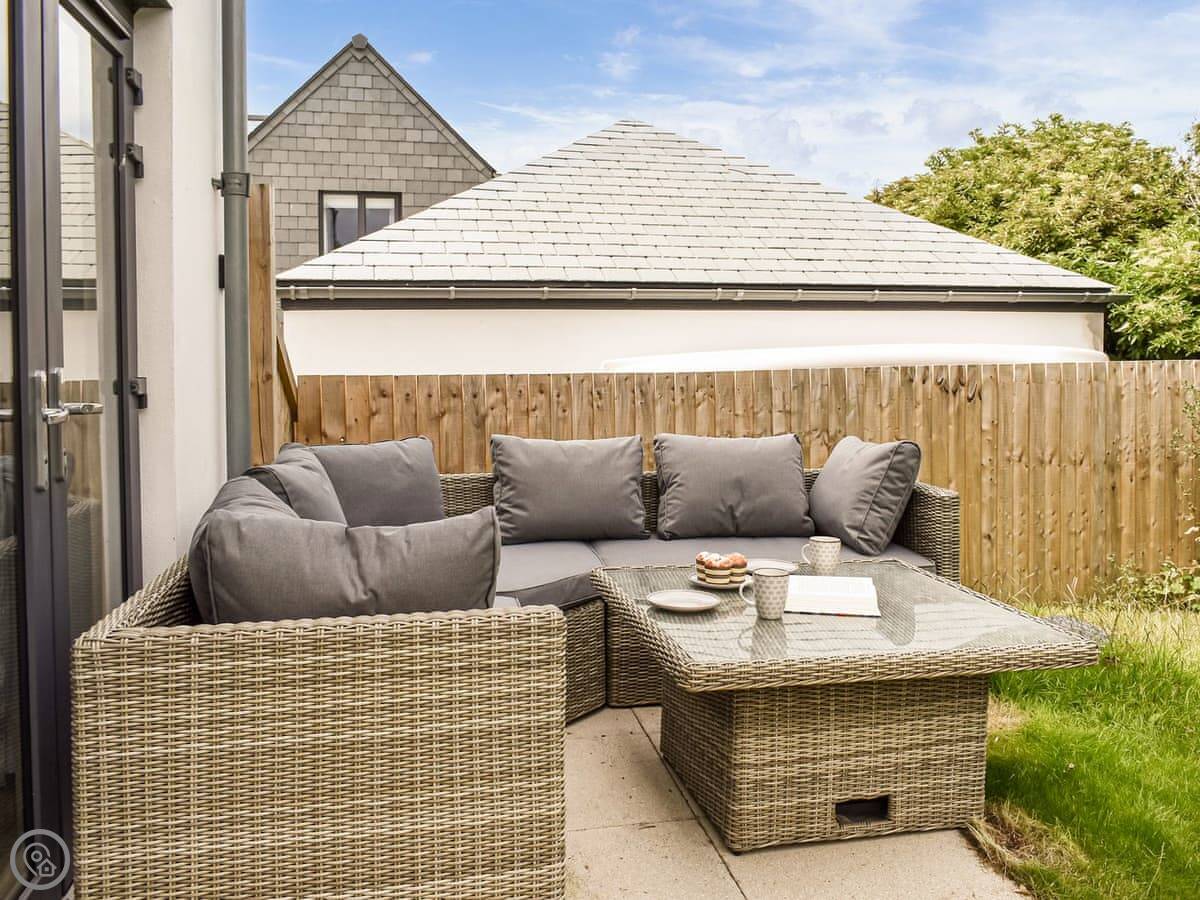 Parking on your private driveway, you enter the house and are greeted by a bright and airy space, following throughout the property. The open-plan living area is the hub, with a superbly equipped, sweeping kitchen with hot water tap, wine cooler and breakfast area, large dining table with eight chairs, and a relaxing area with twin chairs, sofa and large Smart TV. Doors lead out onto your enclosed garden consisting of a patio and lawned area, with very comfortable corner-style seating. There is a superb hot water shower to the side of the house, ideal for washing down wetsuits, paddle or surf boards after a relaxing day at the beach.