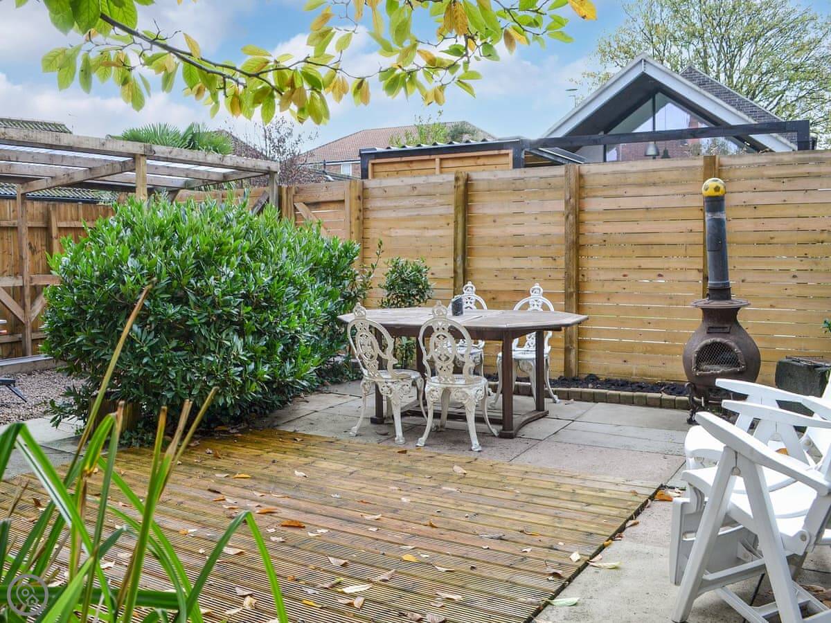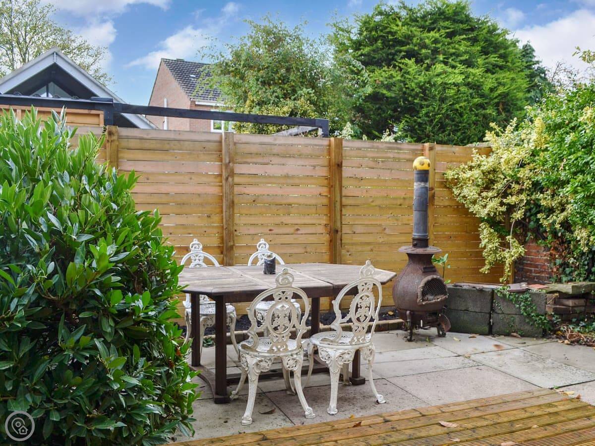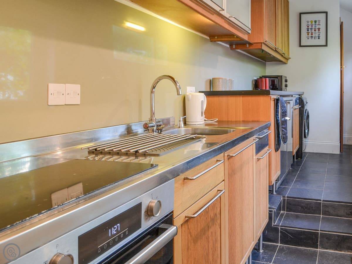 Downstairs, there's a living room with a wood burner. The kitchen is a galley style, so it's narrow but it has what you need. There's a washing machine. The patio garden gets the sun in the afternoon. It's enclosed.