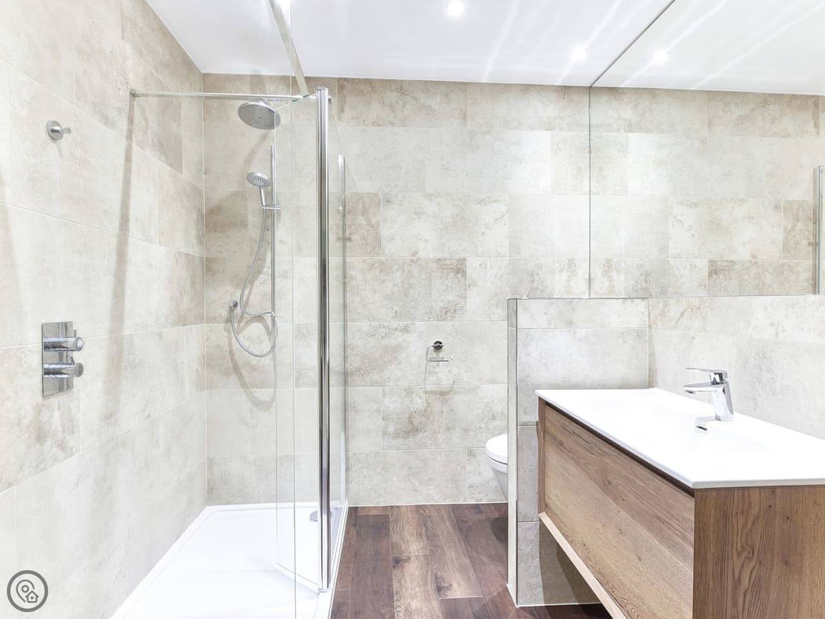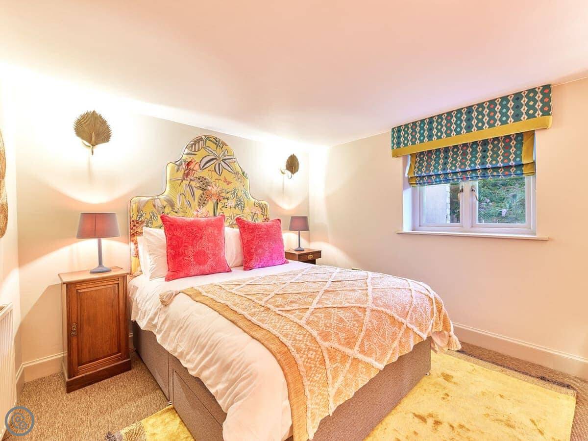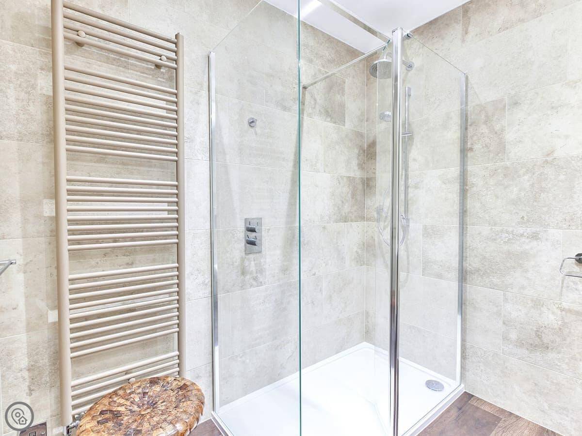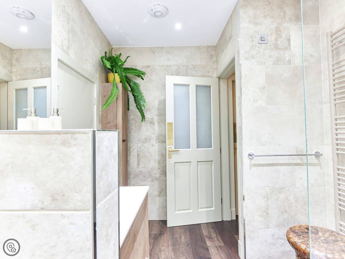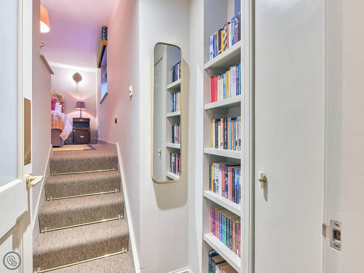 The dining table for two overlooks the very green and luscious courtyard space which is sealed by a gate making the very central home feel very peaceful and secluded. The focal point of the room is the massive fireplace, unfortunately this is not functioning, but it is beautiful to look at. The house has a large bookshelf with loads of books for you to read while you’re visiting. The living room also has a built-in desk, so it you need to bring your laptop away with you, there’s a designated workspace. As you head through the hallway there’s a stunning, large stone tiled bathroom. It has an amazing walk-in shower with a large rainfall head. This is a bathroom of dreams! The bedroom also comes off the hallway, up just a few stairs you are greeted by a very comfortable kingsize bed. Also looking out onto the courtyard, this nook of a bedroom could give you the perfect night sleep. The home also has a utility room with a washing machine and some storage space.