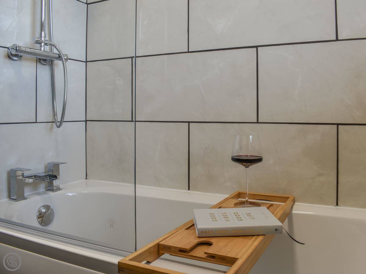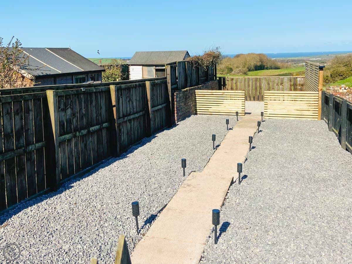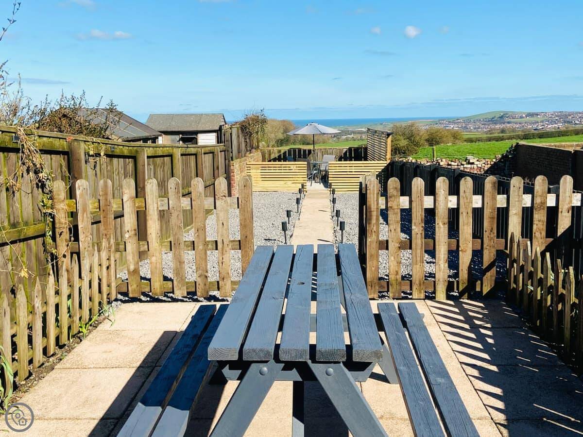 The kitchen is open plan with the dining area, where you can create all of your favourite meals. Stepping outside you have a small, enclosed patio area with a separate large lawned garden with views over the rolling countryside with the sea on the horizon. This outside space is glorious on a sunny day, where you can sit out and enjoy a cup of tea or coffee soaking up the sunshine. It also has a boot room/bike store perfect for storing your outdoor attire after a long day exploring.