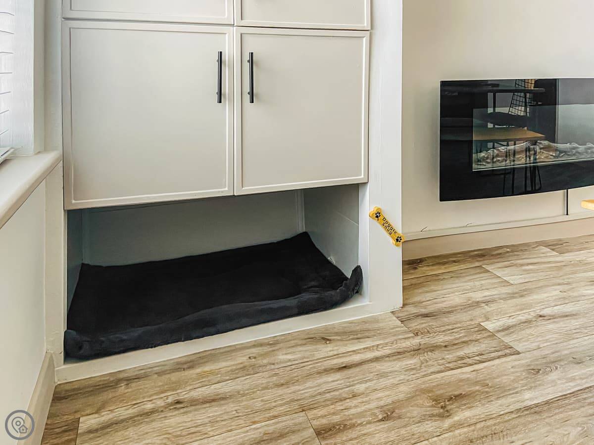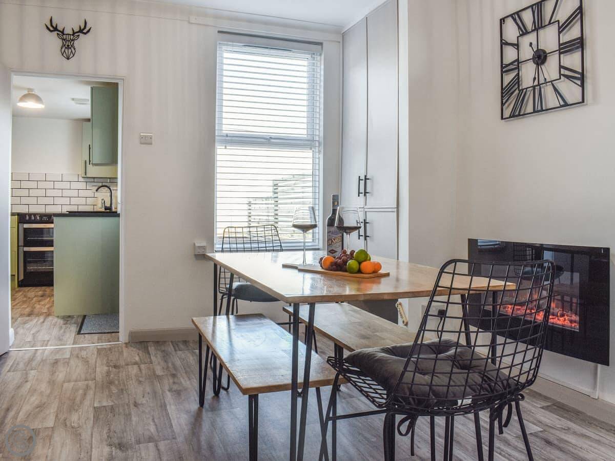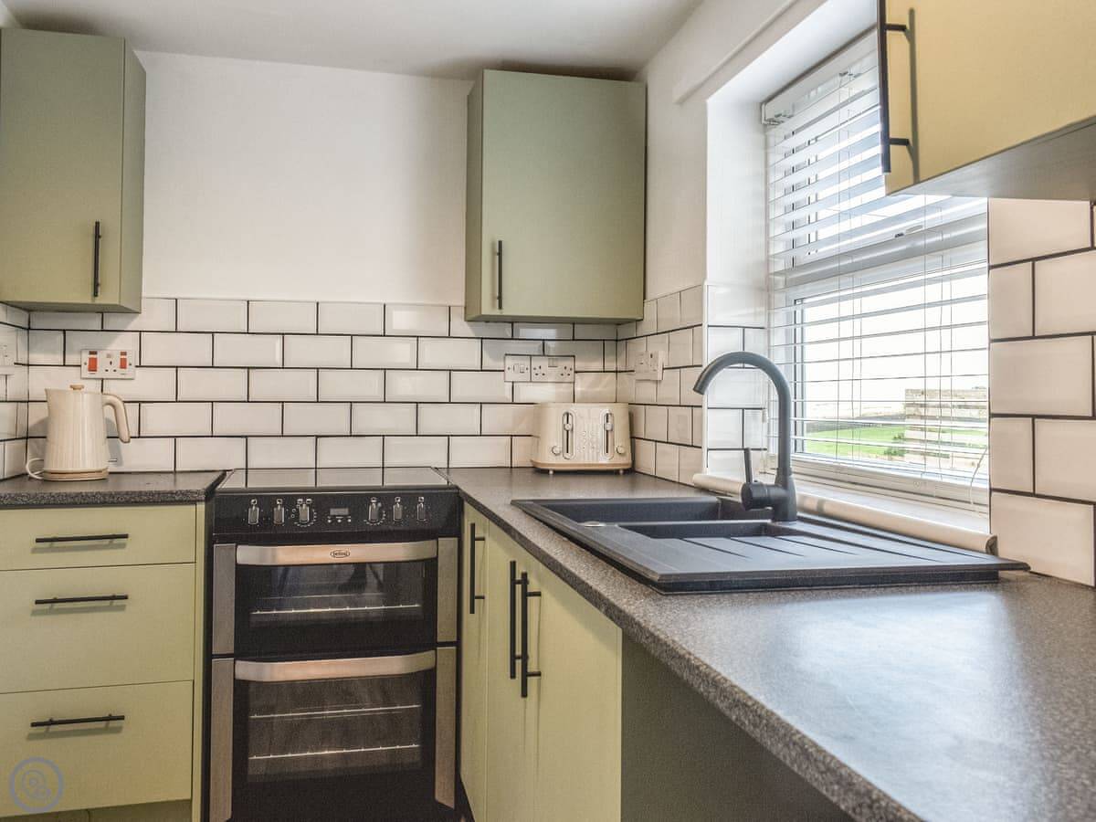 The kitchen is open plan with the dining area, where you can create all of your favourite meals. Stepping outside you have a small, enclosed patio area with a separate large lawned garden with views over the rolling countryside with the sea on the horizon. This outside space is glorious on a sunny day, where you can sit out and enjoy a cup of tea or coffee soaking up the sunshine. It also has a boot room/bike store perfect for storing your outdoor attire after a long day exploring.