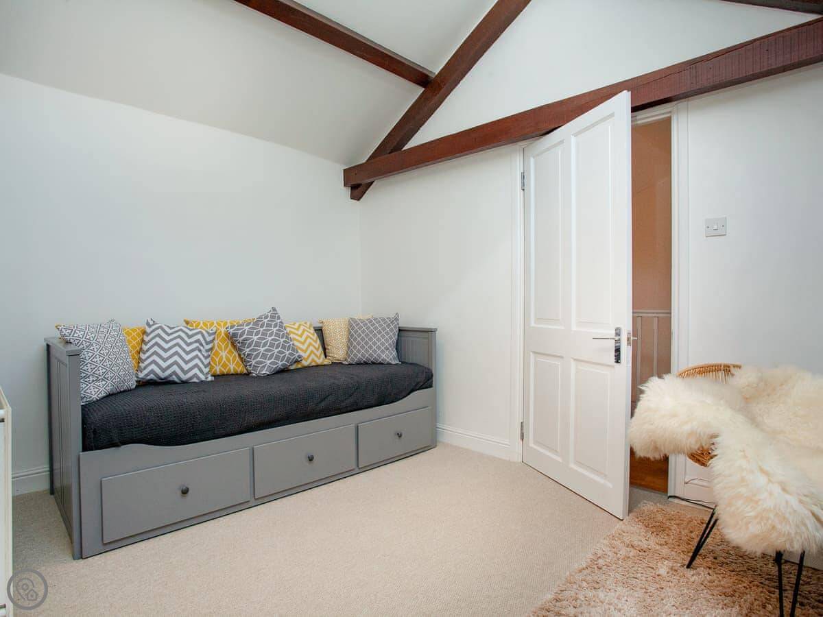 It sleeps four but there's only one bedroom. That bedroom has a super king-size bed that can be split into two singles. Then there's a day bed in the little area outside the bedroom, which is a double. So it's really best for two adults using the main bed, or a couple with two kids.