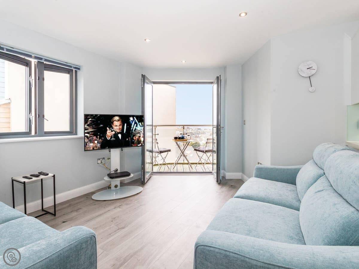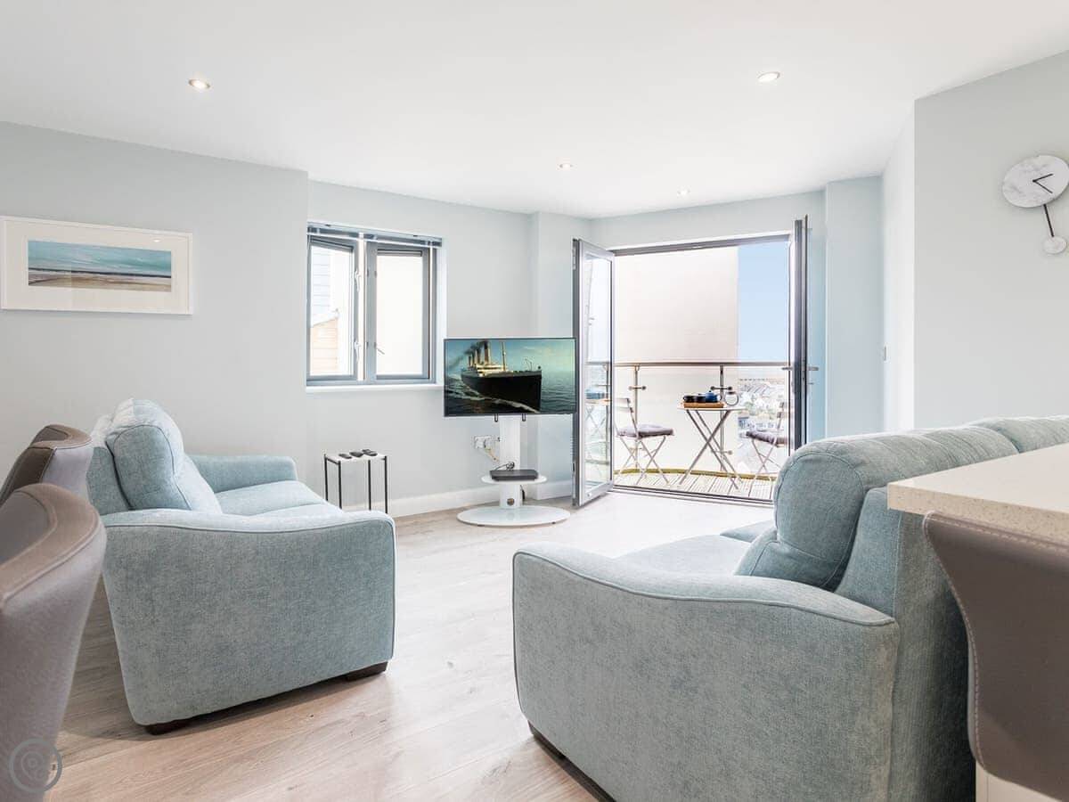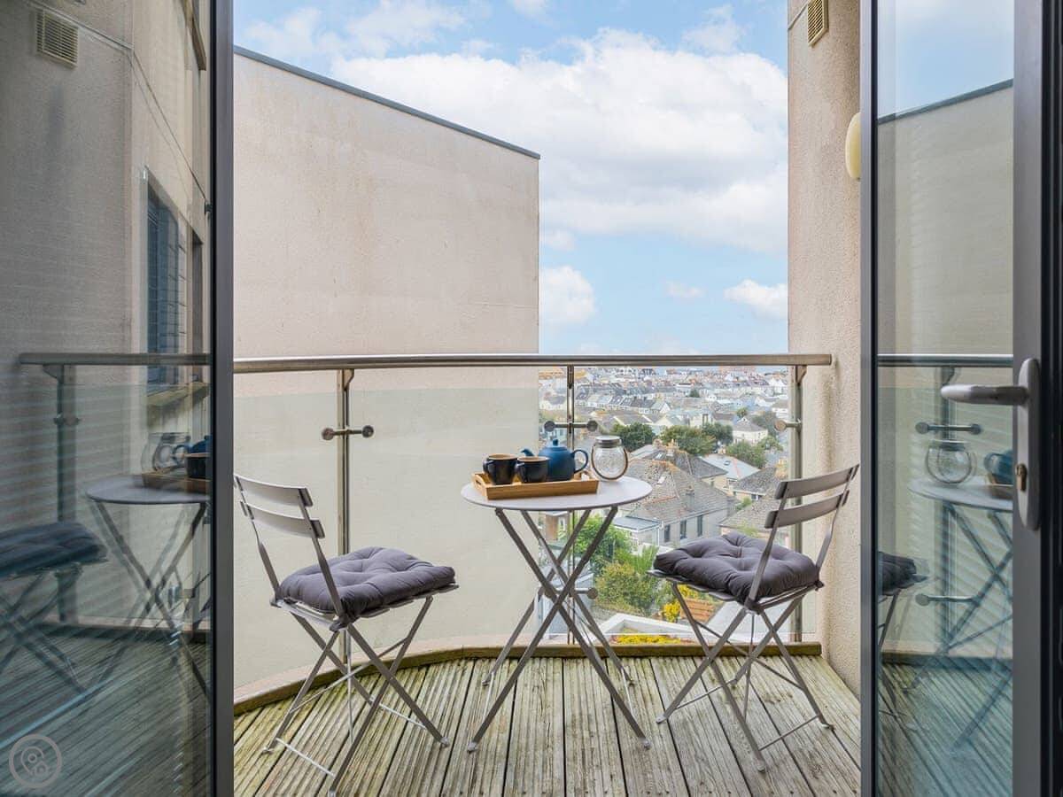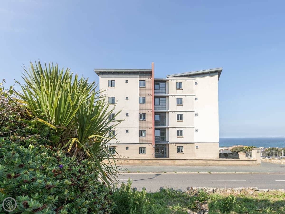 Apartment 19 is in a complex called Water's Edge, on the Pentire headland in Newquay. It's a third floor flat with a lift, so you don't have to carry bags up the stairs. You get a balcony that faces the sea. The view is north-east, over towards the headland.