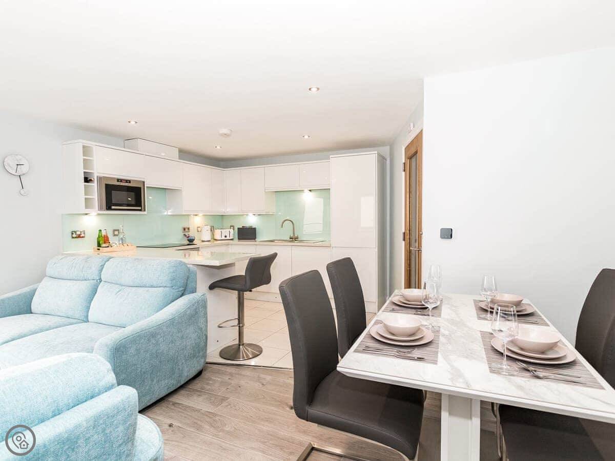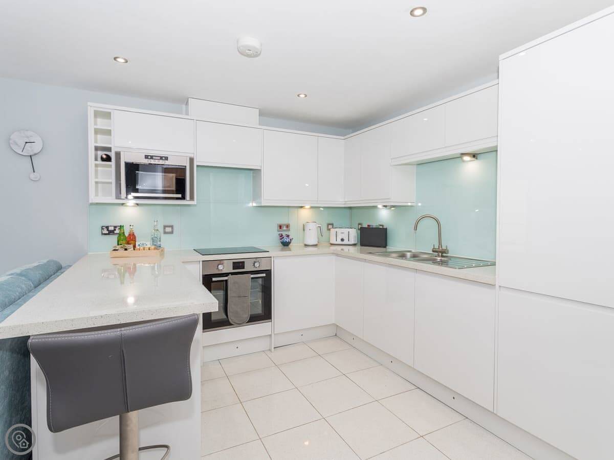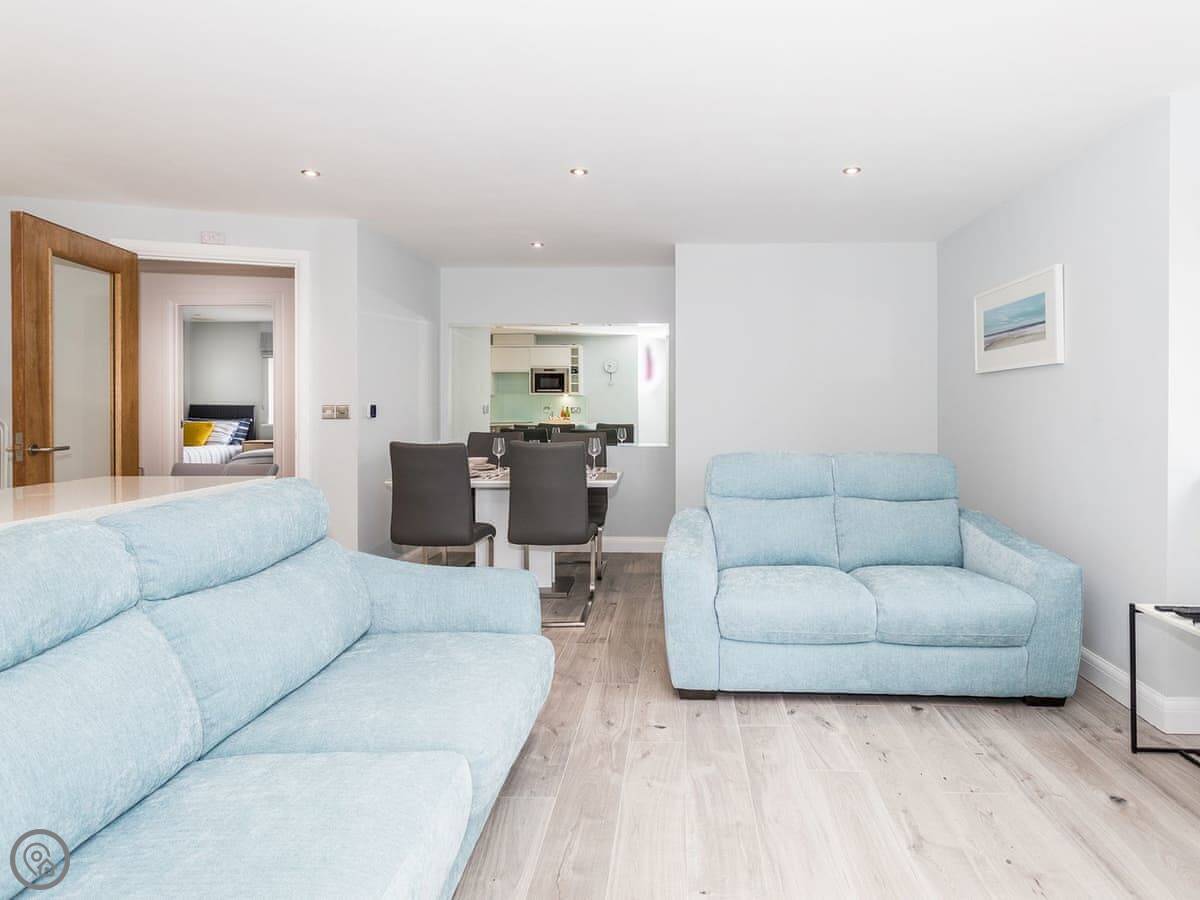 The living area is open plan. There are two sofas and a TV with Sky, including the Sports and Movies channels. Both bedrooms have a TV with Sky as well. The kitchen has a dishwasher and there's a washing machine.