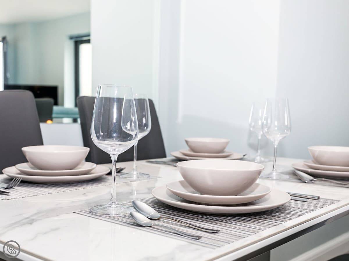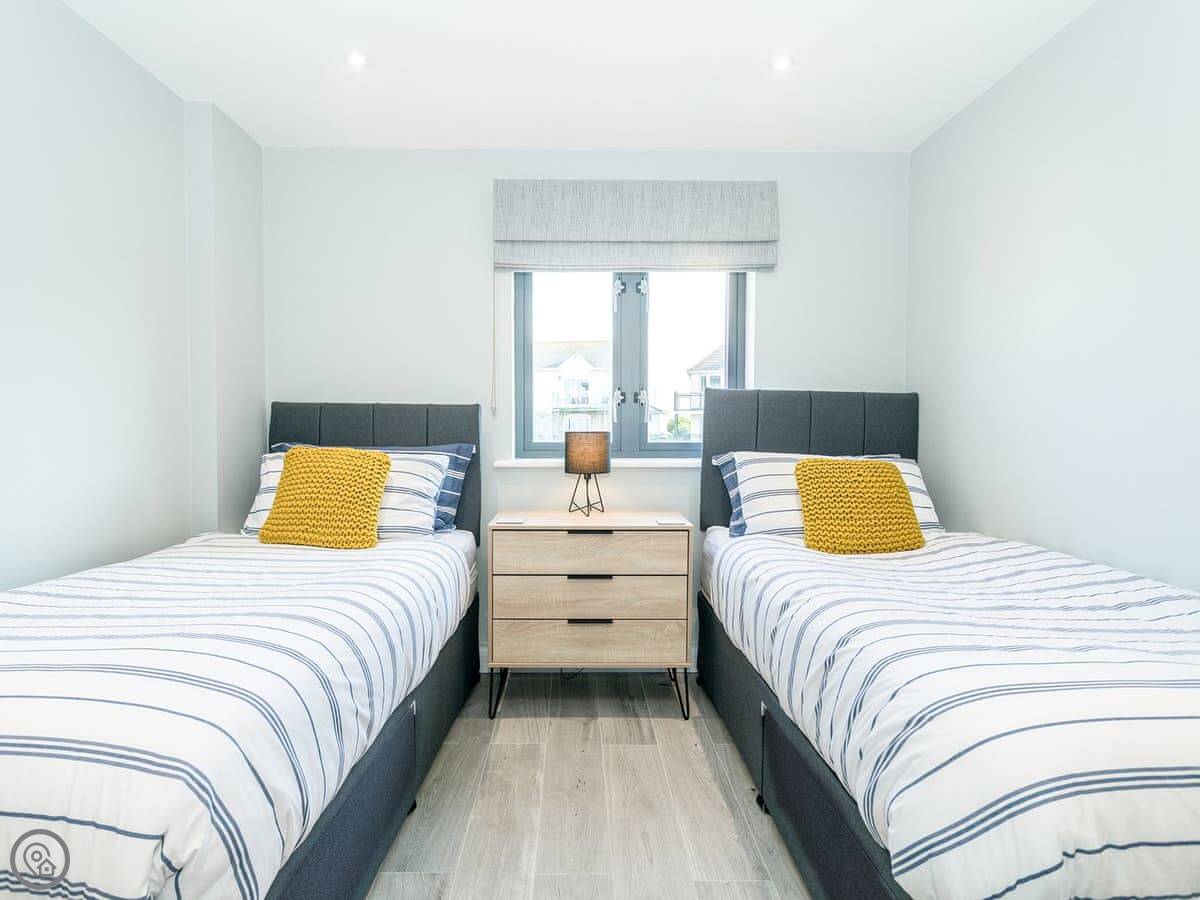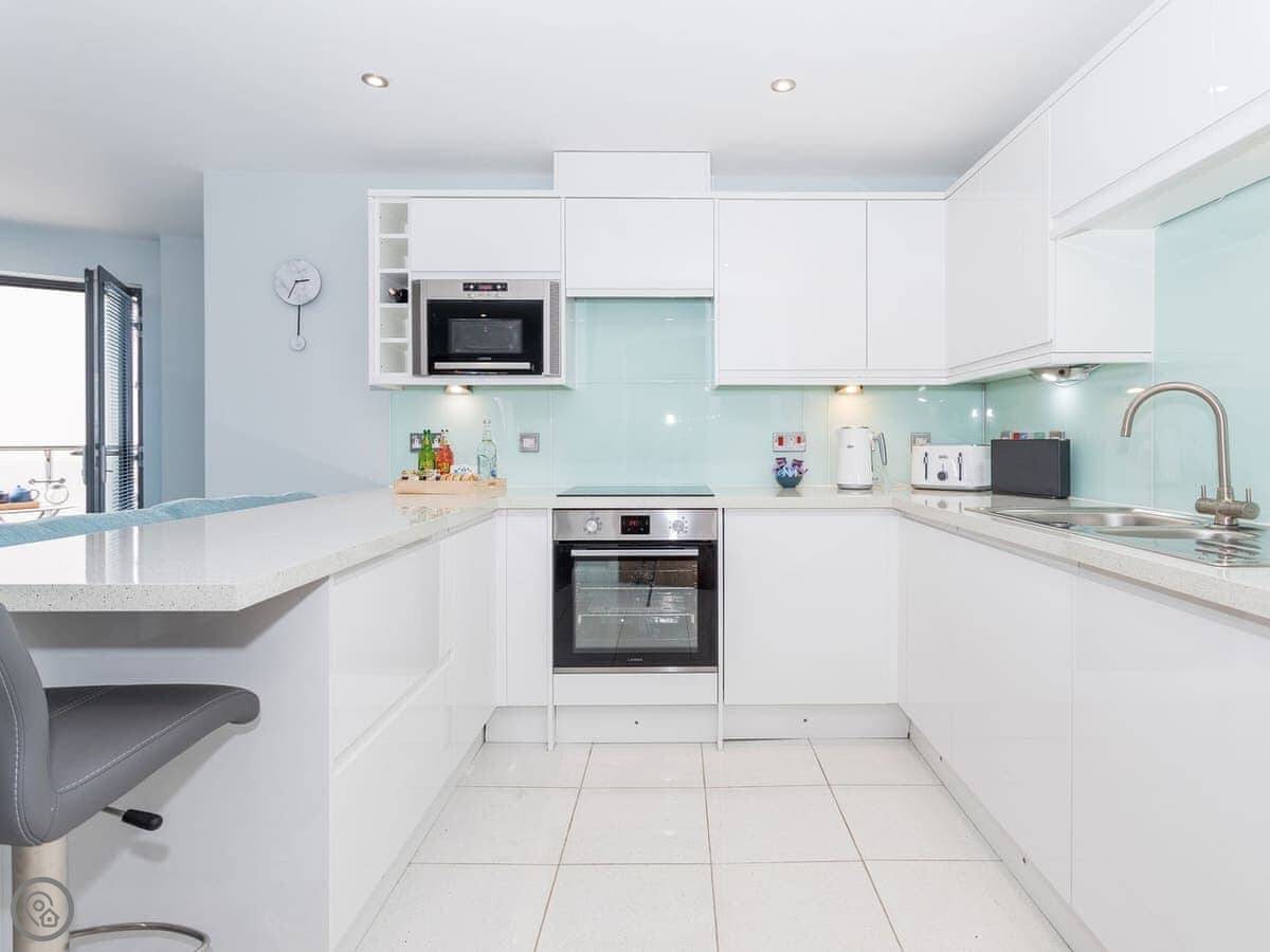 The living area is open plan. There are two sofas and a TV with Sky, including the Sports and Movies channels. Both bedrooms have a TV with Sky as well. The kitchen has a dishwasher and there's a washing machine.