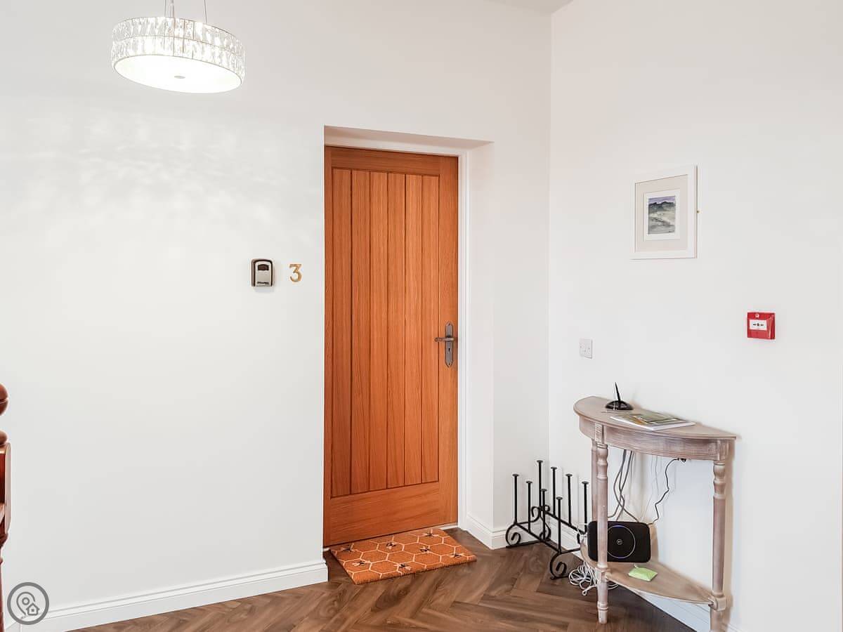 This is Invergyle. It's a modern two-bedroom apartment on the first floor of a big old building called Liquorstane House in Falkland. The building used to be a hotel and a masonic lodge. There's a pharmacy on the ground floor now. You'll see the original staircase in the entrance hall, they've kept that. The apartment itself is light, with good-sized windows.