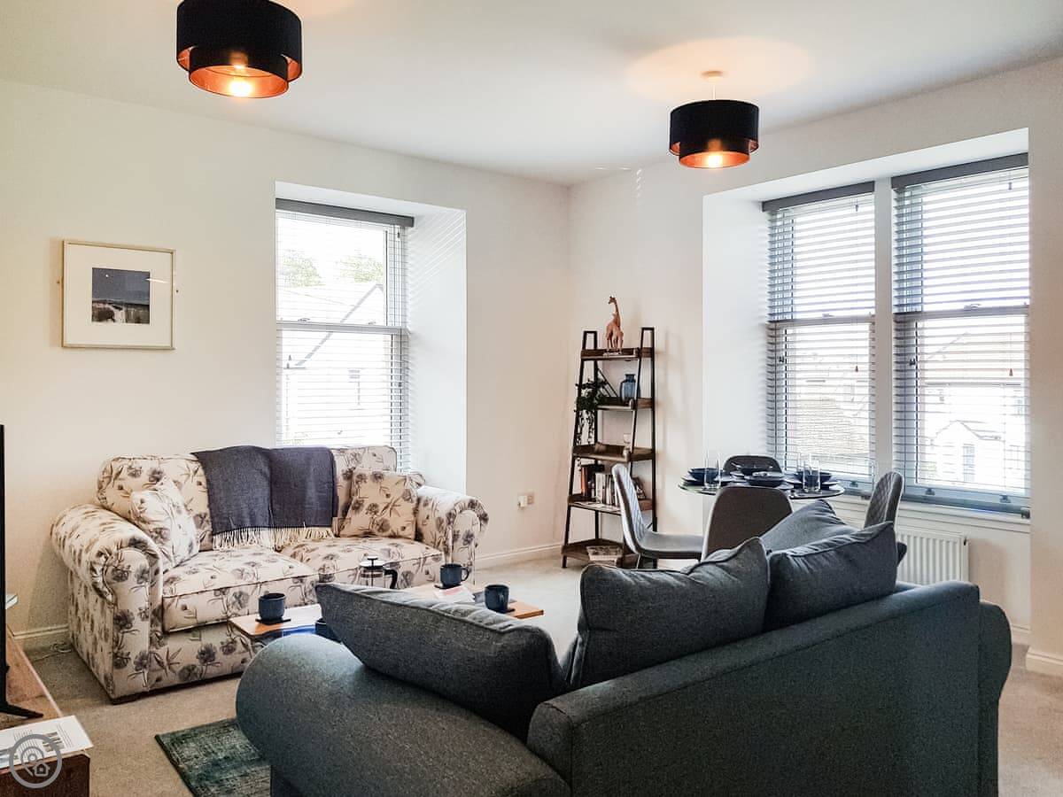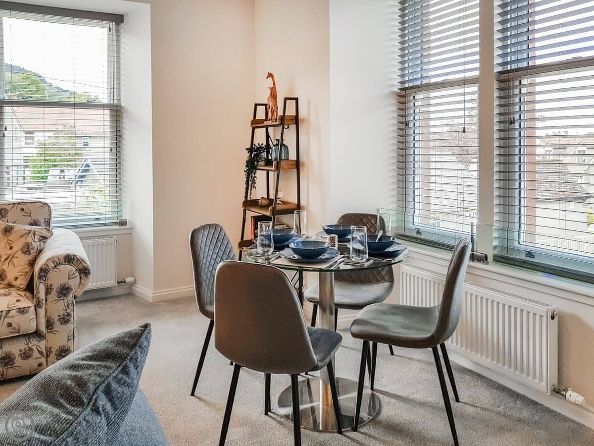It's a two bedroom flat, sleeps four. One king-size bed that can be made into twins if you ask ahead, and one double. There's one bathroom with a shower. It's got a 4 Star rating, so it's comfortable and well done. The living area is open plan with a dining space. The windows are big, so it's light. From the top flat you can see the palace.