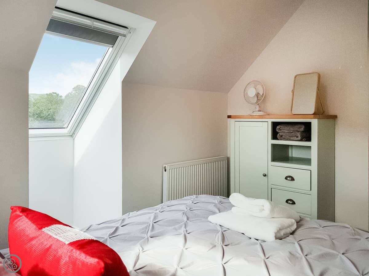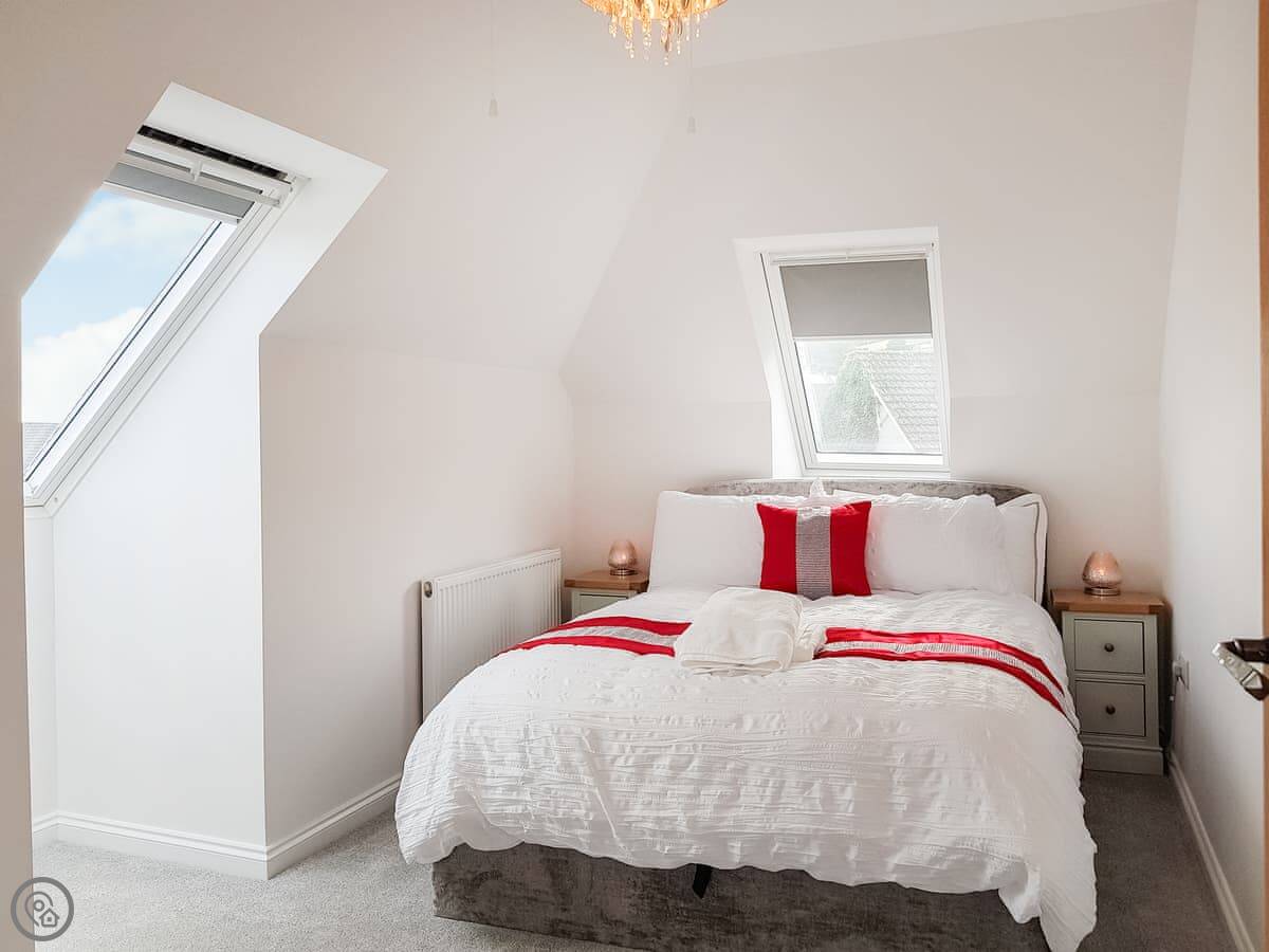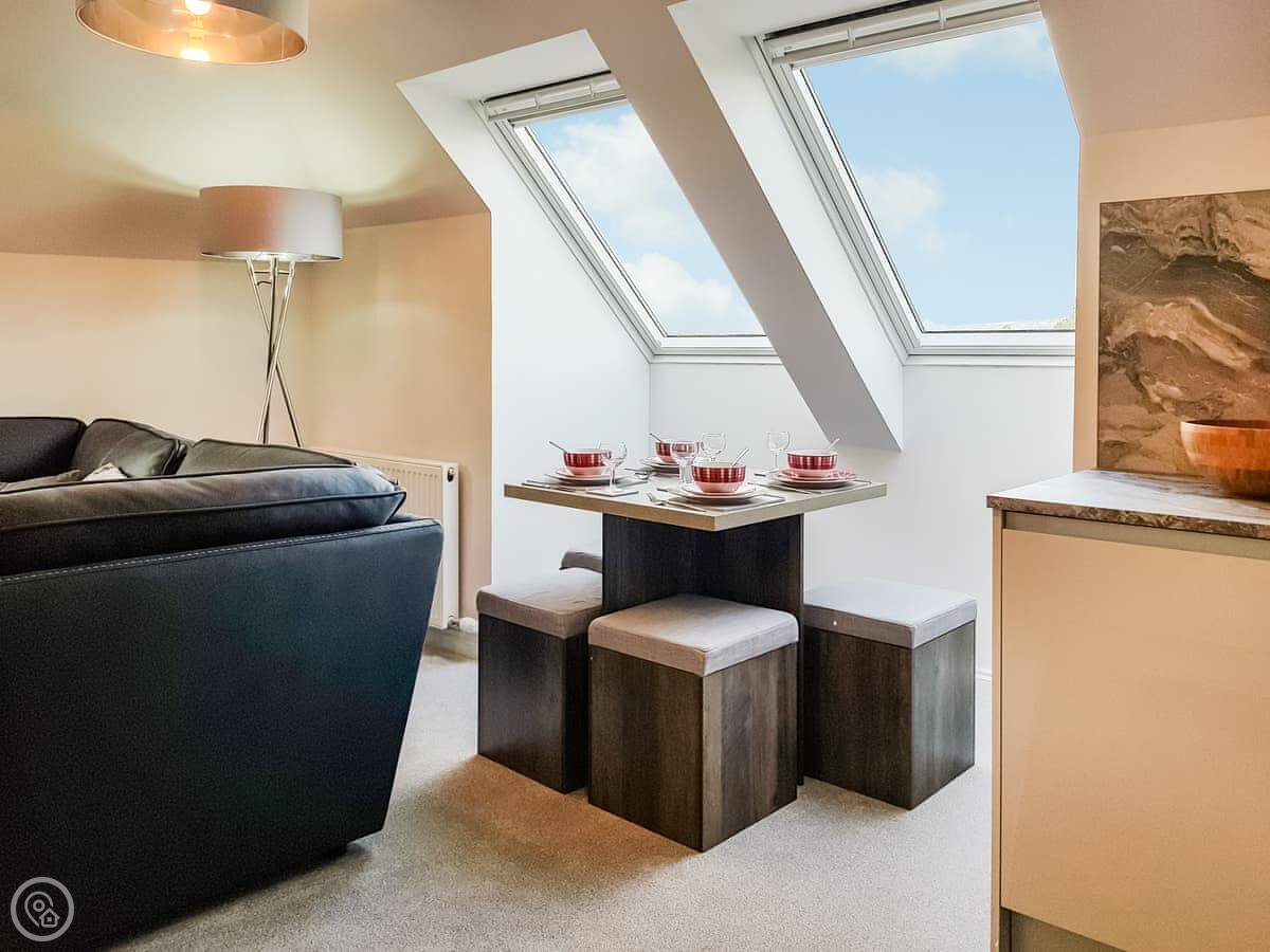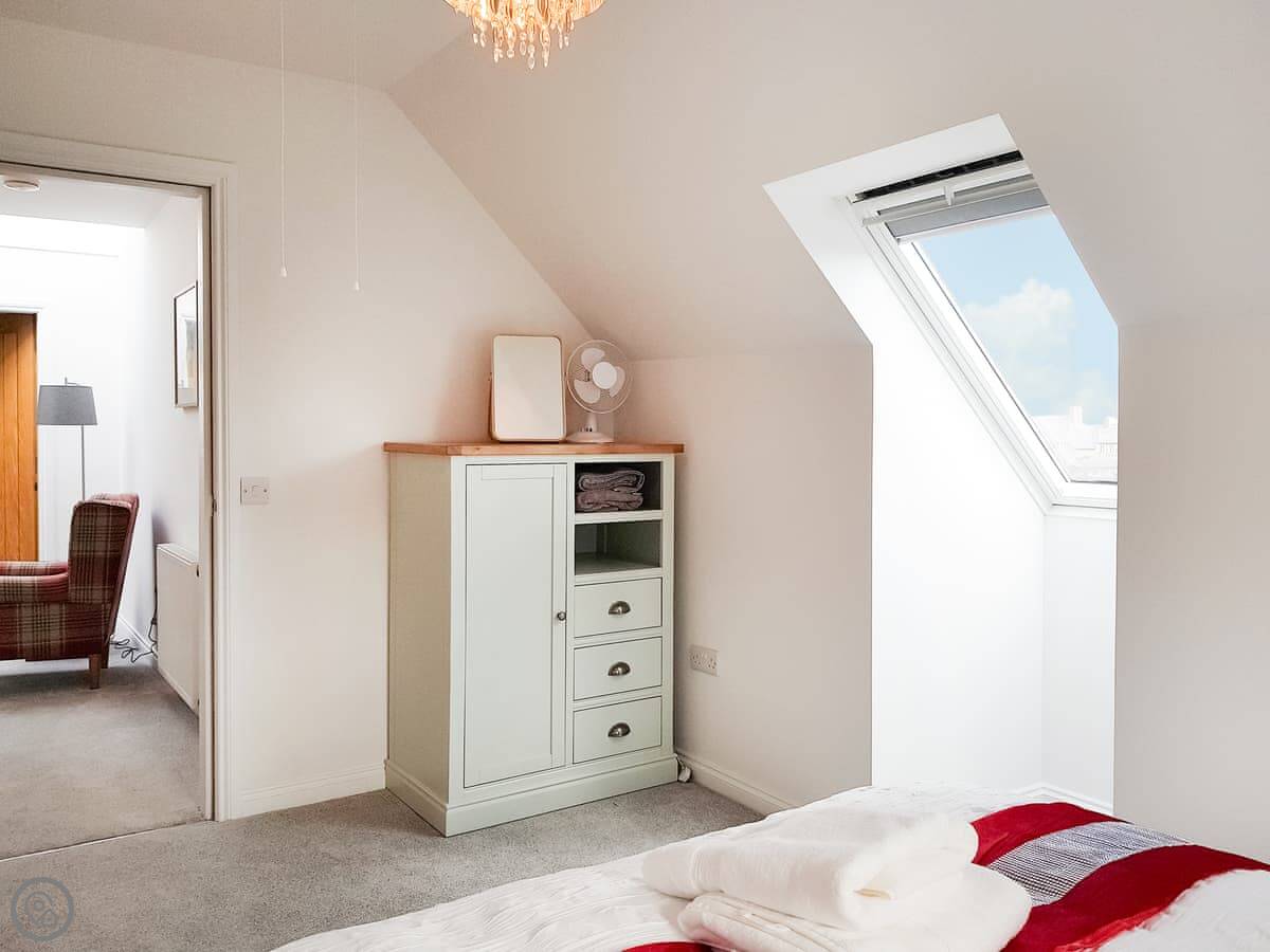 It sleeps four. Two double bedrooms and one bathroom. It's got a 4 Star rating, so it's comfortable and well looked after. The windows are big, so it's bright inside. You can see the palace from the living room window.