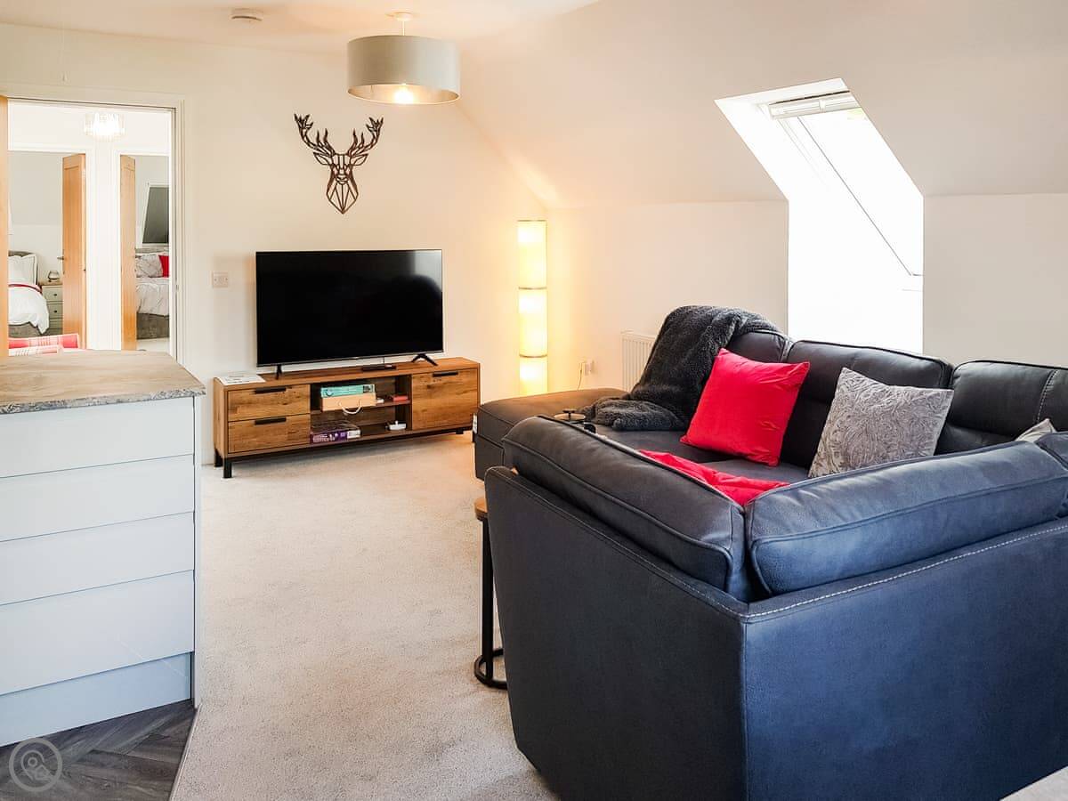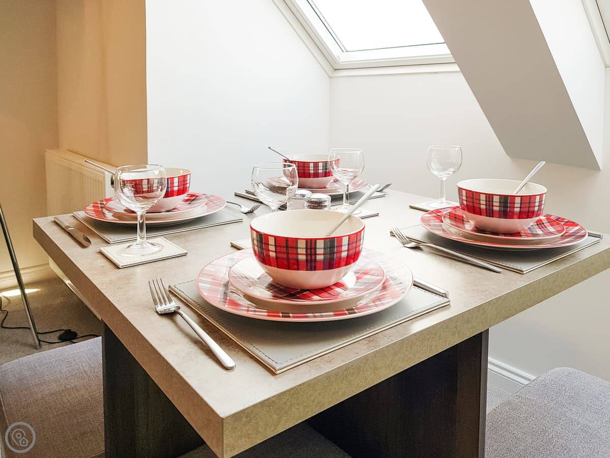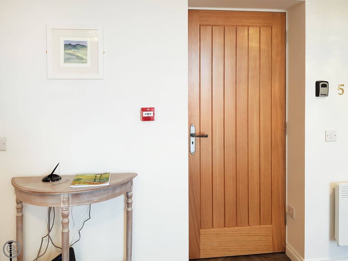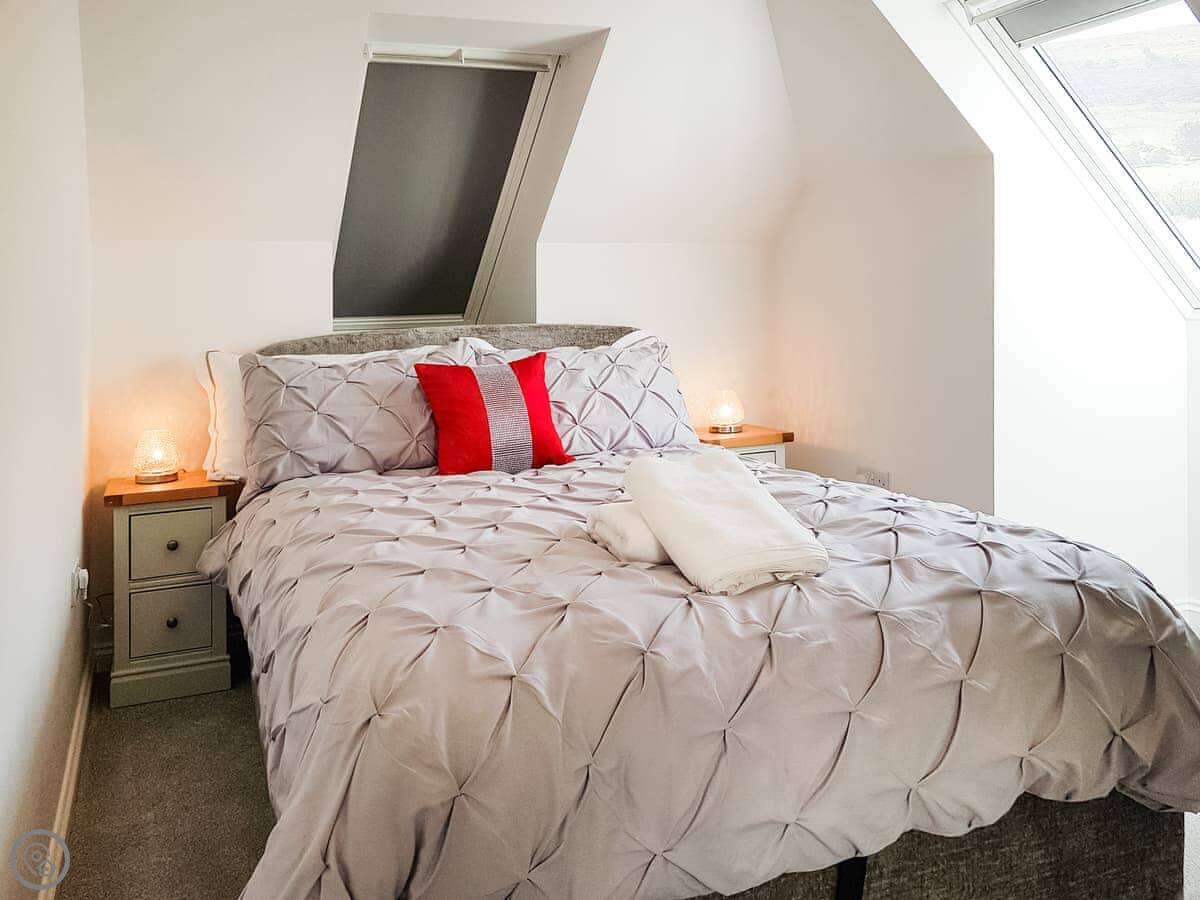 It sleeps four. Two double bedrooms and one bathroom. It's got a 4 Star rating, so it's comfortable and well looked after. The windows are big, so it's bright inside. You can see the palace from the living room window.