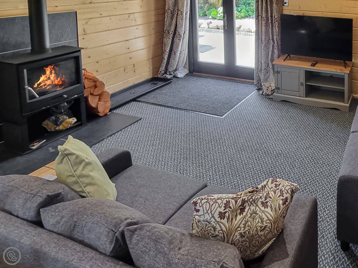 Inside, it's all open plan. The living area has a wood burner. The kitchen has a dishwasher and a slow cooker. There's WiFi and a TV.