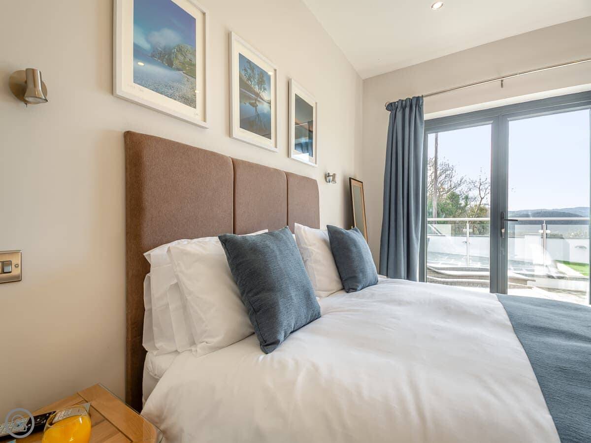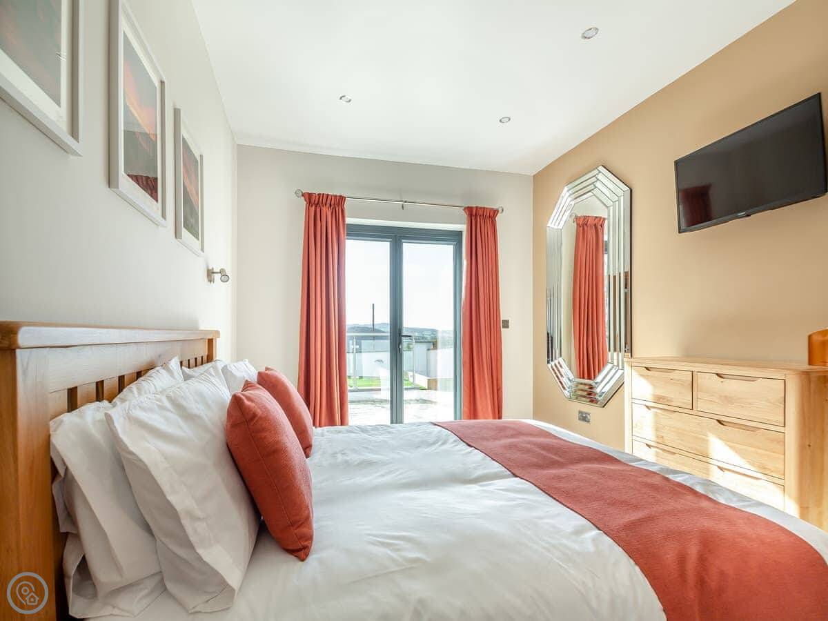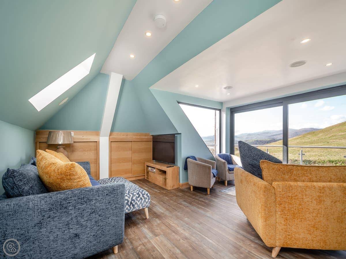 It sleeps six. Three bedrooms downstairs, two kings and a super king that can be two twins. One shower room down there too. It's a 5 Star place, which just means it's well finished and has everything you'd need. The layout is reverse-level, so you live upstairs and sleep downstairs.