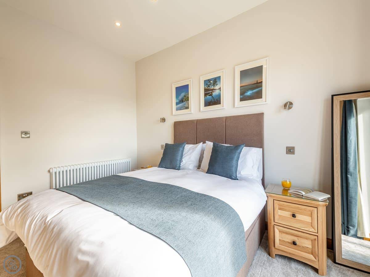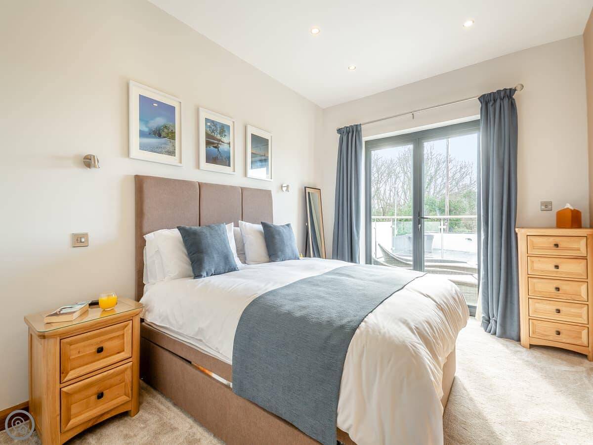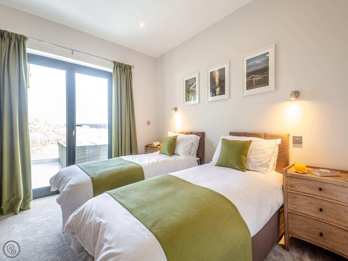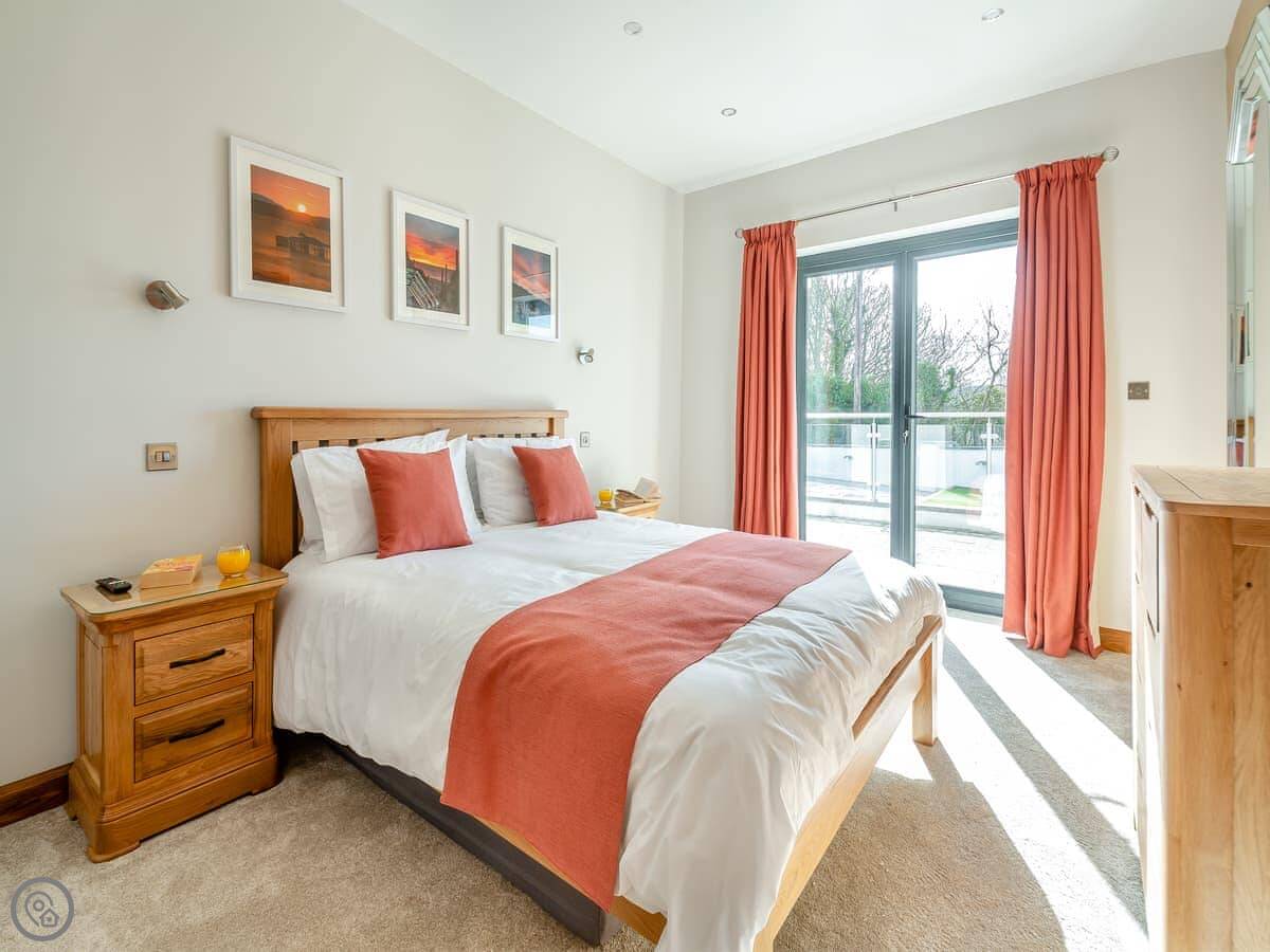 It sleeps six. Three bedrooms downstairs, two kings and a super king that can be two twins. One shower room down there too. It's a 5 Star place, which just means it's well finished and has everything you'd need. The layout is reverse-level, so you live upstairs and sleep downstairs.