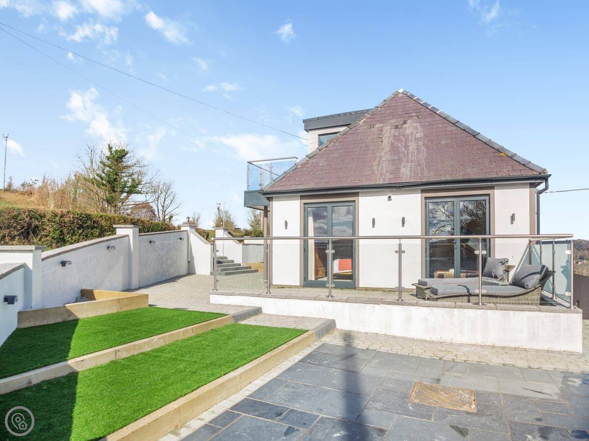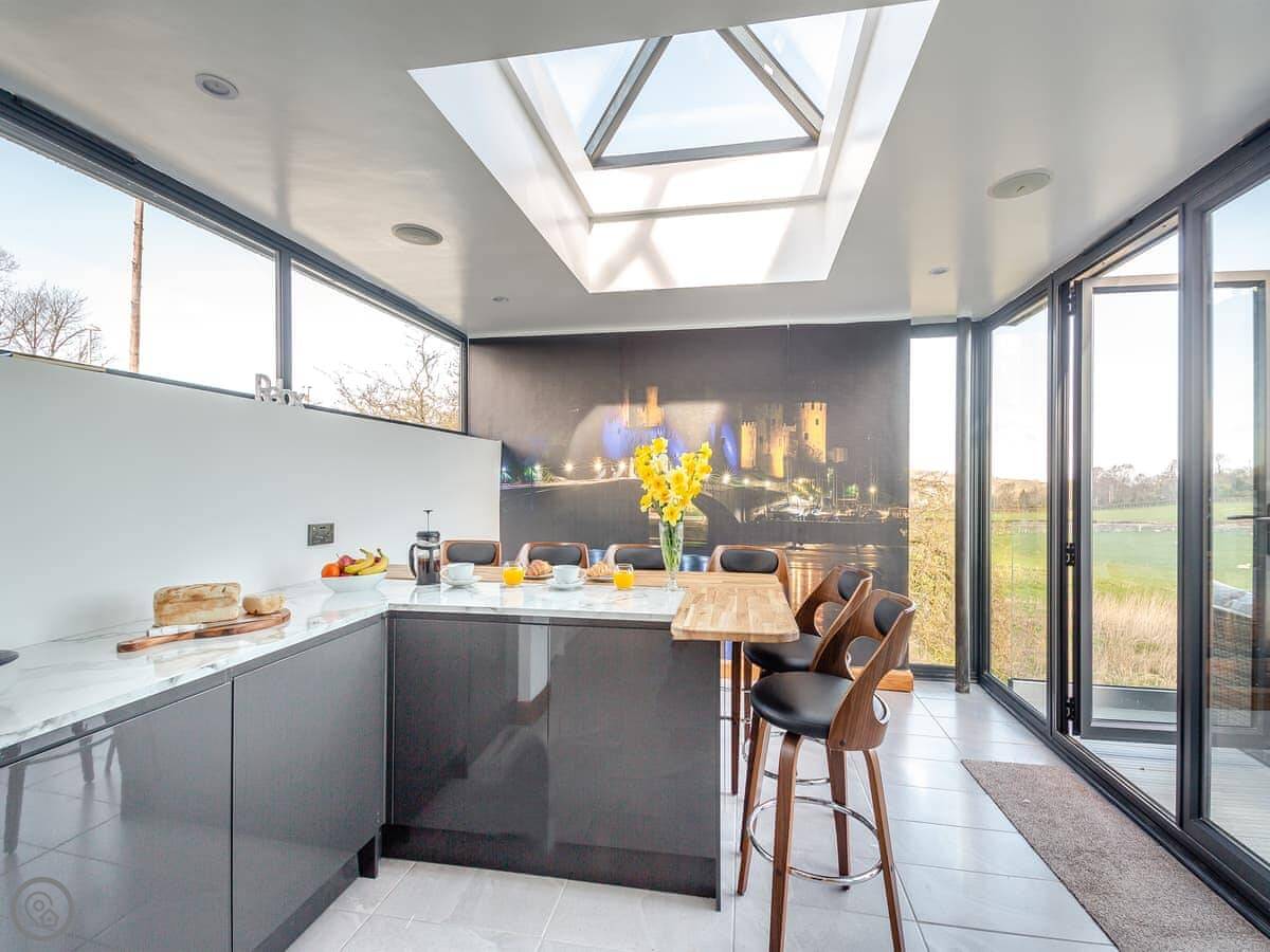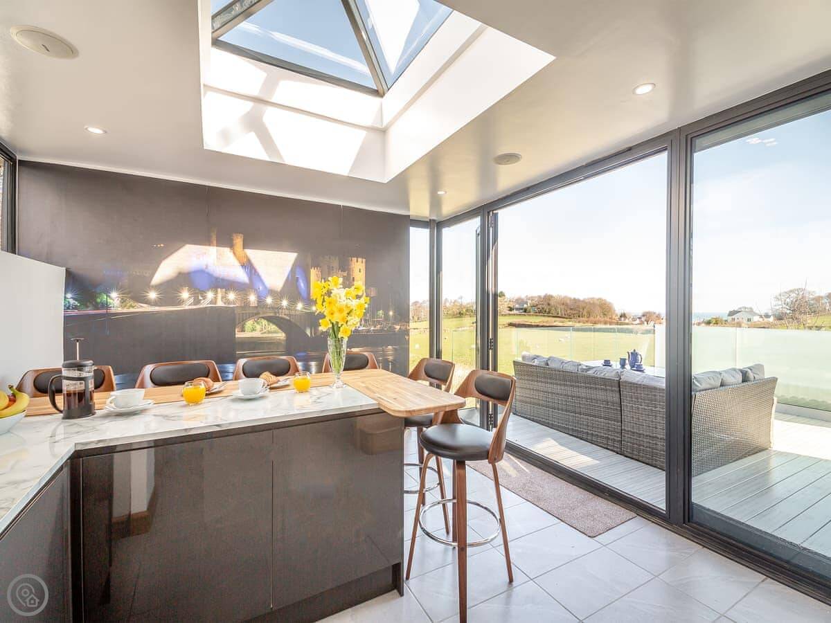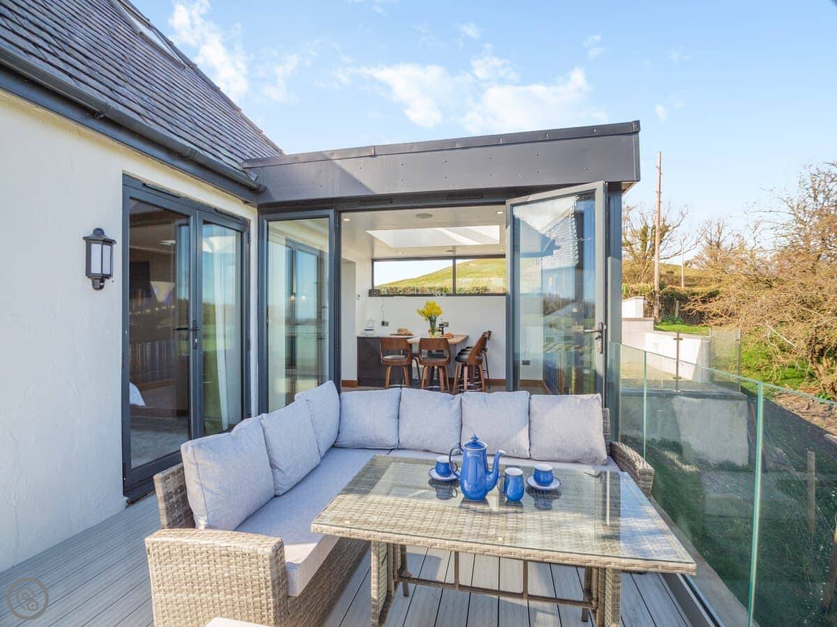 The kitchen is modern and has a dishwasher and washing machine. Patio doors open onto a raised deck with seating. It's a sunny spot. We've put speakers throughout the house, you connect to them with your phone. There's a Smart TV and some board games.