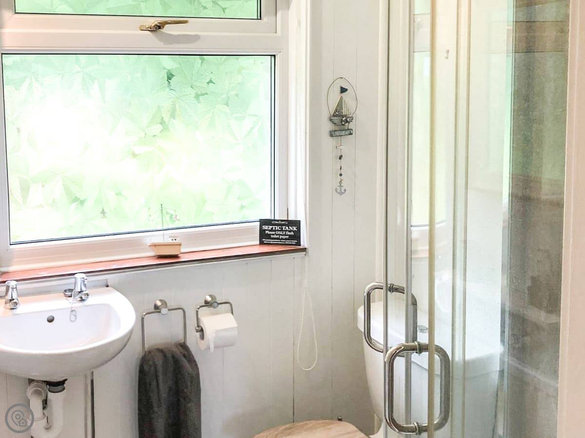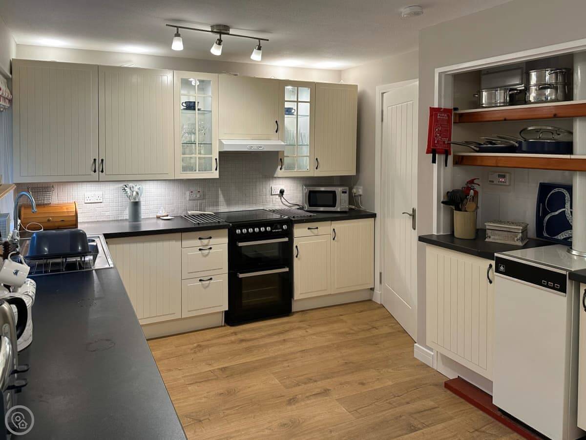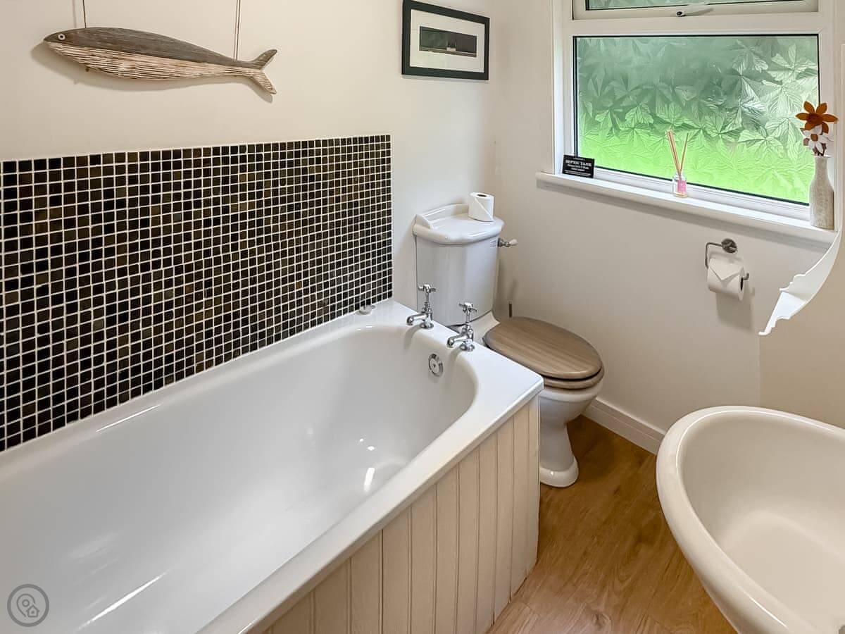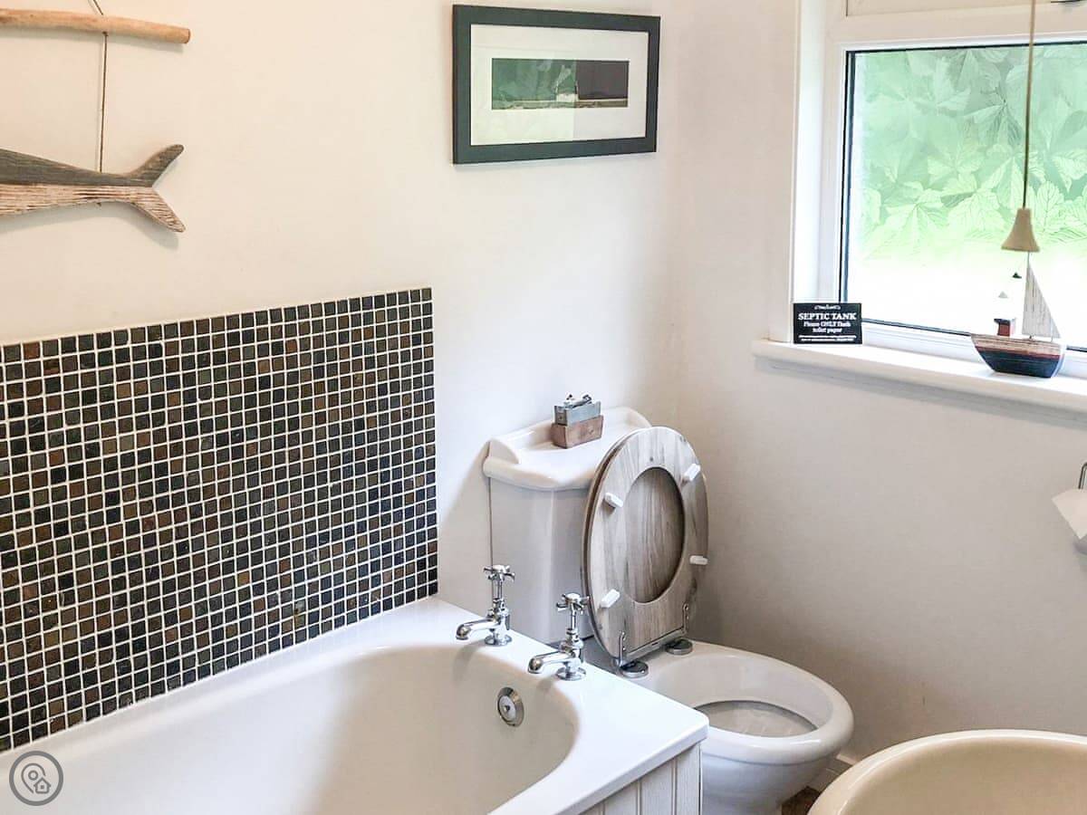 The living room has a wood burner. Doors lead out to a decked balcony at the side. It gets the afternoon sun. The garden is mainly lawn, with a bench. You can park a couple of cars on the gravel drive.