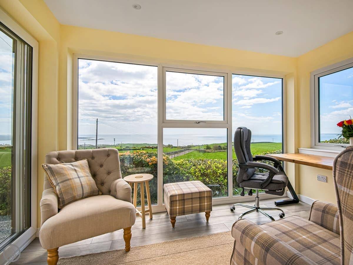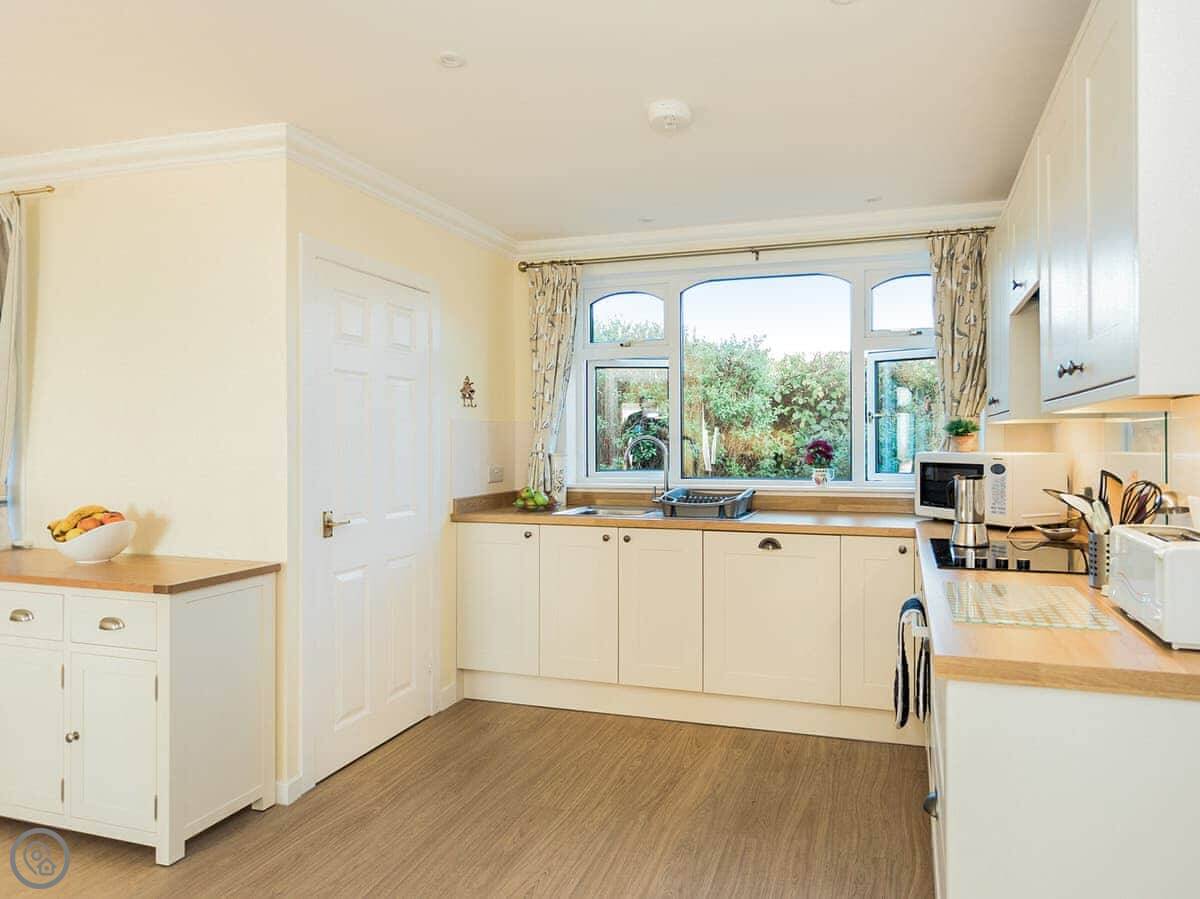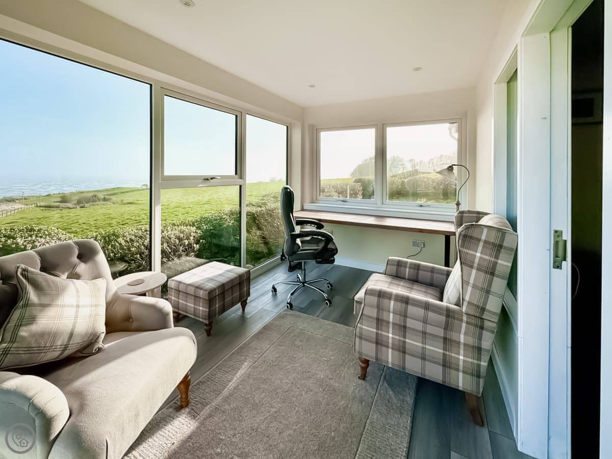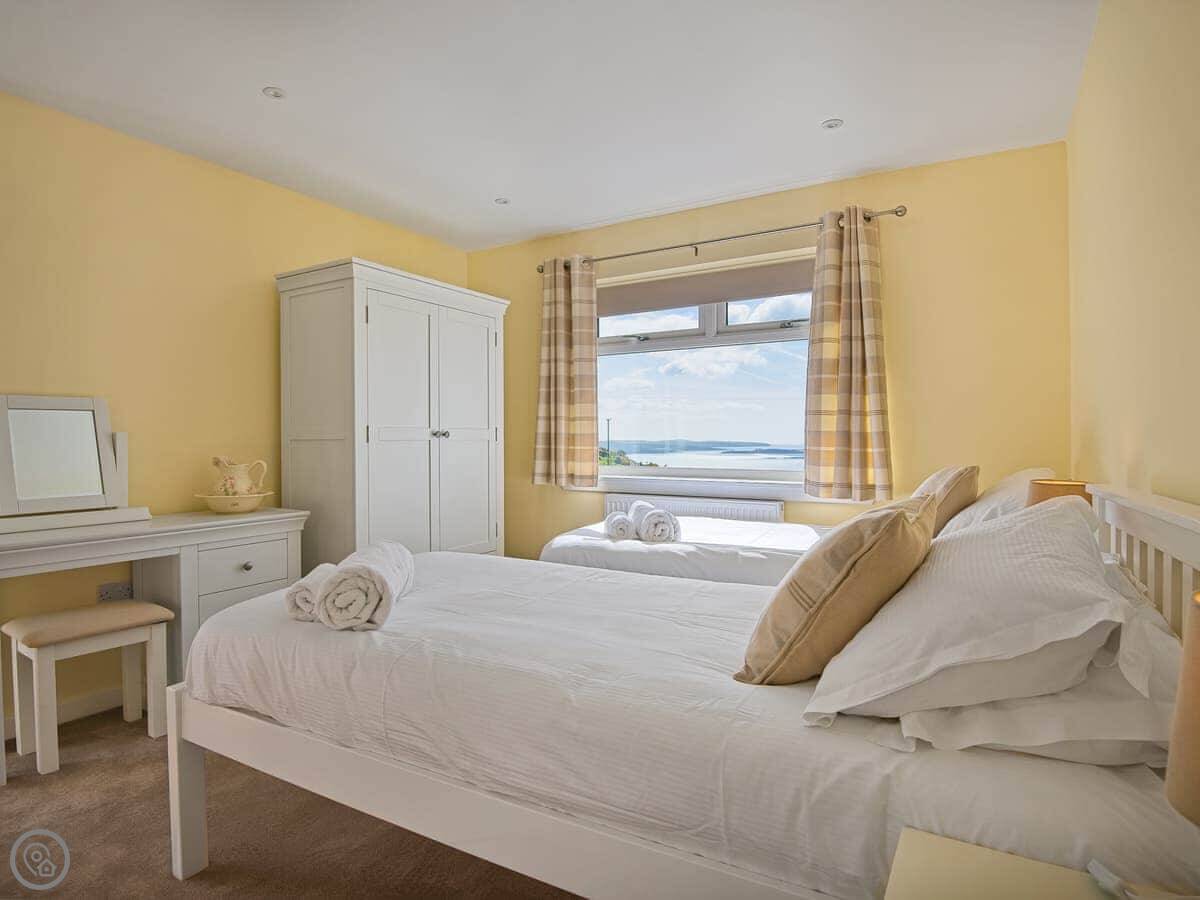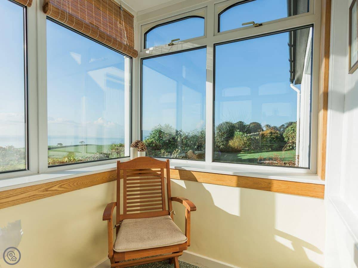 The main thing is the view. You get it from the living room, the sun room, and all the bedrooms. There's a wood burner for cool evenings. The kitchen has everything you'd need. The stairs are the normal cottage sort.