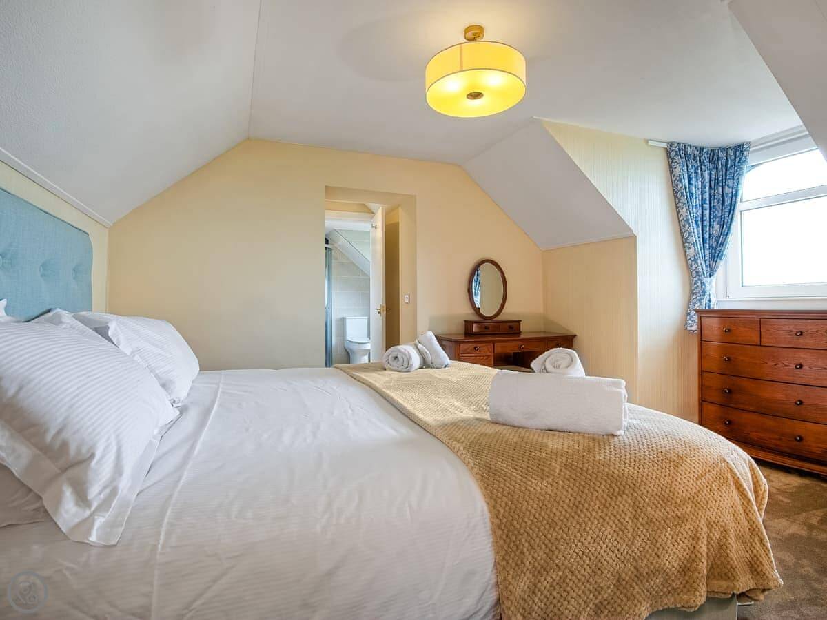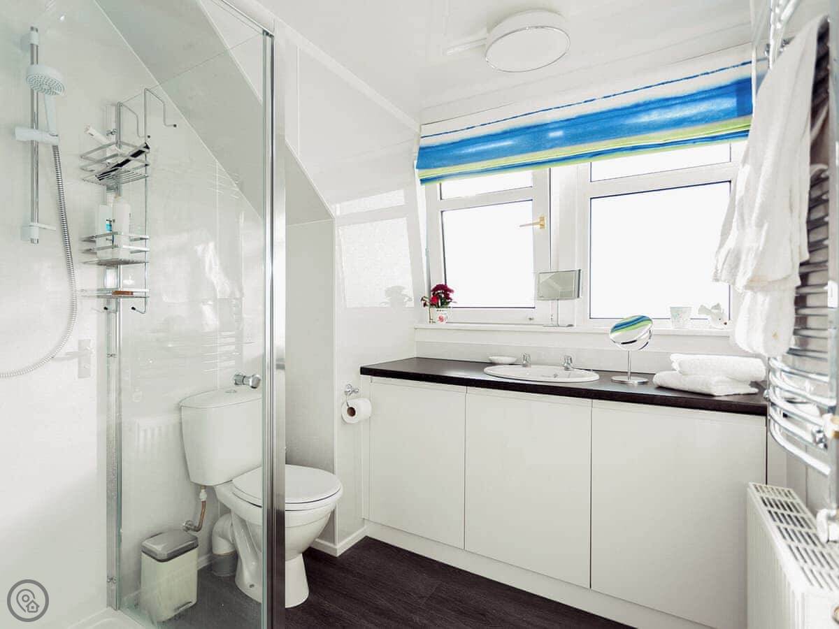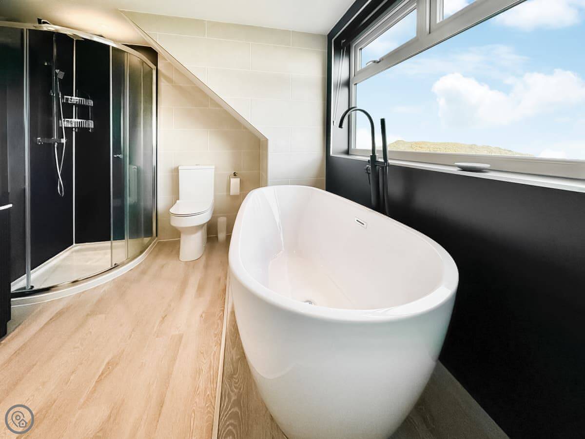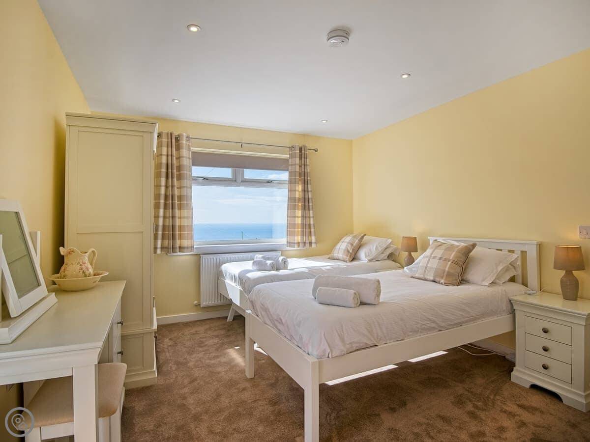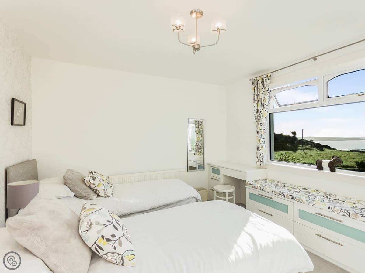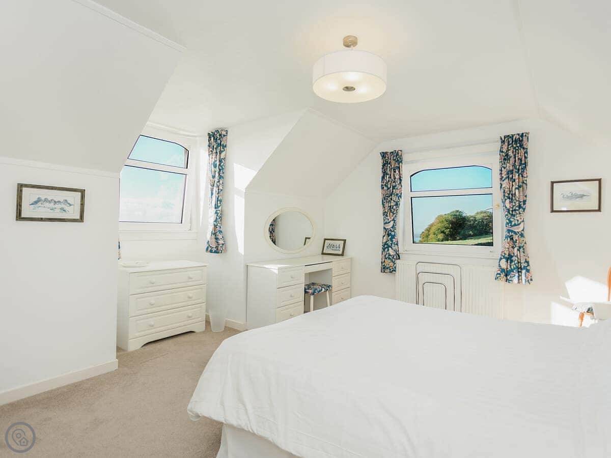The main thing is the view. You get it from the living room, the sun room, and all the bedrooms. There's a wood burner for cool evenings. The kitchen has everything you'd need. The stairs are the normal cottage sort.