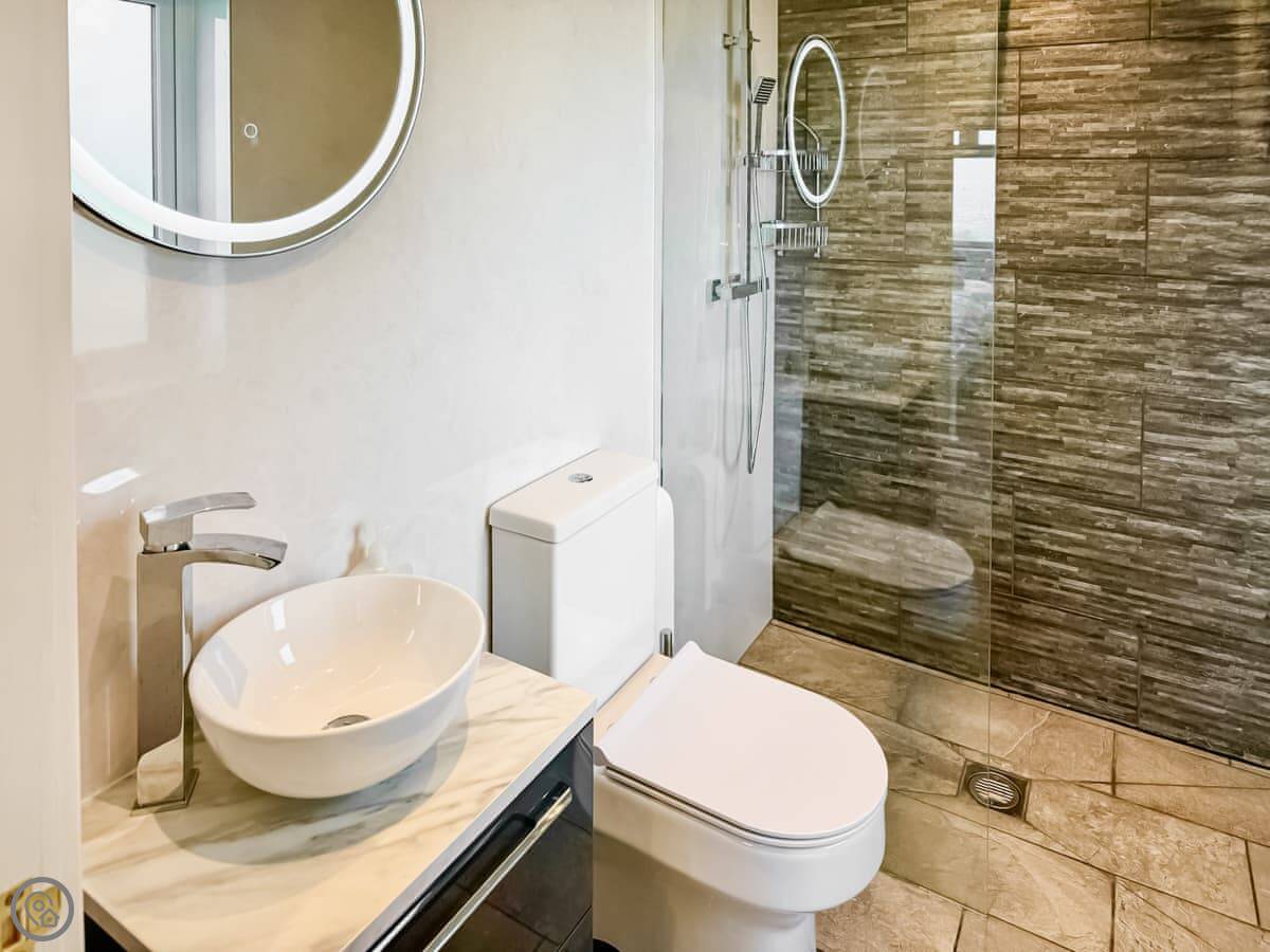 It sleeps eight. There are four bedrooms and four bathrooms, which helps with a group. Two bedrooms are downstairs. It's a 4 Star place, so it's nicely finished and comfortable.