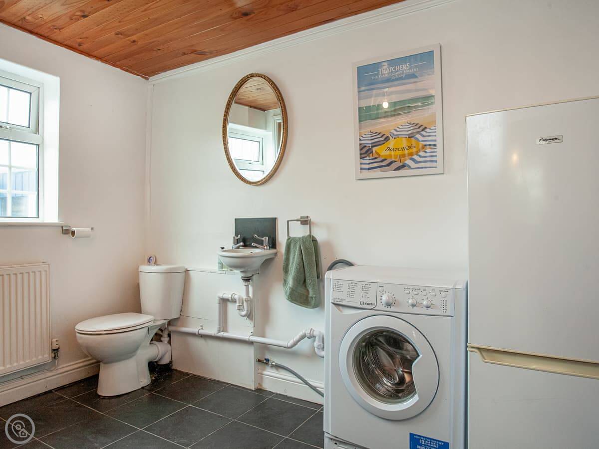 There's a good-sized kitchen with a table, and a utility room with the washing machine. The living room is through there. The conservatory leads out to the garden. We've left a BBQ out there if you want to use it.