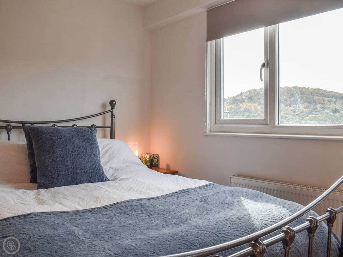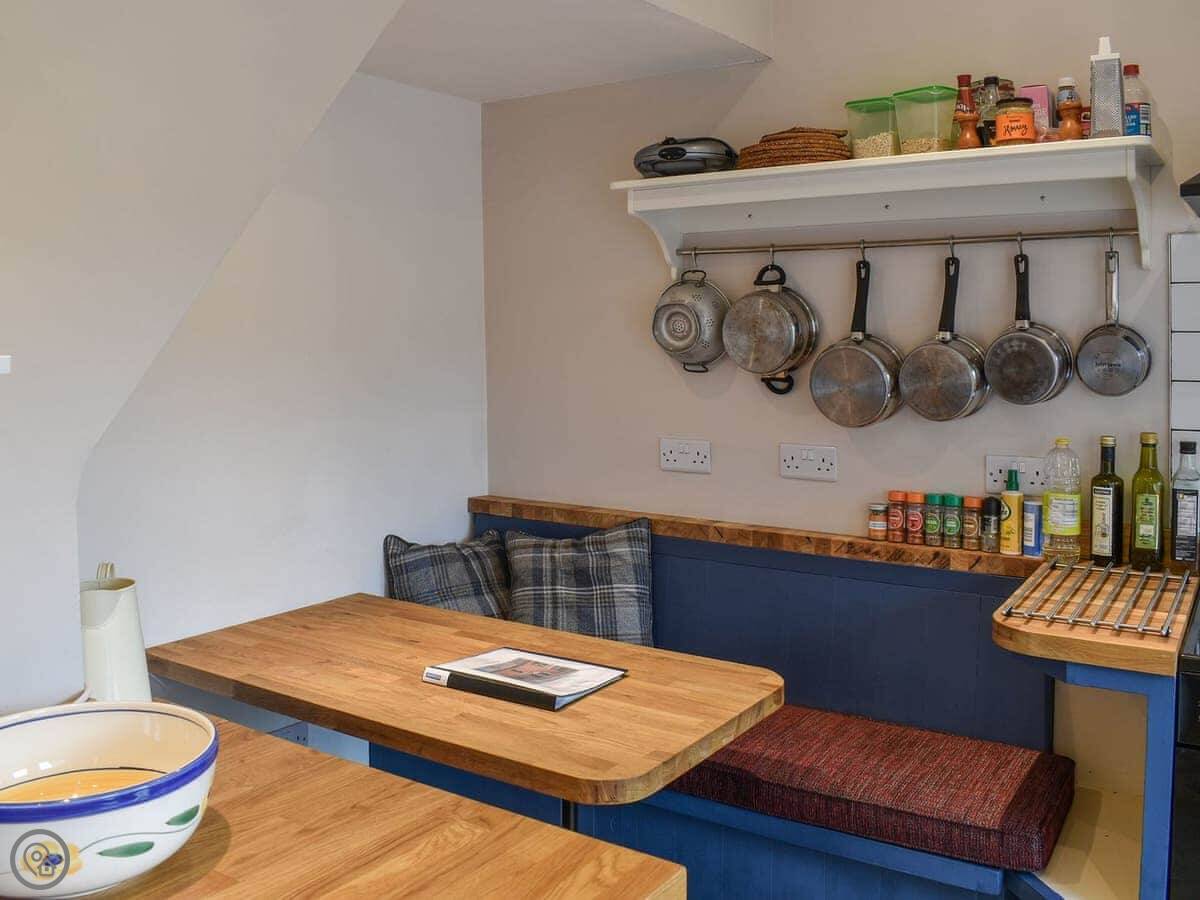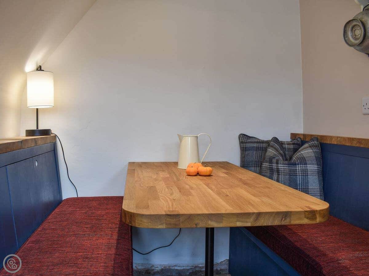 The living room has a wood burner. The kitchen is compact, but it's got a dishwasher and a washing machine. There's a quirky dining booth by the window with a great view.