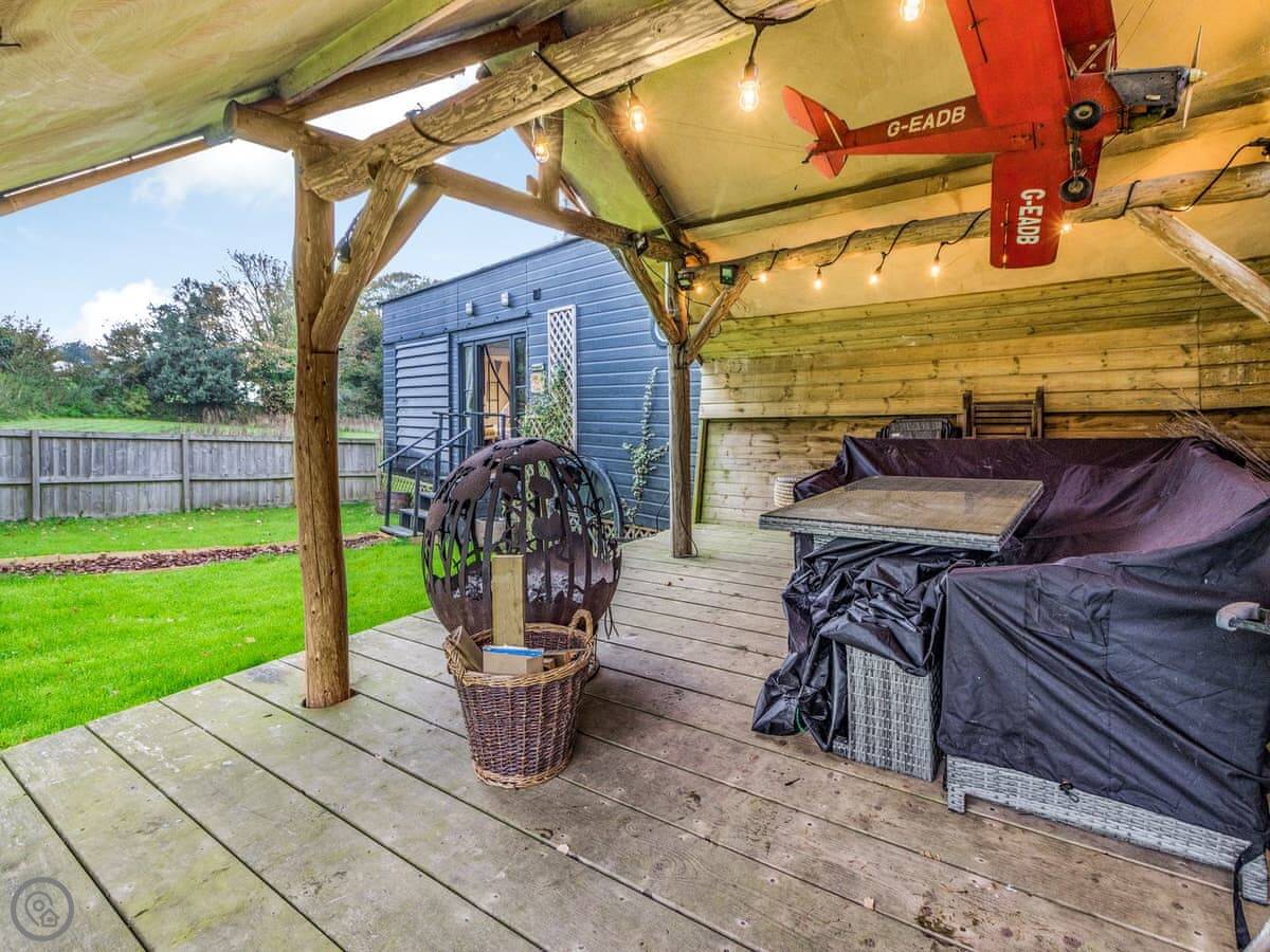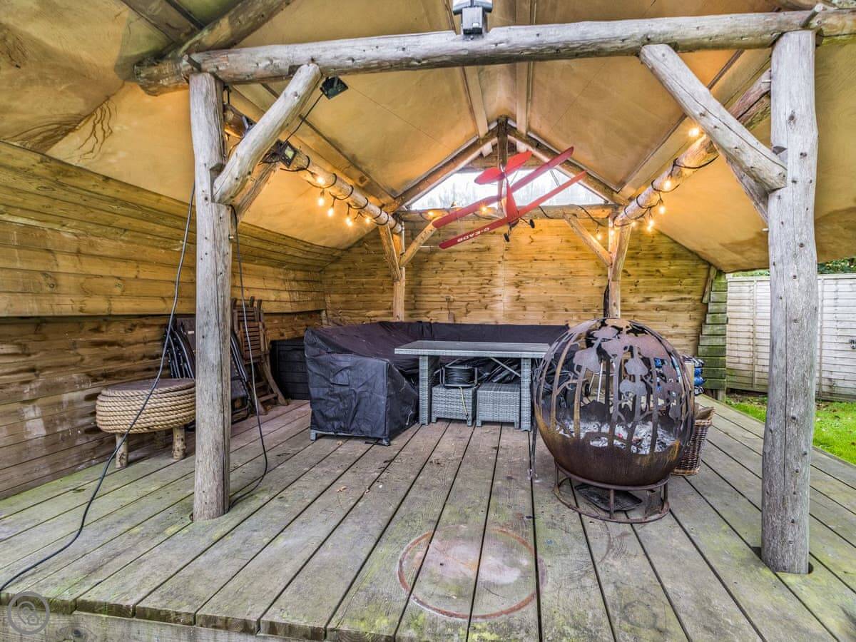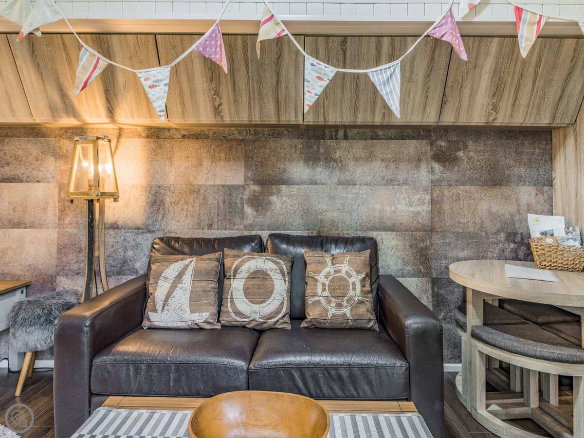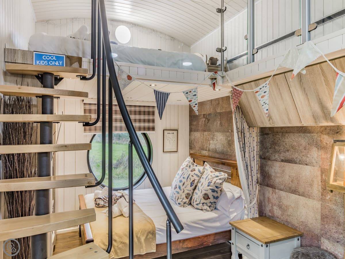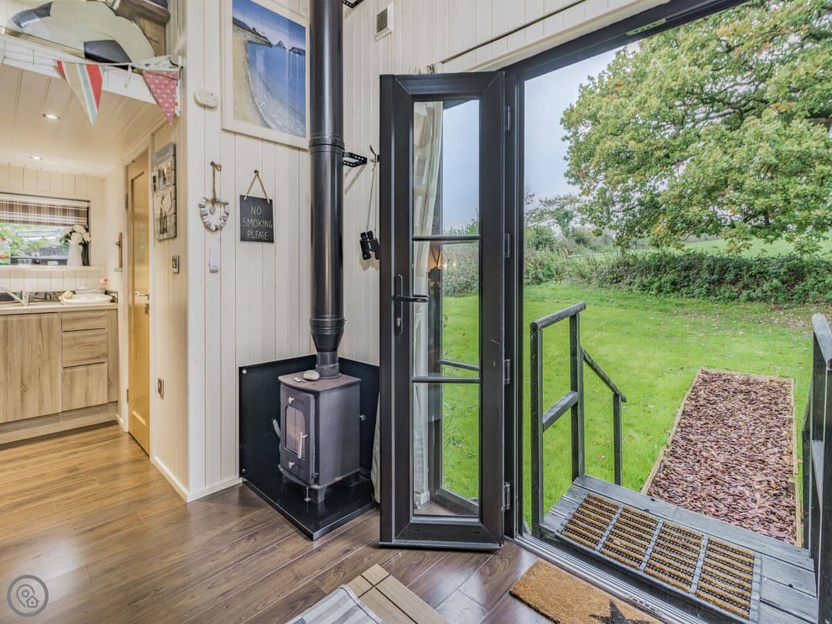 Oak Tree Lodge is a quirky ’one of a kind’ holiday accommodation, nestled away in rural surroundings while still being just a few miles from Dartmouth with its town and nearby beaches. The property sleeps up to four guests in two double bedrooms. This comfortable boutique lodge has a separate upstairs ’cool kids only’ area complete with Xbox and games. The adjoining covered outside area provides extra space and is perfect for al fresco dining; pull up a chair and grab a rug to enjoy an outdoor fire and watch the stars. The downstairs of the lodge benefits from open-plan living space with double bed, sofa seating and cosy wood burner. The kitchen area is fully equipped with all guests could need to rustle up a meal. There is also a door leading from the kitchen area into the shower room with underfloor heating. The spiral staircase leads up to a galleried floor with another double bed and glass balcony, leading across to a separate snug area with TV, games and beanbags for the children to enjoy.