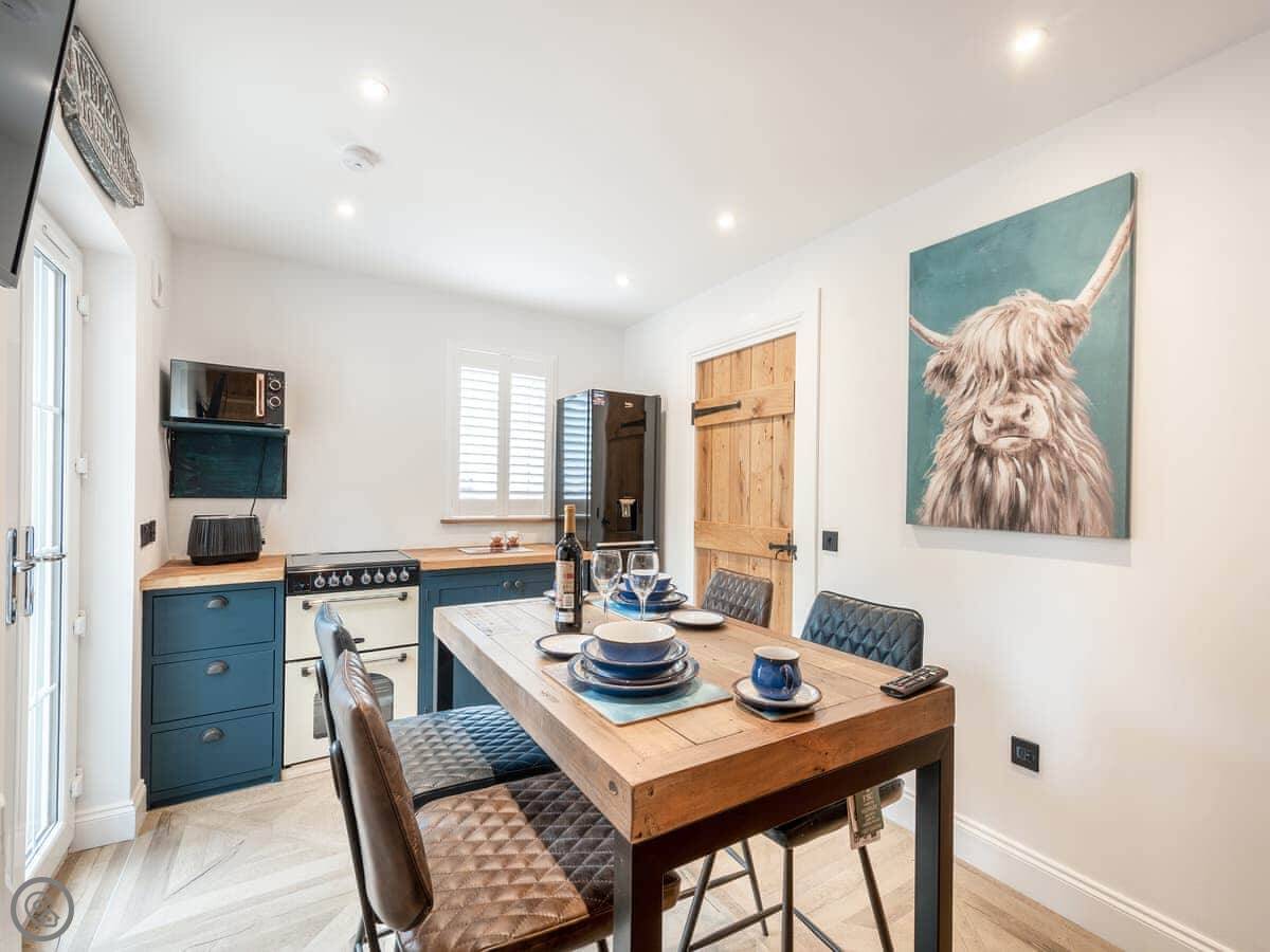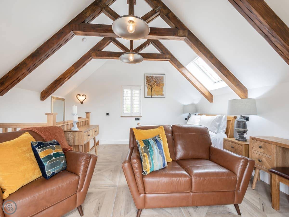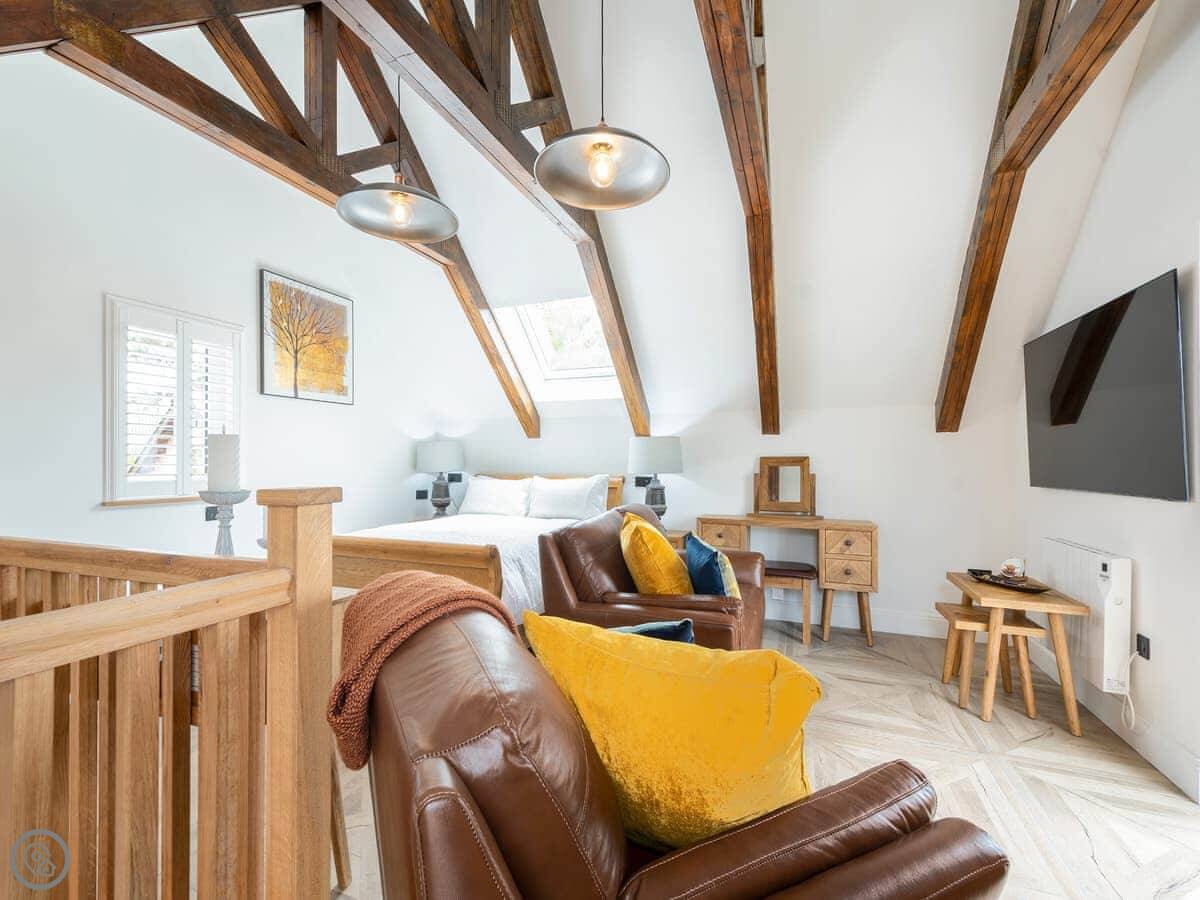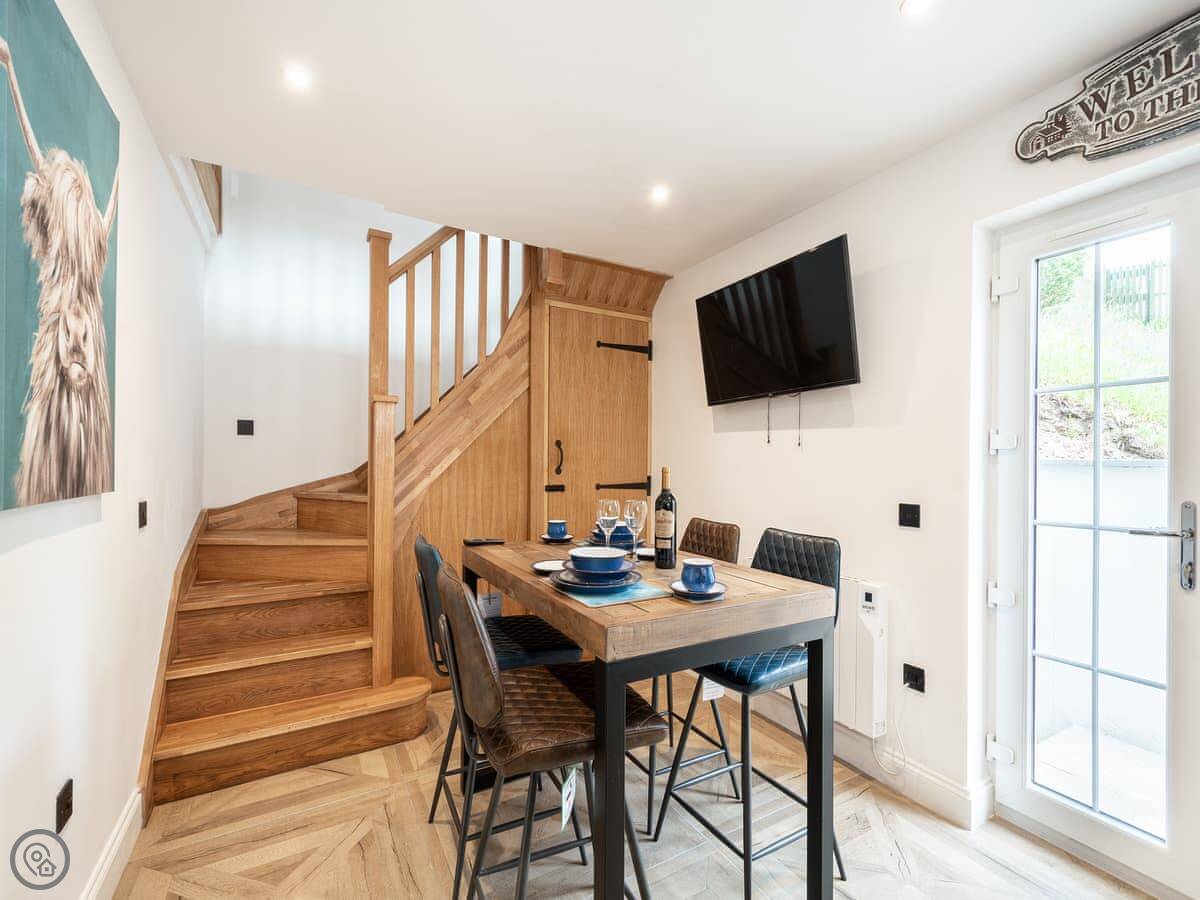 The layout is upside down. You come in on the ground floor to the kitchen and dining area. That's so the living room and bedroom upstairs get the best of the view over the fields opposite. The upstairs living room has French doors that open onto a raised deck.