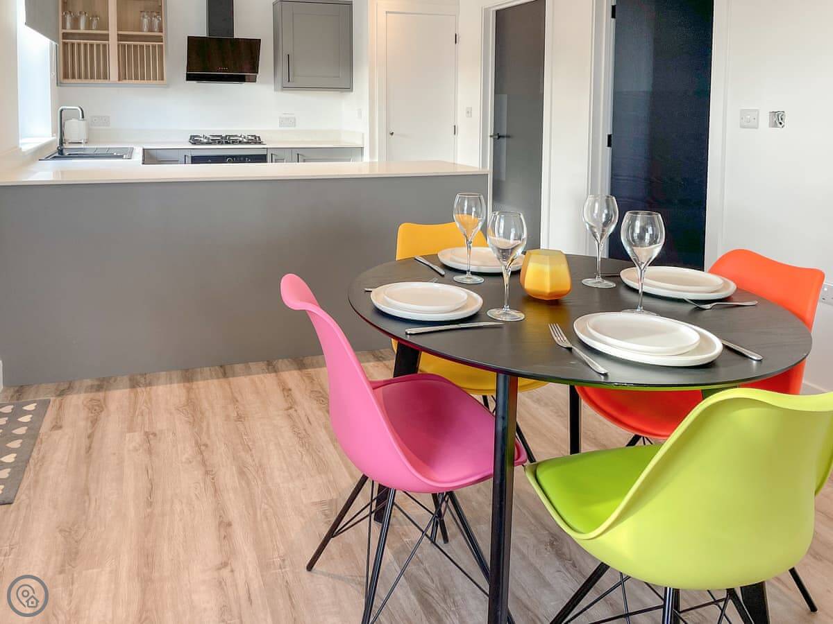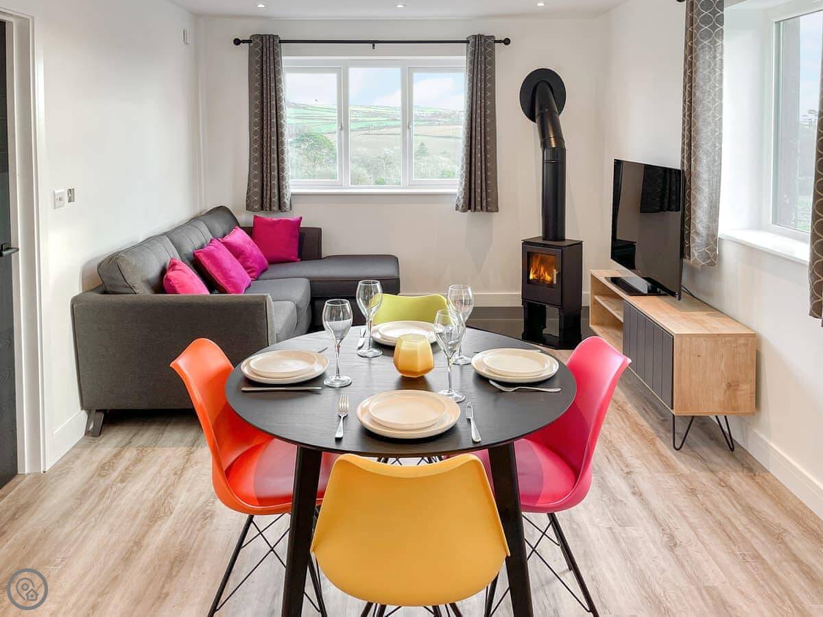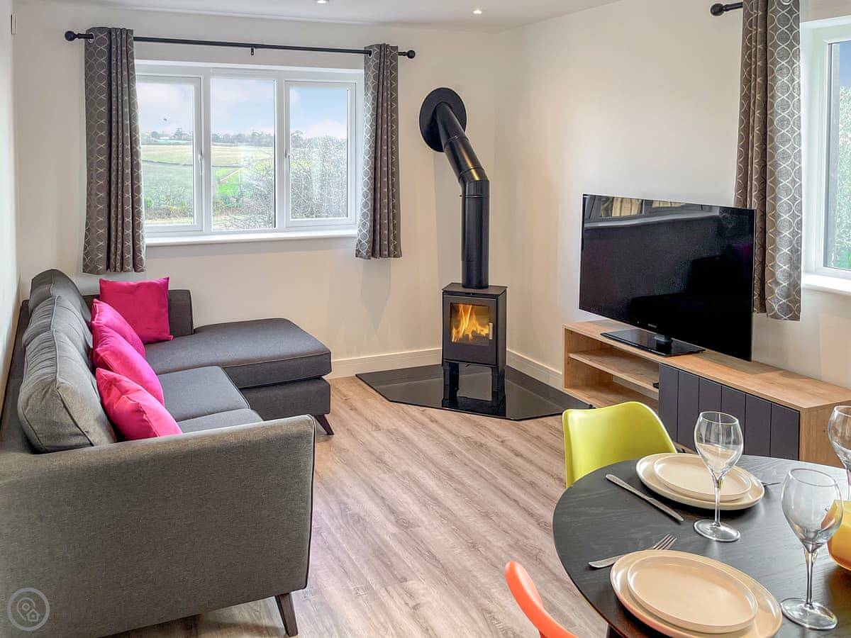 You are surrounded by countryside with large private gardens, great for children and dogs to run around, as well as a patio area for al fresco dining. The open plan living area is a lovely social space to get together. When it gets cold you can huddle around the wood burner or watch something on the TV.