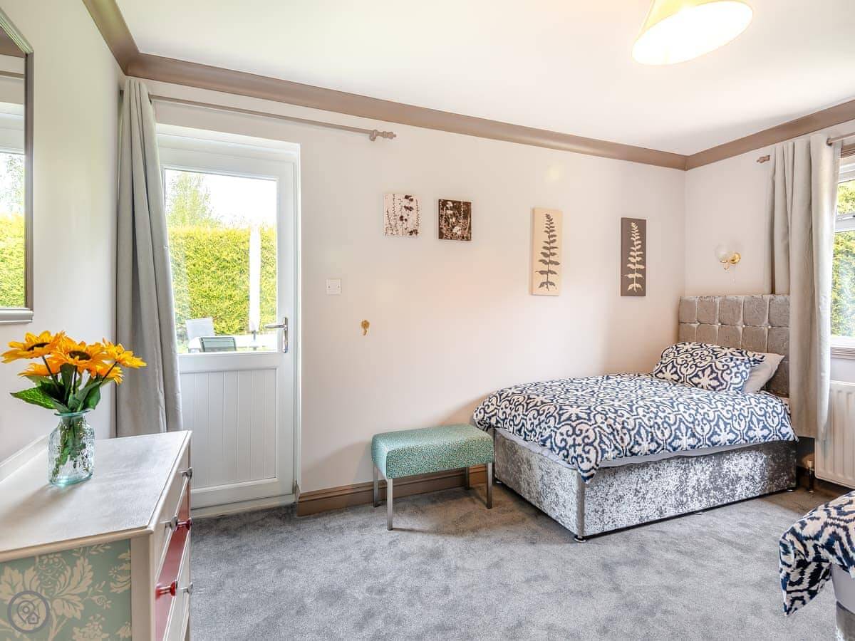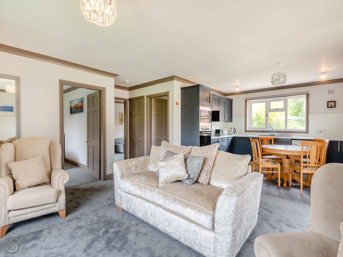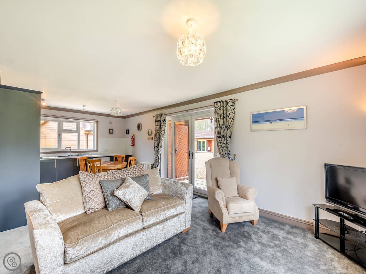 It's a 5 Star lodge, so it's comfortable and everything works. It's open plan inside. Two bedrooms, sleeps four. One bathroom with a shower. Everything's on the ground floor and there's an accessible entrance, so the steps aren't an issue.