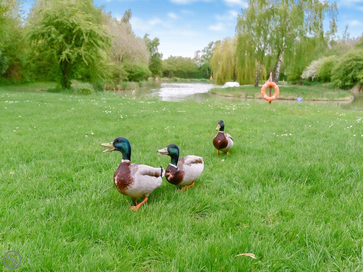 Outside, you've got your own patio area with furniture. It's quiet. The site has three lakes for fishing and it's just for guests staying here. They say there are big catfish in there.