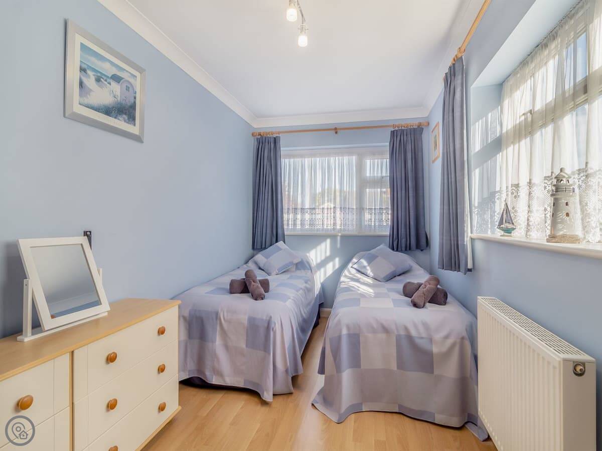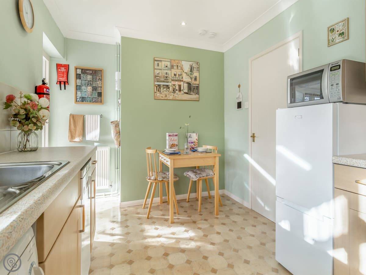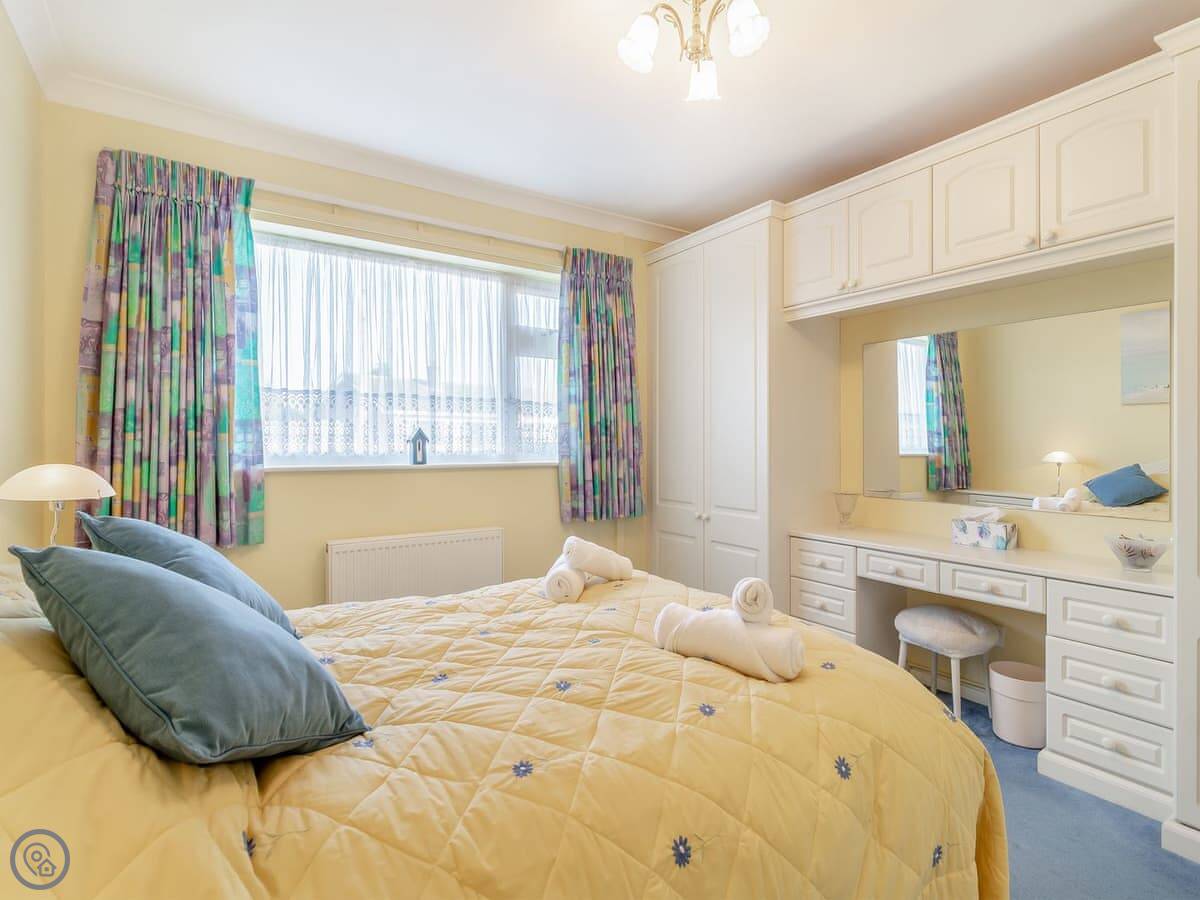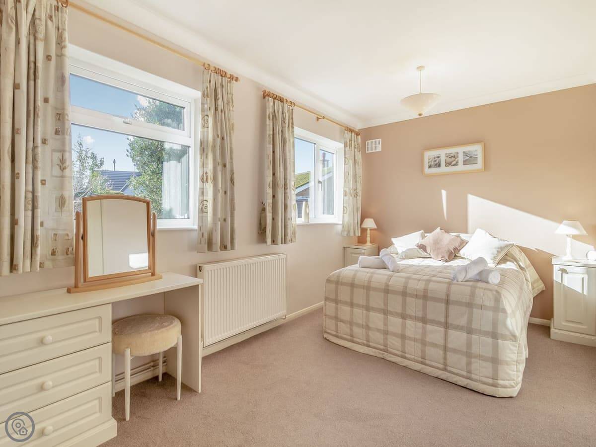 It sleeps six, with three bedrooms and one bathroom. Everything is on the ground floor. The doorways are wide and there's a level entrance, so it's suitable for wheelchairs or if stairs are a problem. It's got a 4 Star rating. It's well equipped and comfortable.