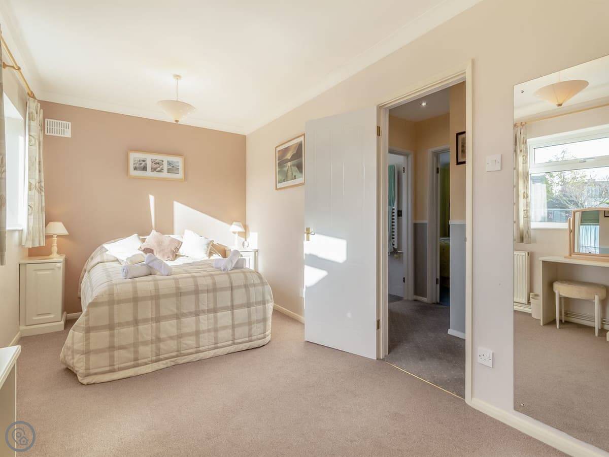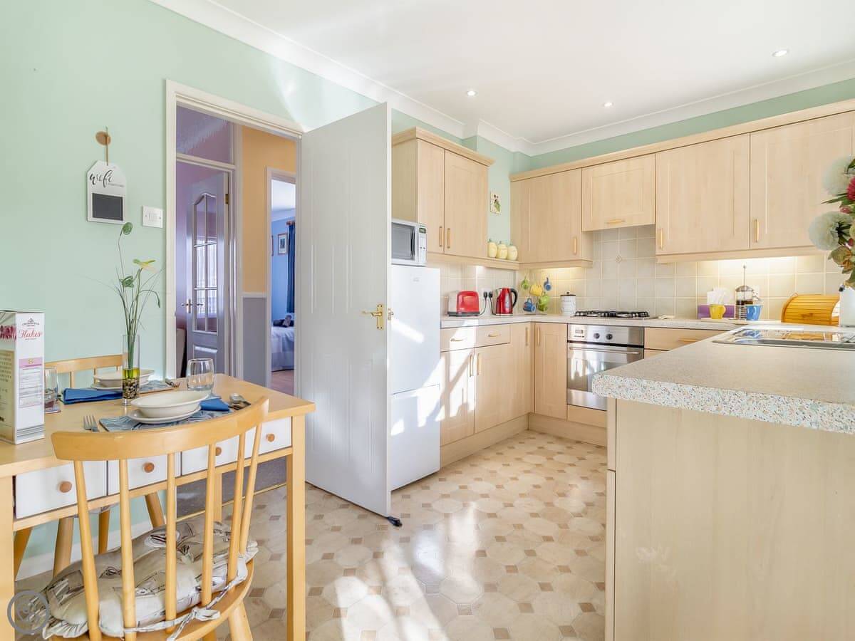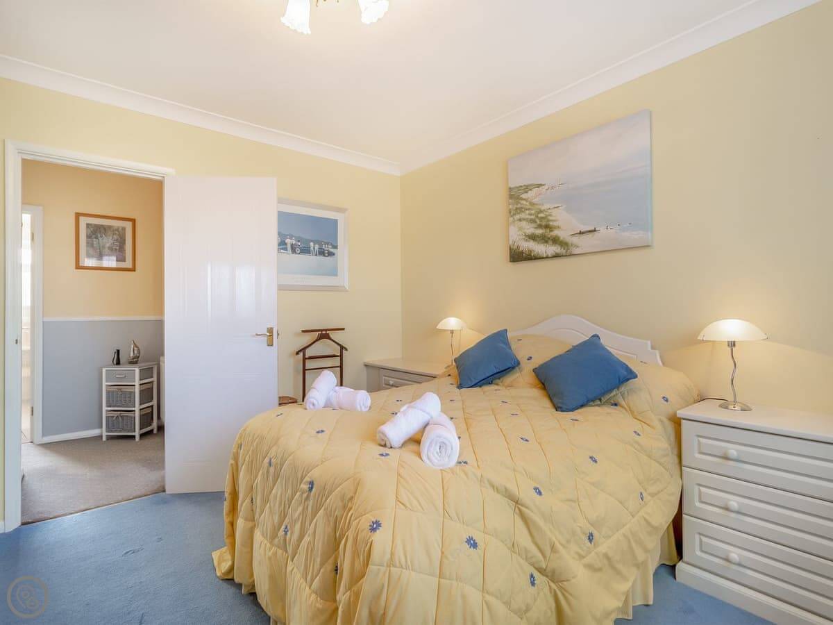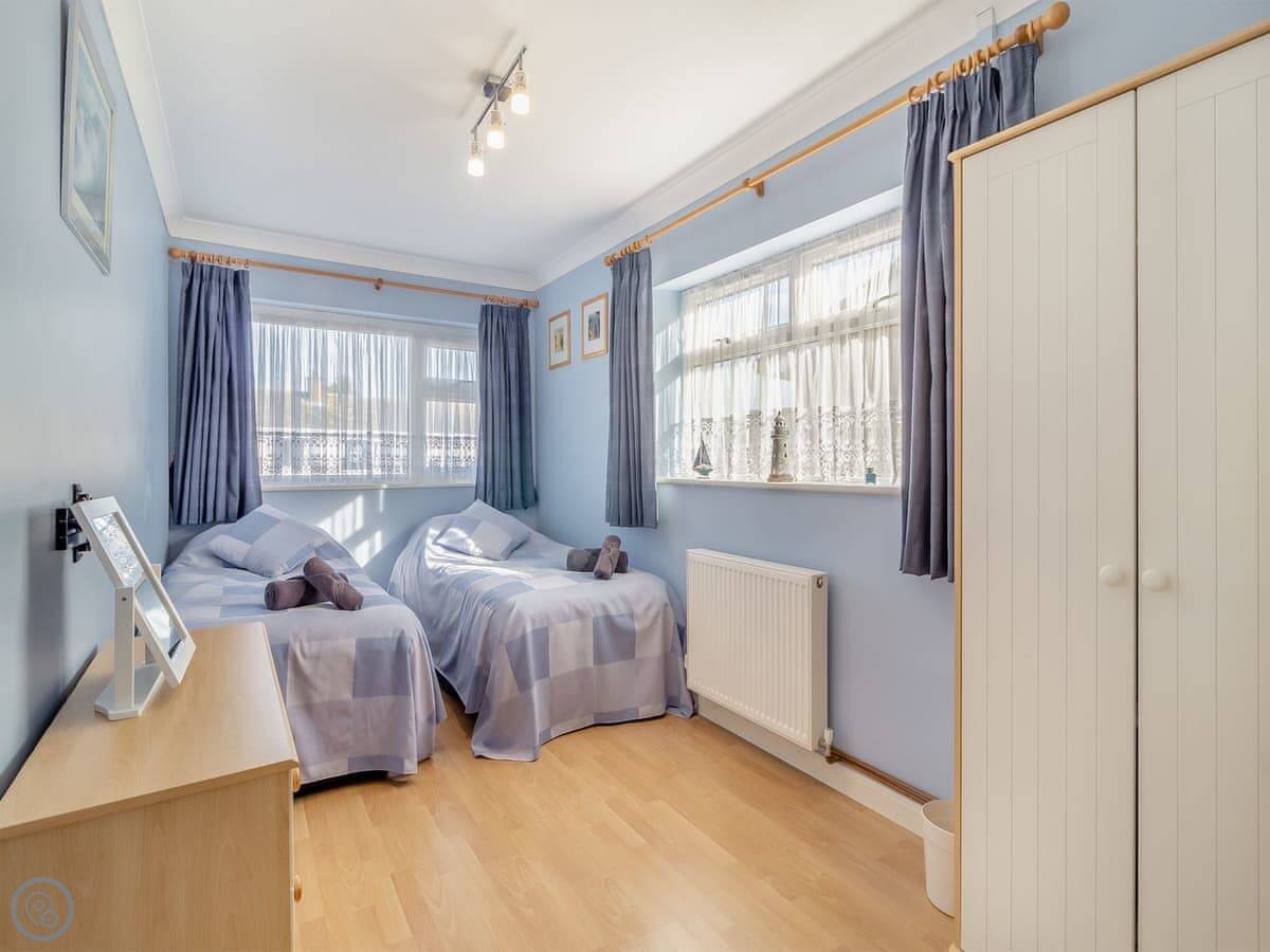 It sleeps six, with three bedrooms and one bathroom. Everything is on the ground floor. The doorways are wide and there's a level entrance, so it's suitable for wheelchairs or if stairs are a problem. It's got a 4 Star rating. It's well equipped and comfortable.