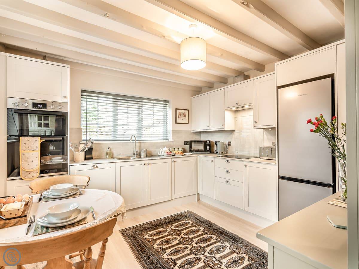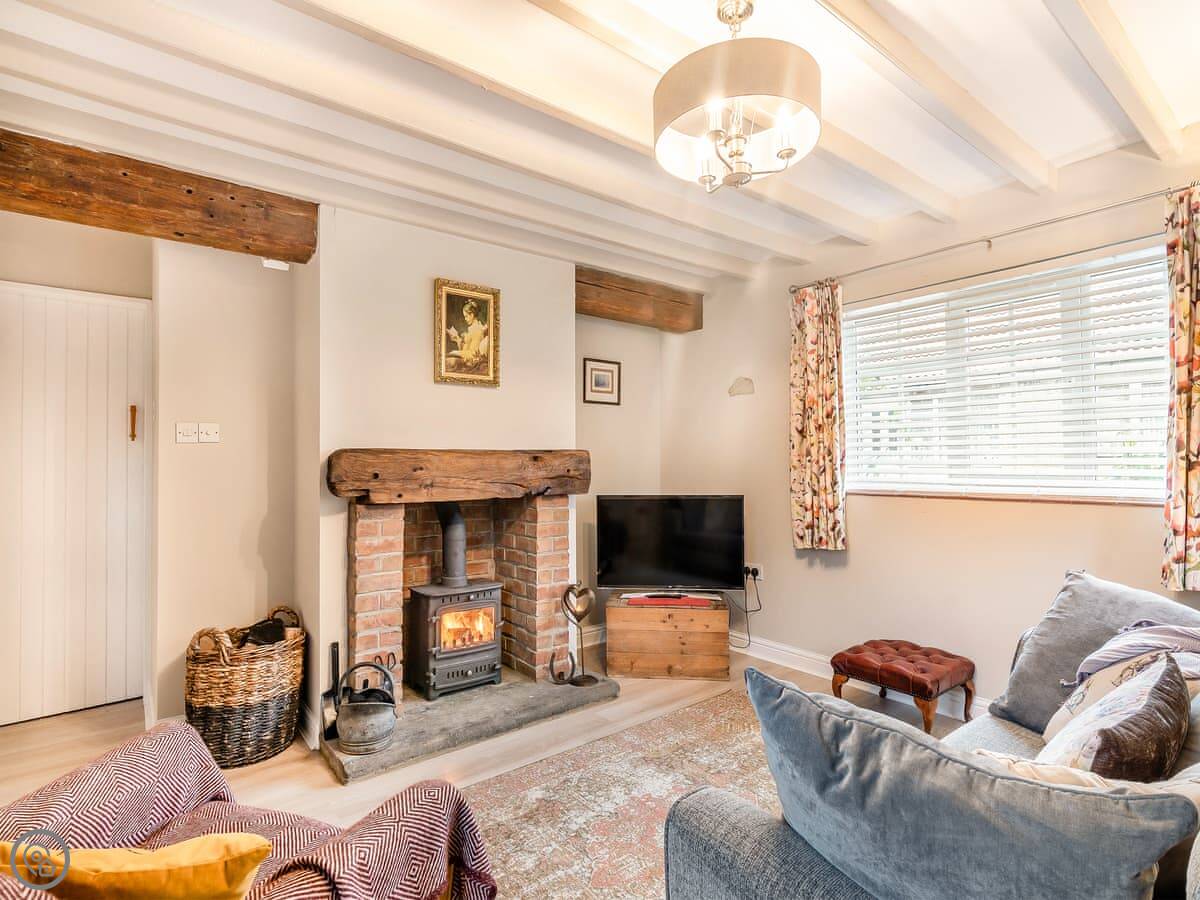The main room is open plan. Kitchen, dining area, and living space. The cottage has beams. There's a wood burner in the living area. WiFi and a TV are included.
