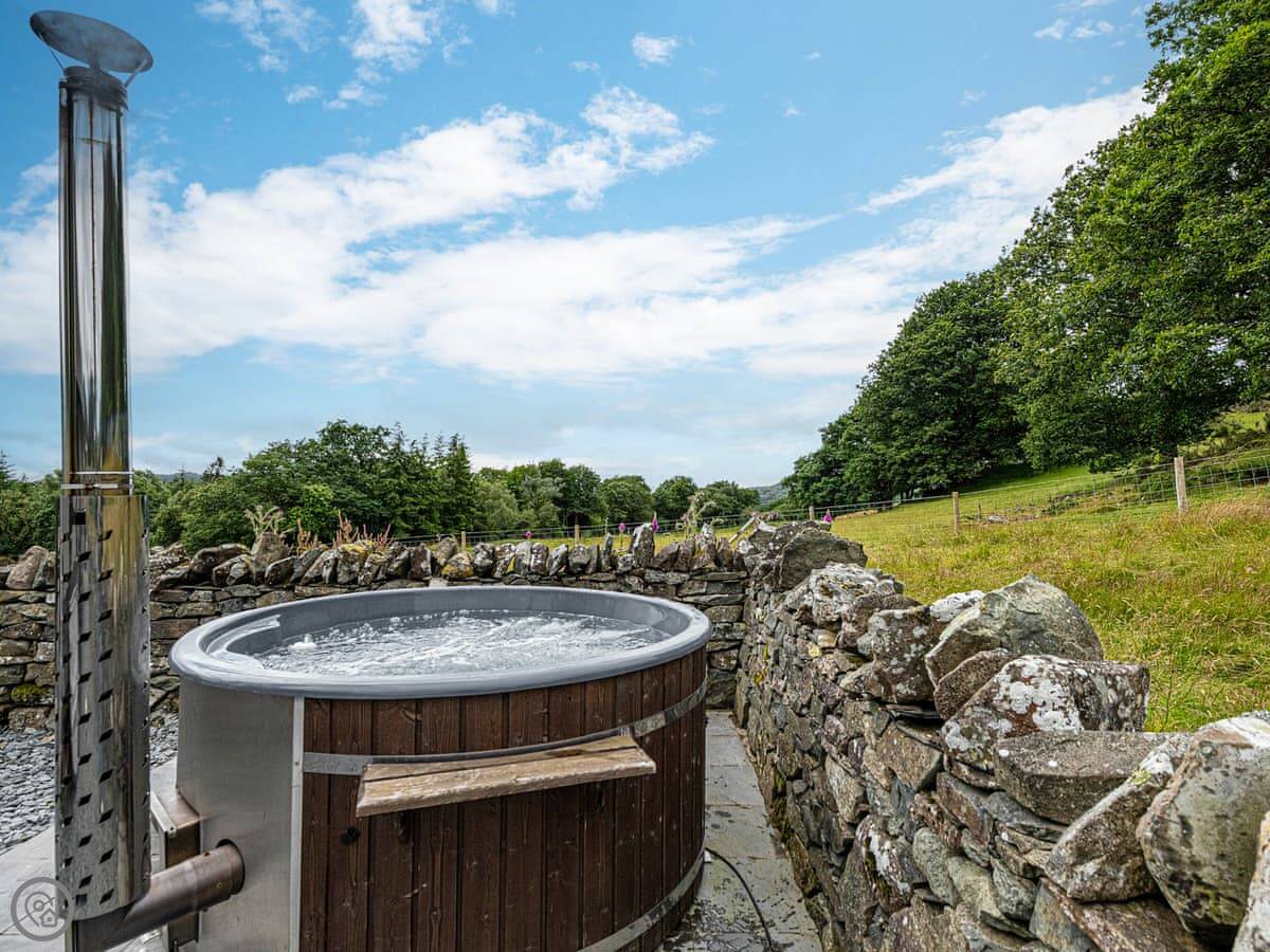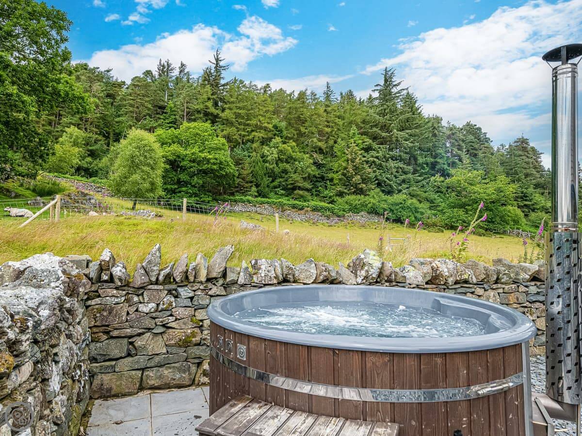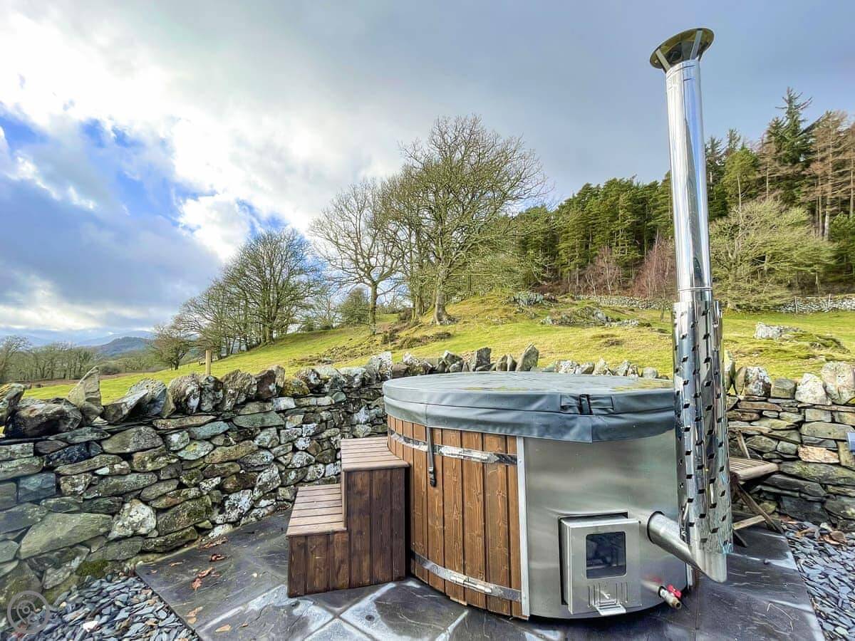 It sleeps six people. Three bedrooms, two bathrooms. It's a 4 Star place. We had it completely renovated in 2022 so the kitchen and bathrooms are modern, but it's still an old cottage so you get the stone walls and beams. The wood-fired hot tub is out in the garden.