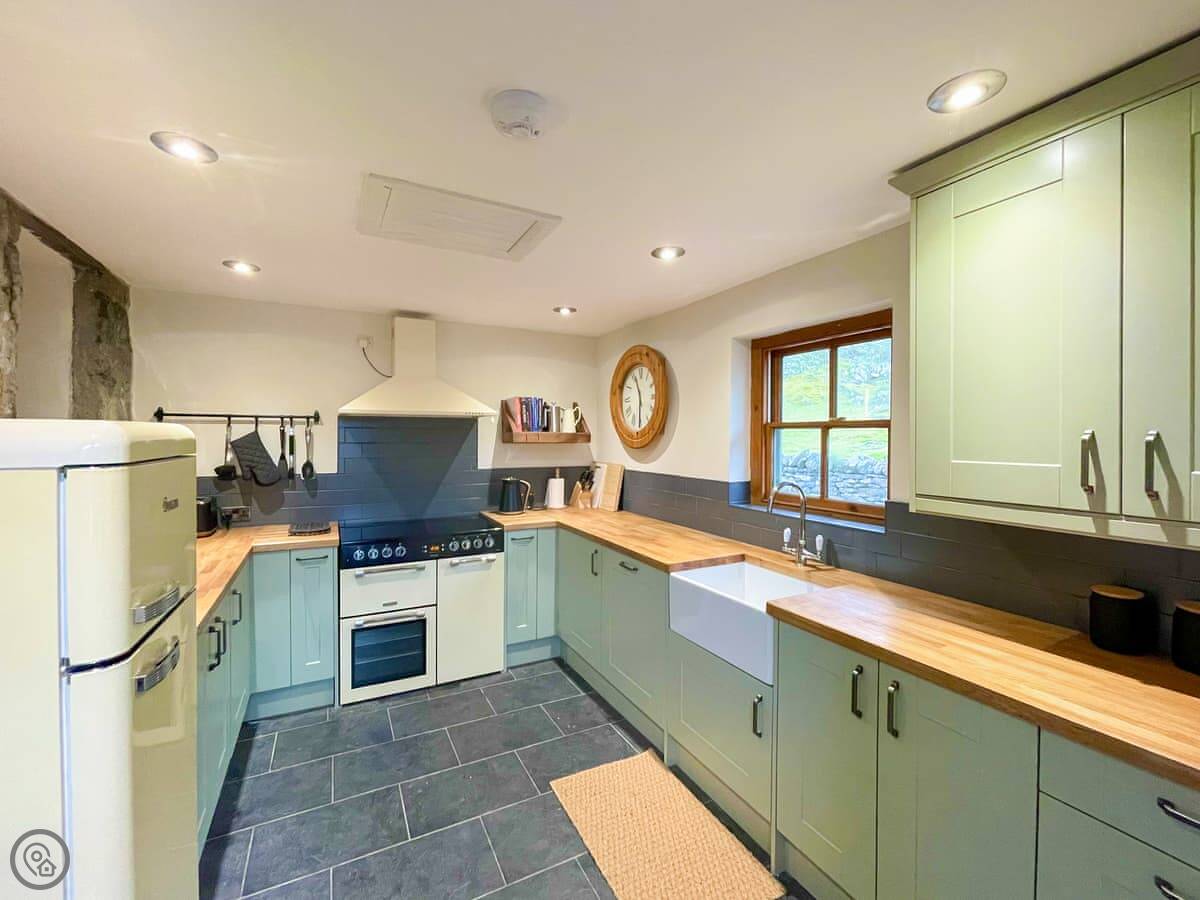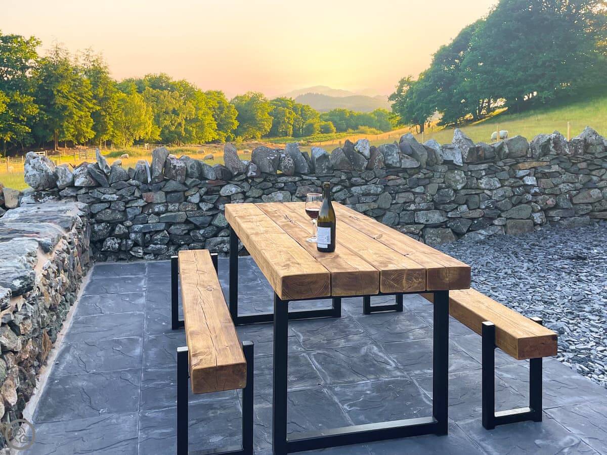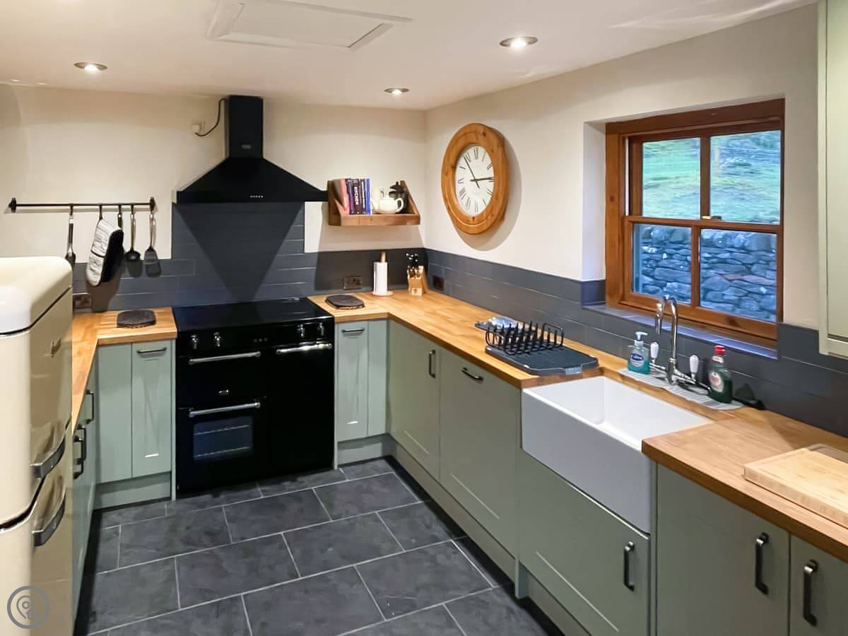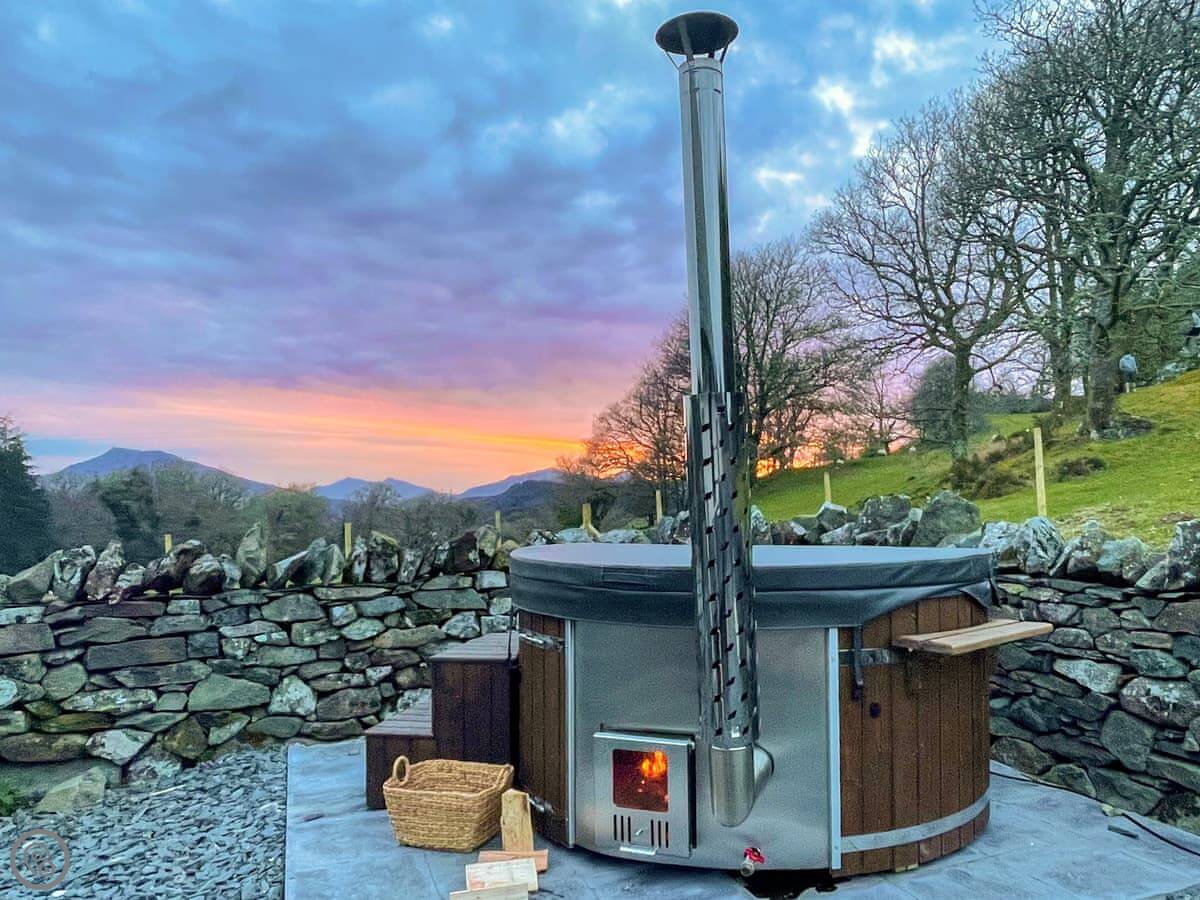 It sleeps six people. Three bedrooms, two bathrooms. It's a 4 Star place. We had it completely renovated in 2022 so the kitchen and bathrooms are modern, but it's still an old cottage so you get the stone walls and beams. The wood-fired hot tub is out in the garden.